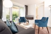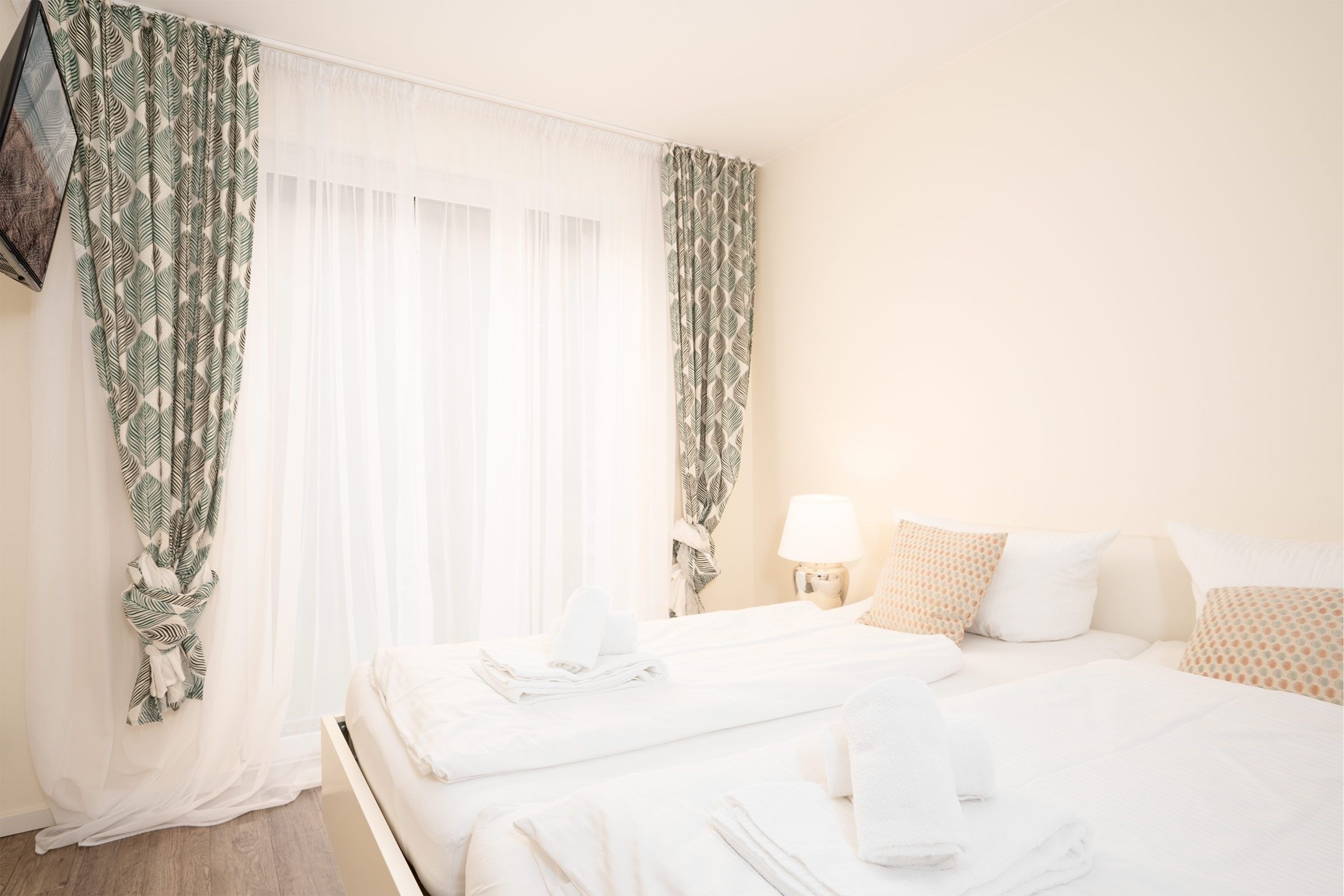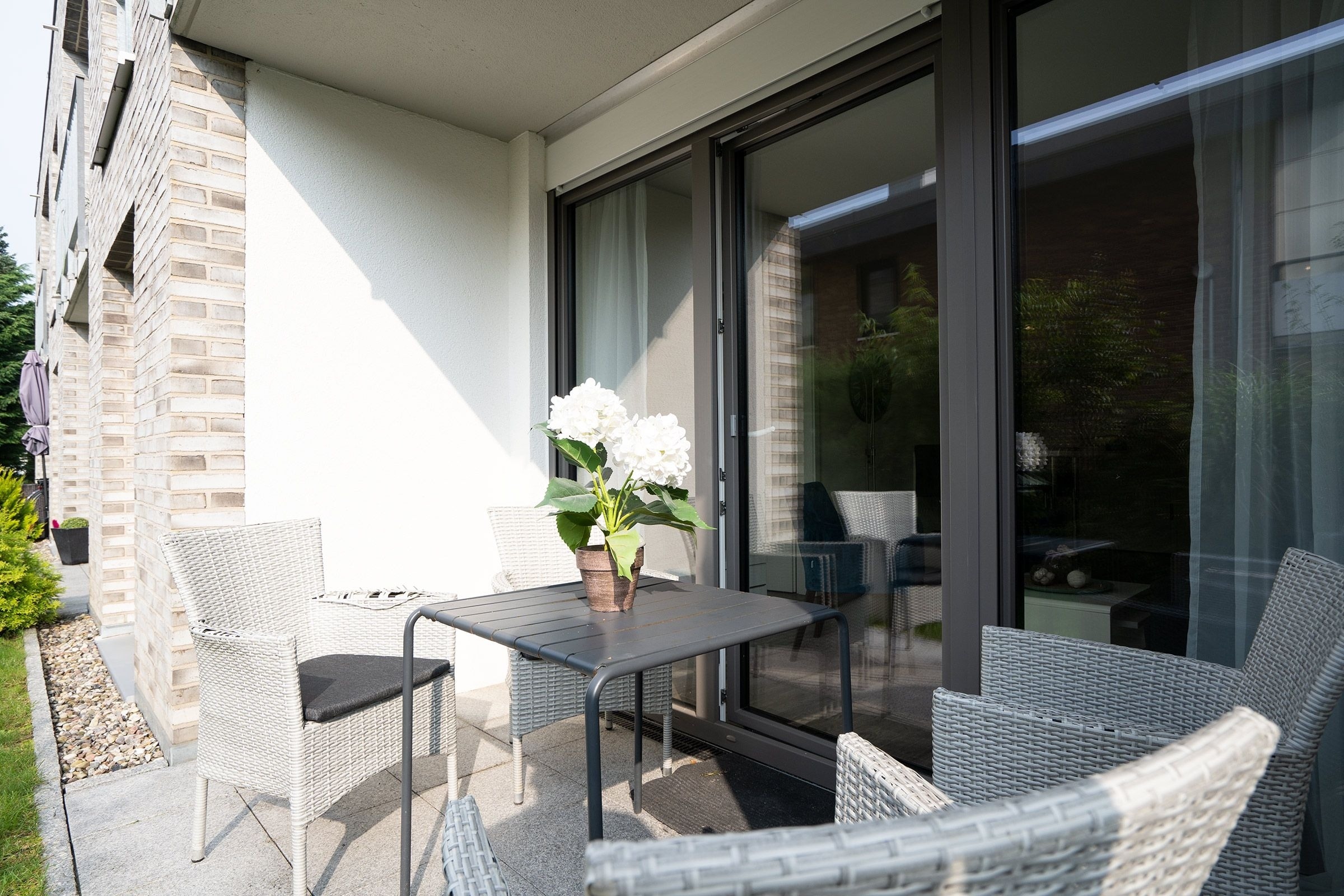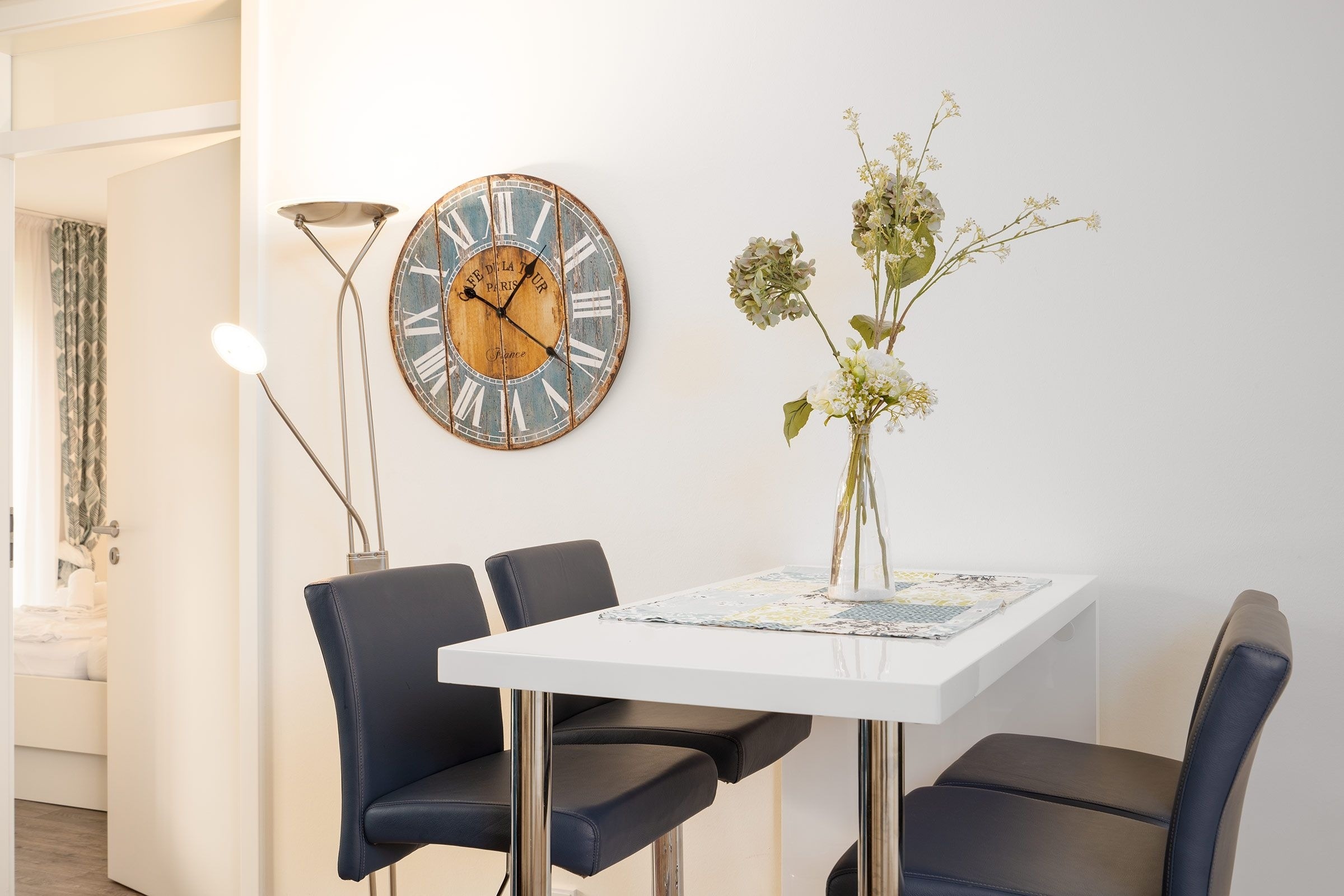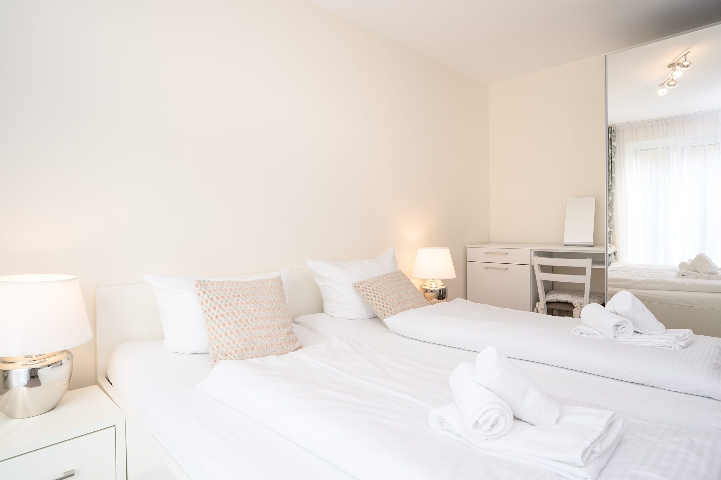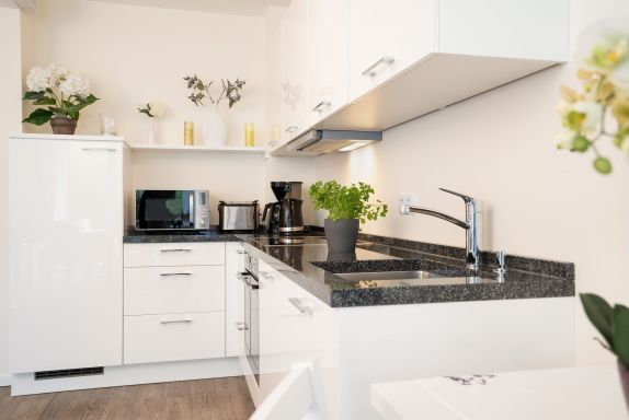 Vom kleinen Flurbereich der Wohnung gelangen Sie in das schöne Bad mit seiner ebenerdigen großzügigen Dusche. Ein Fön und eine Personenwaage gehören neben einer Handtuchheizung und einem Regal für Ihre Badutensilien zur Ausstattung. Neben modernster Ausstattung überzeugt das Appartement durch eine Südwest-Terrasse. Hier können Sie Ihren Urlaubstag mit einem gemütlichen Frühstück starten. Der funktionell eingerichtete Wohn-Essbereich mit offener Küchenzeile besticht durch klare Linien. In Ihrer rundum ausgestatteten Küche finden Sie alle notwendigen Alltagshelfer für gelungene Kochabende. Der Wohnbereich ist mit einem Schlafsofa mit Faltbettfunktion (190x140cm) ausgestattet, der Raum kann durch Außenjalousien abgedunkelt werden. Hier kann man es sich am Abend vor dem Flat-Screen-TV gemütlich machen. Das modern eingerichtete Schlafzimmer erreichen Sie vom Wohnzimmer. Ein Doppelbett (2x 90x200 cm) verspricht erholsamen Schlaf nach einem erlebnisreichen Urlaubstag. Ihre Urlaubsgarderobe kann im leichtgängigen Schwebetürenschrank verstaut werden. Zur weiteren Ausstattung gehört ein Samsung Flat-Screen-TV und ein kleiner Schminktisch mit Spiegel. Die wohlverdiente Nachtruhe können Sie auch hier mit elektrischen Außenjalousien unterstützen. W-LAN steht kostenfrei zur Verfügung