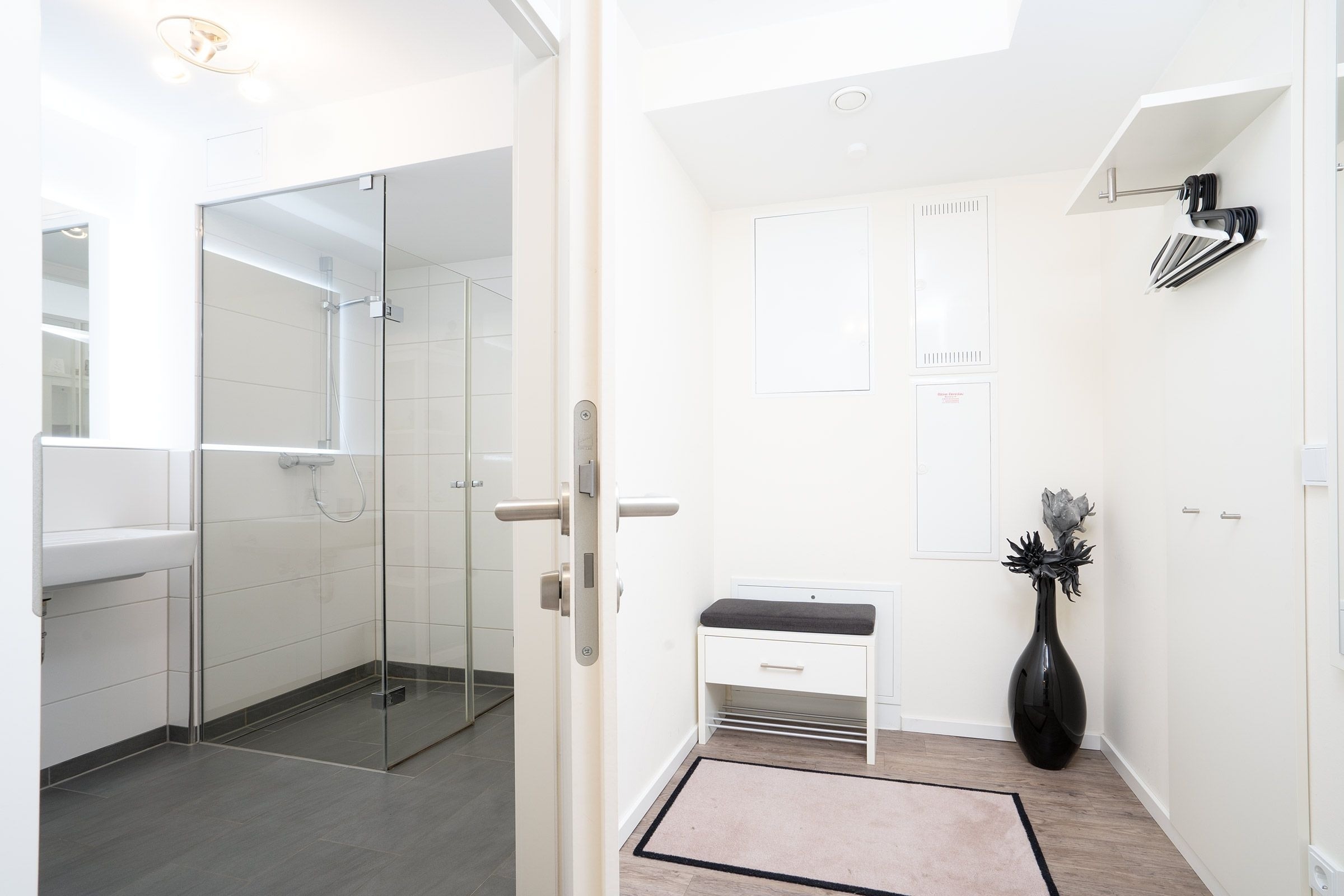 Sie betreten das Haus Seaside über einen barrierearmen Hauseingang oder über die Tiefgarage. Von dort gelangen Sie mit dem Fahrstuhl über einen großzügig bemessenen Flur in die Ferienwohnung (ca. 46 qm), welche genügend Platz für max. 2 Erwachsene und 2 Kinder bietet.