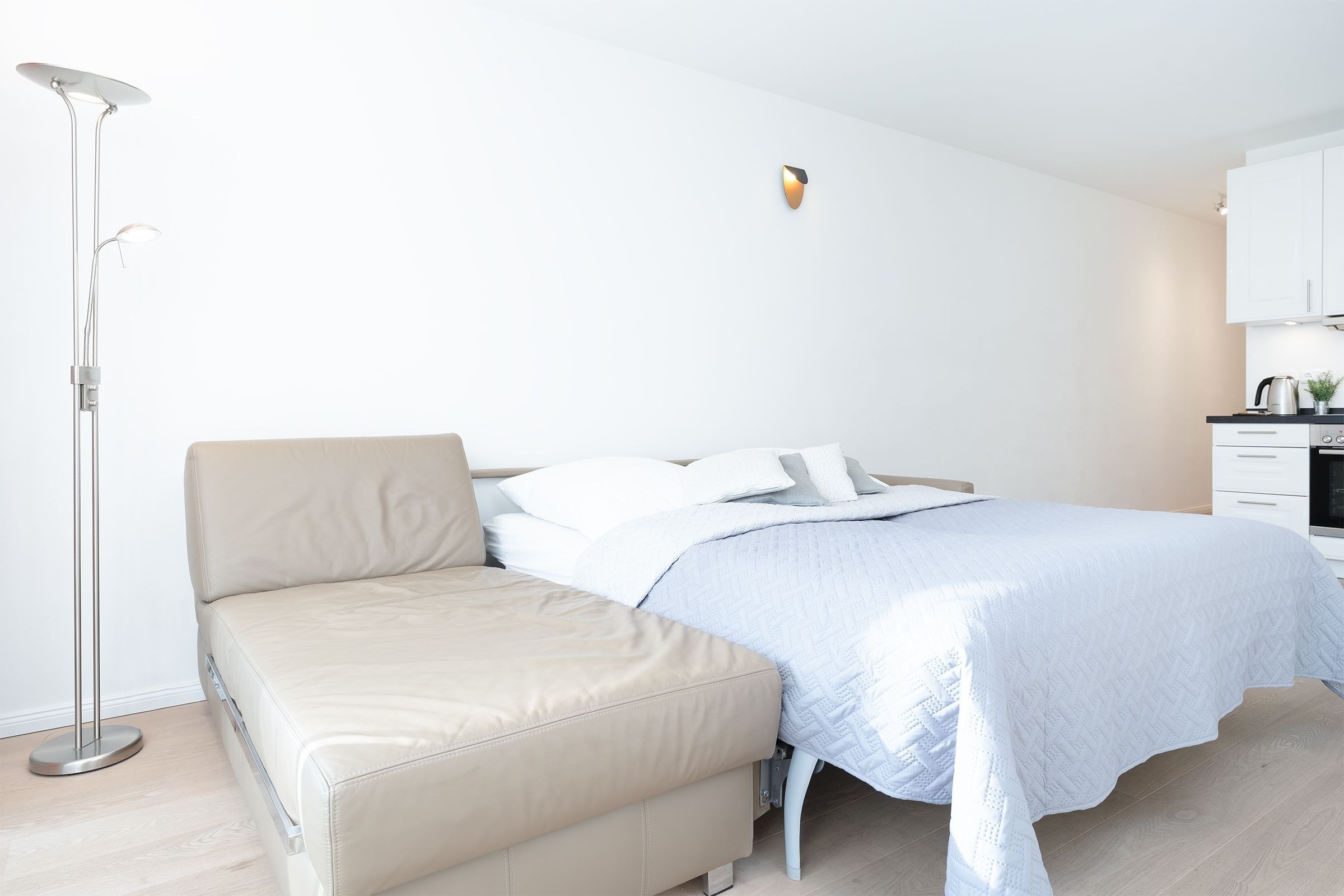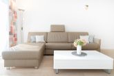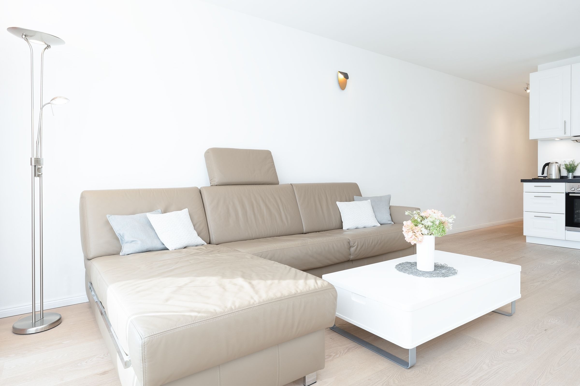 Jacken aufgehängt, Schuhe ausgezogen und erst mal Ihre Urlaubskoffer zum Schlafzimmer durch das Wohnzimmer mit offener Küche getragen. In aller Ruhe können Sie nun auspacken! Ausreichend Platz ist im großen beleuchteten Schiebetürenschrank mit Spiegel für Ihre Urlaubsgarderobe. Das Boxspringbett (2x90x200cm) ist fantastisch bequem, freuen Sie sich schon jetzt auf eine erholsame Nachtruhe. Ein Kinderreisebett kann hier mühelos aufgestellt werden. Gönnen Sie sich jetzt einen frisch gebrühten Kaffee. Die moderne Küche ist mit allem ausgestattet was Sie sich wünschen, ein Esstisch gleich daneben. Nehmen Sie Platz auf dem komfortablen Eckledersofa und genießen Sie Ihren Kaffee oder natürlich bei herrlichem Wetter gerne auf der überdachten Terrasse. Über erste Ausflugstipps können Sie sich online informieren, kostenfreies W-Lan ist selbstverständlich inklusive. Das Eckledersofa lässt sich am Abend zu einer bequemen Schlafgelegenheit (160x200 cm) für 2 Personen verwandeln. Schnell noch etwas erfrischen. Ein Duschbad mit ebenerdiger Dusche, WC, Handtuchwärmer und Föhn und ein Gäste WC rundet das Gesamtbild der Ferienwohnung ab. Praktisch - für die Wäsche zwischendurch steht Ihnen hier eine Waschmaschine mit integriertem Trockner zu Verfügung.