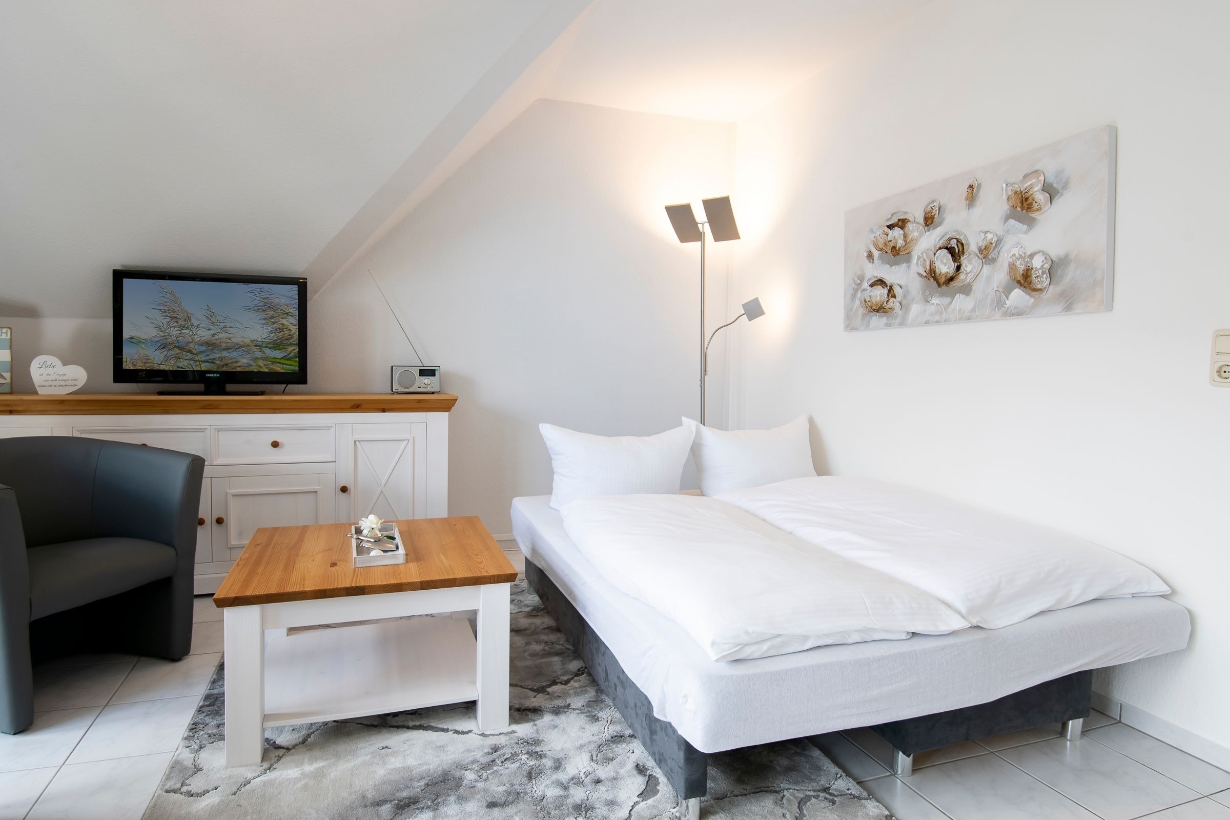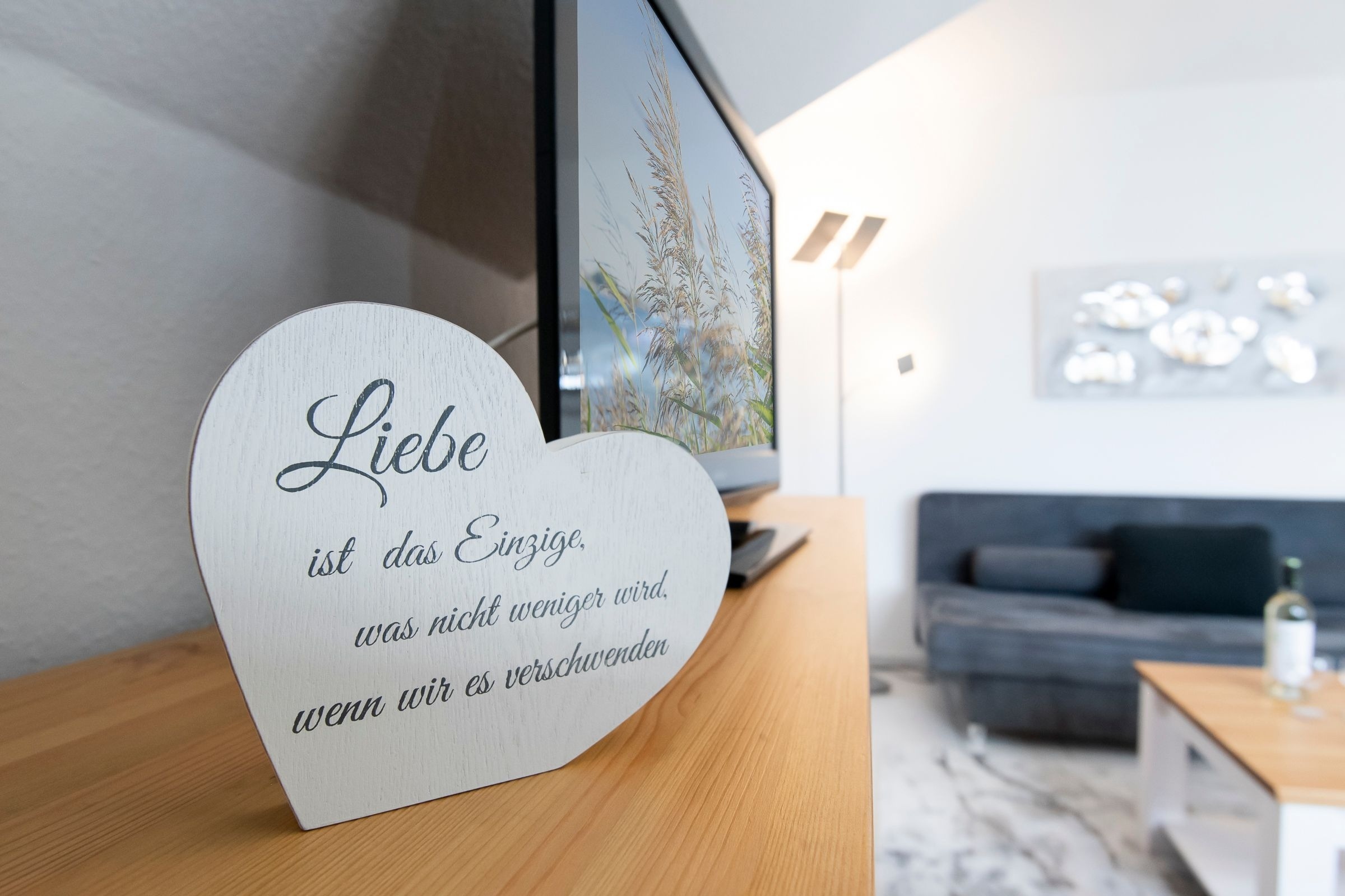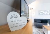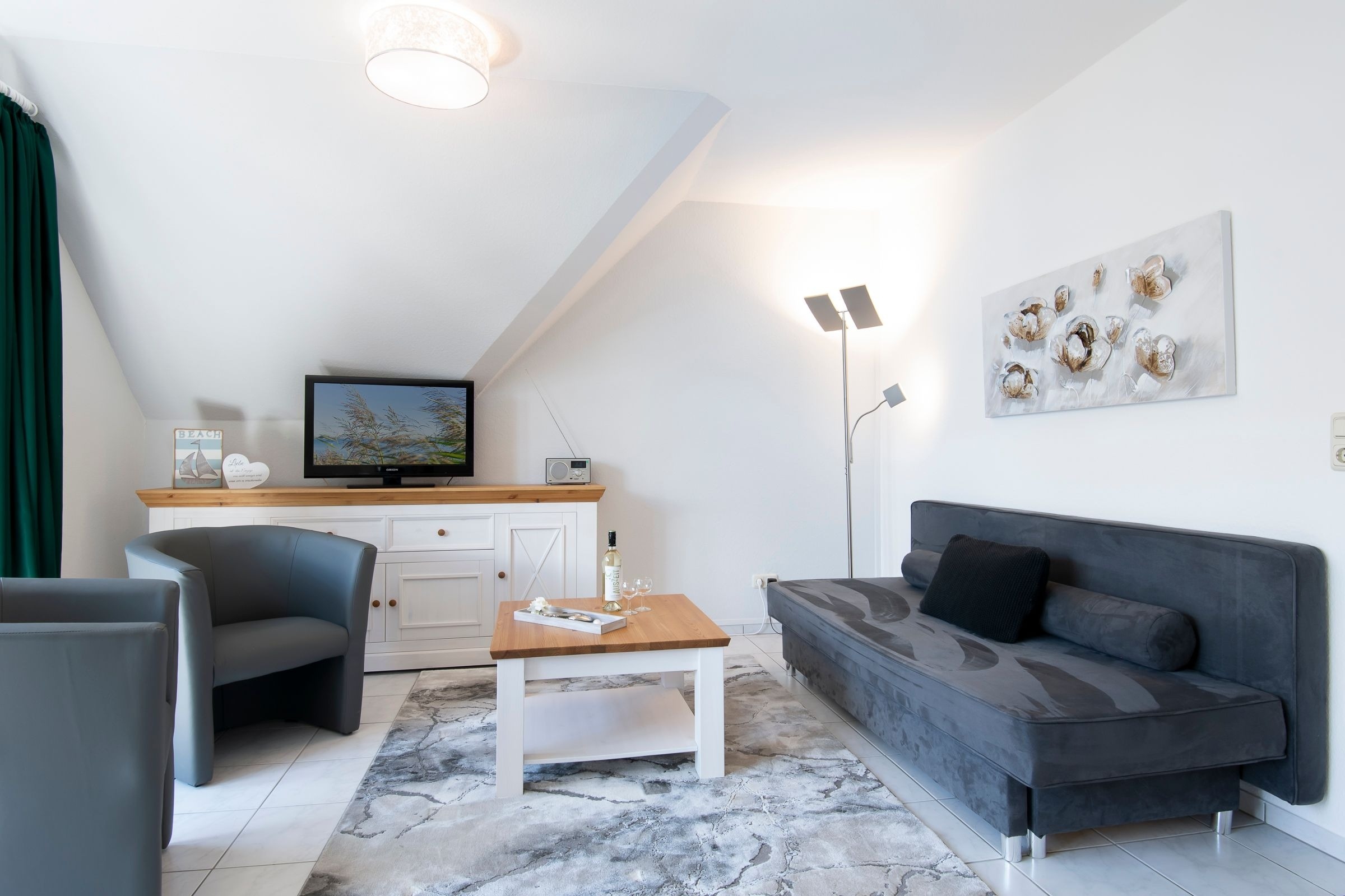 Auf 2 Zimmer verteilen sich hier das Schlafzimmer mit einem Doppelbett und das helle Wohnzimmer im Landhausstil mit gemütlicher Schlafcouch, angrenzender offener Küche und Essbereich. Für Unterhaltung sorgen ein TV und ein CD-Player. Vom Wohnzimmer haben Sie Zugang zum möblierten Balkon mit Süd-Ausrichtung. Starten Sie hier doch direkt Ihren Tag mit frischen Brötchen und heißem Kaffee. Die Küche ist voll ausgestattet mit Backofen, Gefrierfach, Herd, Kaffeemaschine, Kühlschrank, Mikrowelle, Spülmaschine, Toaster und Wasserkocher. Das moderne Bad mit Dusche und Föhn rundet diese Ferienwohnung ab.