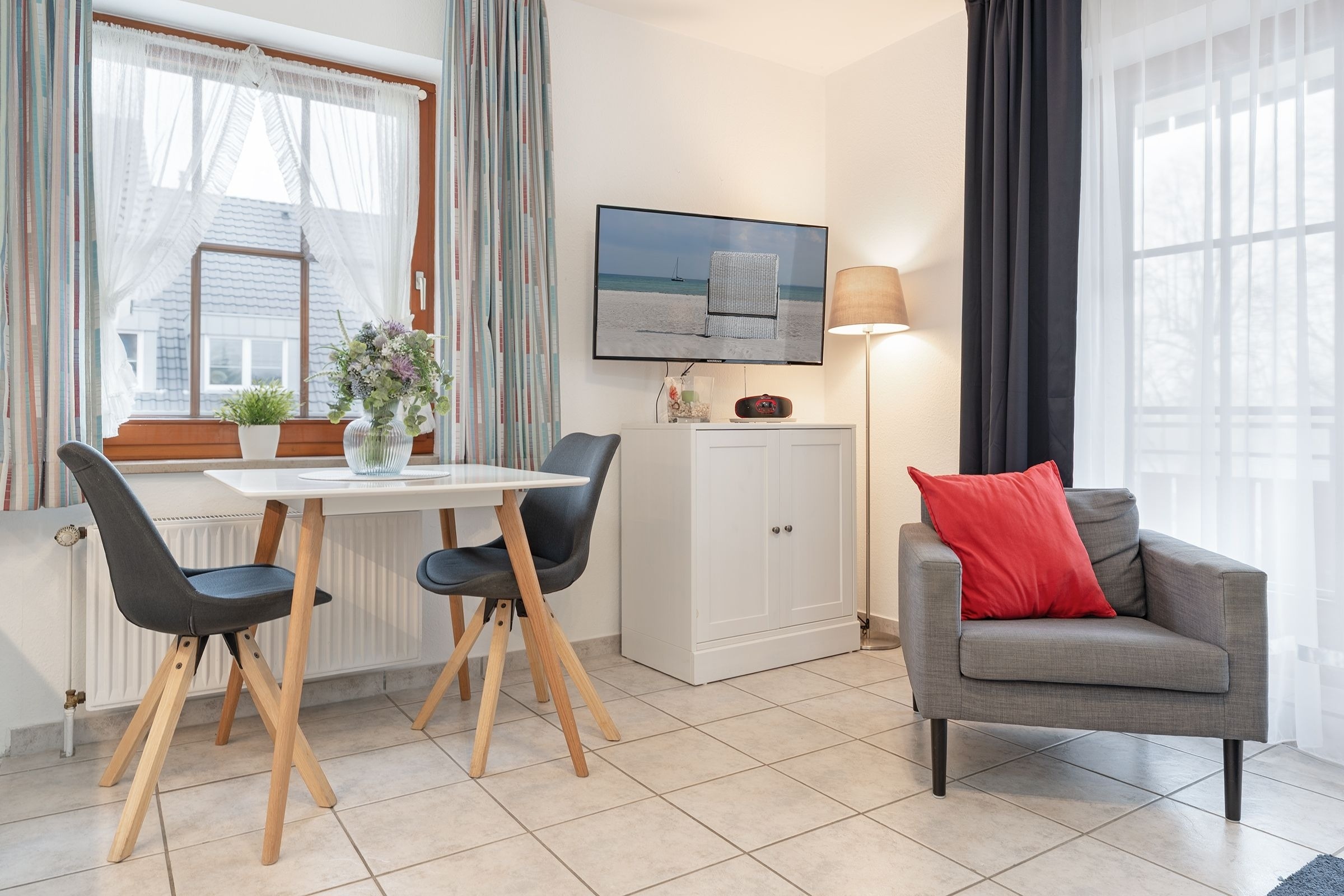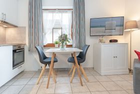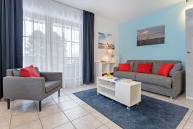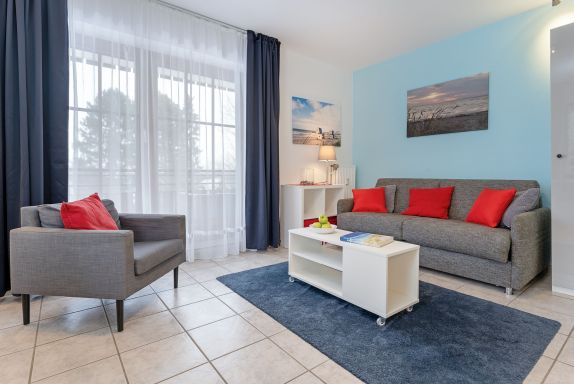 In Ihrem Urlaubsdomizil erwartet Sie ein ansprechender Wohn-/Schlafraum, der mit einem Essplatz und einer integrierter Küchenzeile ausgestattet ist. Zur Nacht lässt sich die Couch ganz einfach in einen bequemen Schlafbereich (140x200 cm) für 2 Personen verwandeln. Von hier aus gelangen Sie auch auf den großzügigen Balkon, der zu entspannten Stunden an der frischen Luft einlädt. Die morgendliche Dusche können Sie im modernen Tageslichtbad ausgiebig genießen. Zum Strand sind es ca. 5 Gehminuten.