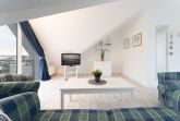 Auf der unteren Etage (1. Etage) befindet sich die großzügige Wohnküche mit einer Schlafcouch für 2 Personen und dem Essplatz. Die moderne Küchenzeile ist ausgestattet mit: Induktionsherd (4 Kochplatten), Kühlschrank mit Gefrierfach, Mikrowelle, Geschirrspülmaschine, Wasserkocher, Kaffeemaschine und Toaster. Das Dachgeschoss ist mit Laminat ausgelegt und verfügt über: Schlafraum mit 2 Einzelbetten (je 90x200 cm), Duschbad mit Fön und Wohnraum mit TV-Gerät, Radio/CD-Player und einer weiteren Schlafcouch für 2 Personen. Vom Balkon hat man Meerblick.