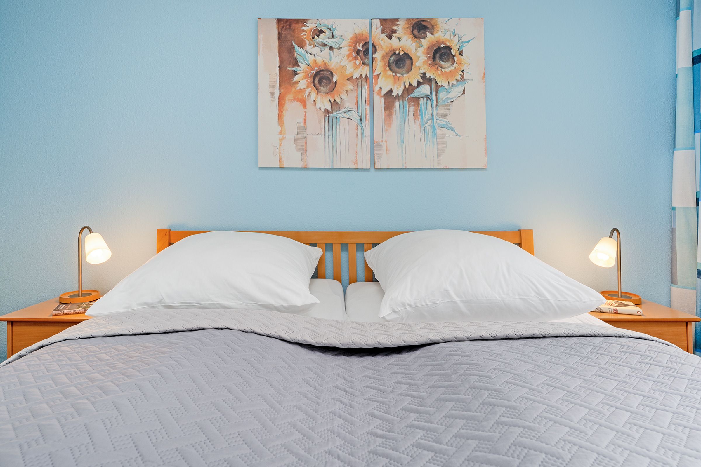Damit Sie auch im Urlaub immer auf dem Laufenden bleiben, steht ein WLAN-Anschluss zur kostenlosen Nutzung bereit, Kabel-TV und DVD-Gerät bieten zusätzliche Unterhaltung. Im separaten Schlafzimmer mit hochwertigem Doppelbett (180x200 cm) schlafen Sie so prima wie zuhause. Das zweite Schlafzimmer ist mit gemütlichem Etagenbett (2x 90x200 cm) möbliert. Machen Sie es sich abends auf dem Sofa bequem, hier entsteht bei Bedarf ein weiterer Schlafplatz (140x180 cm). Ihre Urlaubstage können Sie entspannt auf Ihren zwei möblierten Balkonen mit Blick ins Grüne ausklingen lassen. Pure Idylle! Die moderne Küchenzeile ist in den Wohnraum integriert und erfreut im Urlaub mit Alltagshelfern wie Backofen und Spülmaschine. Genießen Sie die erste Tasse Kaffee am modernen Esstisch. Das kleine, aber feine Badezimmer ist weiß gefliest und sorgt mit Eckdusche (Einstiegshöhe: 30 cm), Fön und beleuchtetem Spiegel für gute Laune.