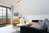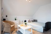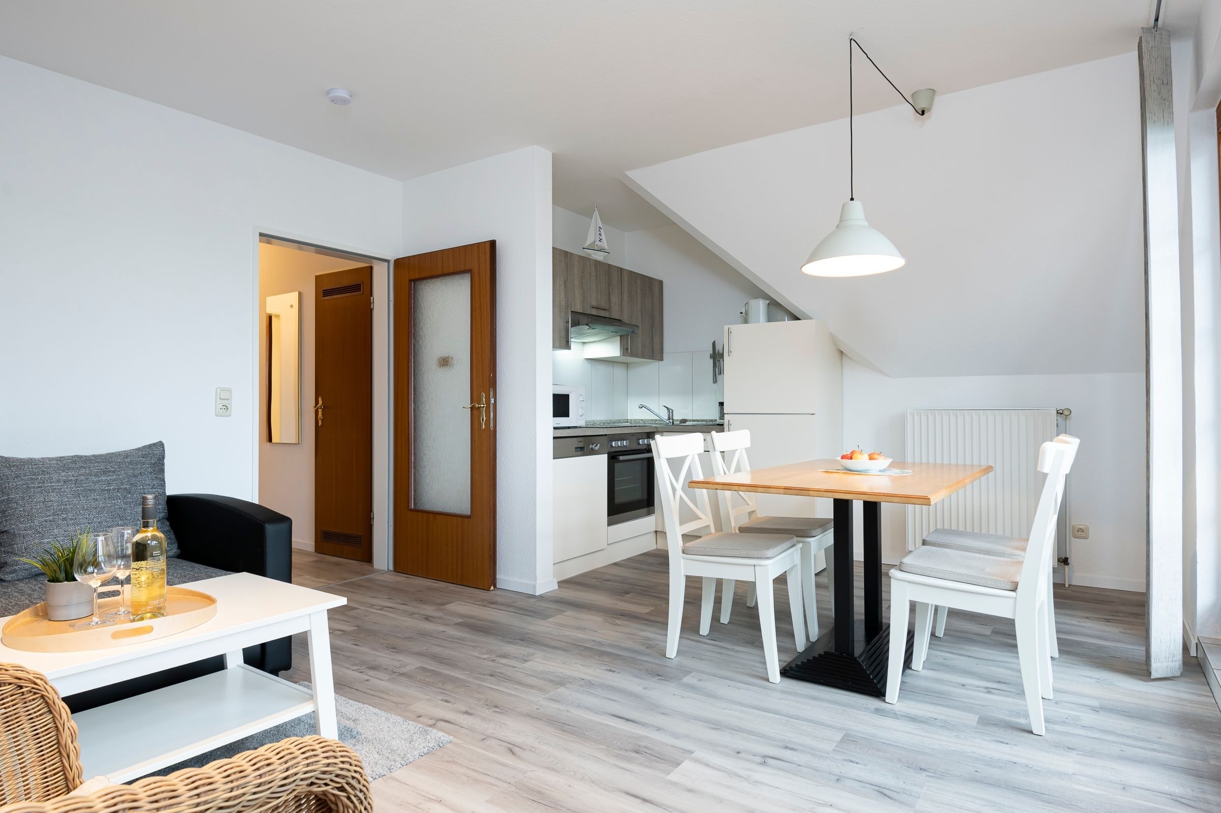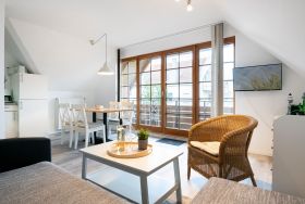 Auf zwei Zimmer verteilen sich hier das Schlafzimmer mit einem Doppelbett (2x 90x200 cm) und TV sowie das helle Wohnzimmer im Landhausstil mit gemütlicher Schlafcouch (140x190 cm), angrenzender offener Küche und Essbereich. Für Unterhaltung sorgen ein TV und ein CD-Player. Vom Wohnzimmer haben Sie Zugang zum möblierten Balkon. Starten Sie hier direkt Ihren Tag mit frischen Brötchen und heißem Kaffee. Die Küche ist z. B. mit Backofen, Gefrierfach, Herd, Kaffeemaschine, Kühlschrank, Mikrowelle und Spülmaschine voll ausgestattet. Das moderne Bad mit Dusche und Föhn rundet diese Ferienwohnung ab. Der WLAN-Anschluss ist inklusive.