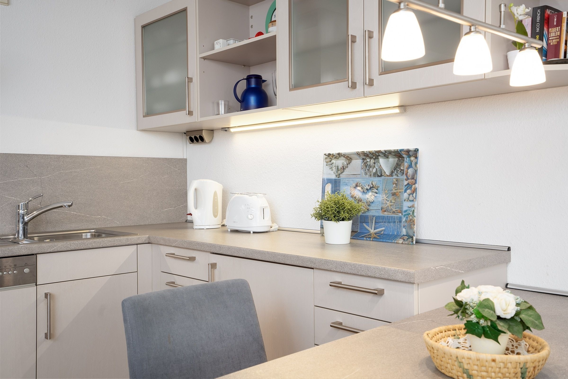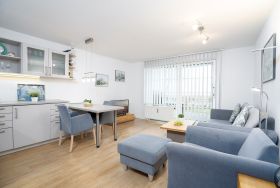 Es ist modern und geschmackvoll eingerichtet. Im renovierten Wohnraum befinden sich eine Couchgarnitur mit Sessel, welche zu einem Doppelbett (140x200cm) ausgezogen werden kann, eine Musikanlage mit CD und ein großer LED-TV. Die tolle neuwertige Küchenzeile ist komfortabel ausgestattet mit Kühlschrank mit Gefrierfach, 4-Plattenherd, Backofen, Geschirrspüler, Kaffeemaschine, Wasserkocher und Toaster. Hier finden Sie alles, um sich auch während des Urlaubs selbst zu verpflegen. An die Küche ist ein praktischer Esstresen angeschlossen. Im separaten Schlafzimmer können Sie erholsame Nächte im komfortablen Doppelbett (2x 80x200cm) verbringen. Die möblierte Terrasse bietet eine einmalige Ausrichtung in Richtung Ostsee mit vollem Panoramameerblick, hier lassen sich erholsame Urlaubsstunden begleitet vom Rauschen der Ostsee verbringen. Bad steht mit Duschkabine, Waschbecken und WC für die tägliche Körperhygiene zur Verfügung. Der WLAN-Anschluss ist selbstverständlich inklusive.