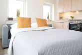 Wohnzimmer: 1 Schlafsofa (140x200 cm), Verdunklung (Gardinen)