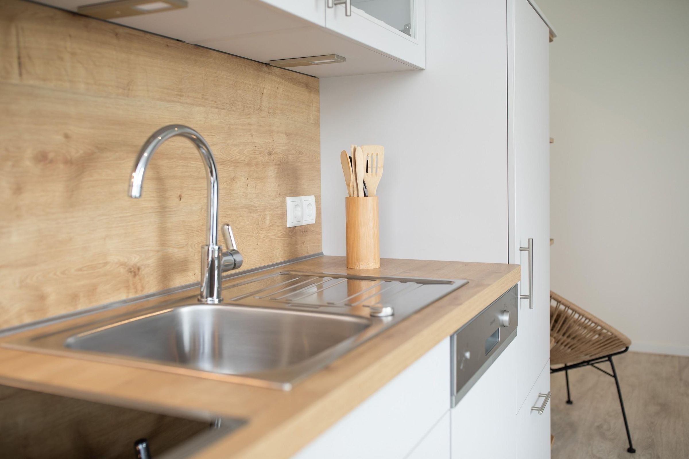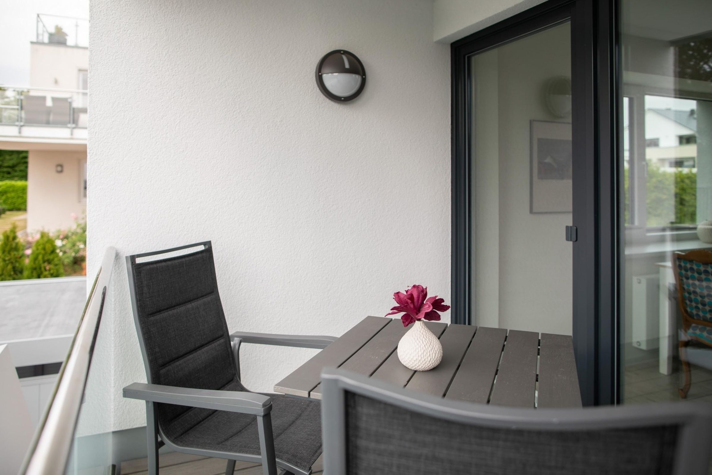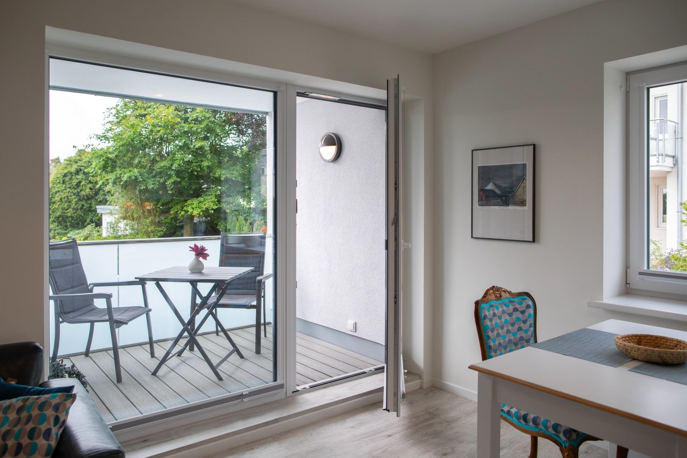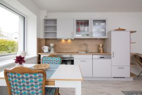 Ein separates Schlafzimmer mit komfortablem Boxspringbett (180x200cm) lädt zu erholsamen Stunden nach langen Strandtagen ein. Das stilvolle Designbad überzeugt mit Annehmlichkeiten wie bodentiefer Wellnessdusche, Schminkspiegel und Fußbodenheizung. In der offen gestalteten, gut ausgestatteten Küchen mit hochwertigen Alltagshelfern wie Backofen, Spülmaschine, Nespresso-Kapselmaschine sowie 4-Platten-Ceranfeld lassen sich im Handumdrehen leckere Ferienmahlzeiten zubereiten. Machen Sie es sich im lichtdurchfluteten Wohnbereich mit gemütlichem Sofa und Flat-TV bequem. Vom Wohnzimmer aus führt ein direkter Zugang zum überdachten, möblierten Balkon. Atmen Sie durch und genießen Sie den Blick ins Grüne – Ruhe, Entspannung und ein Hauch von Ostsee in der Ferne. Erholung pur!