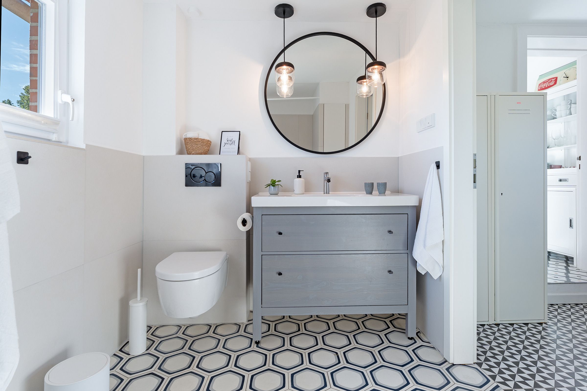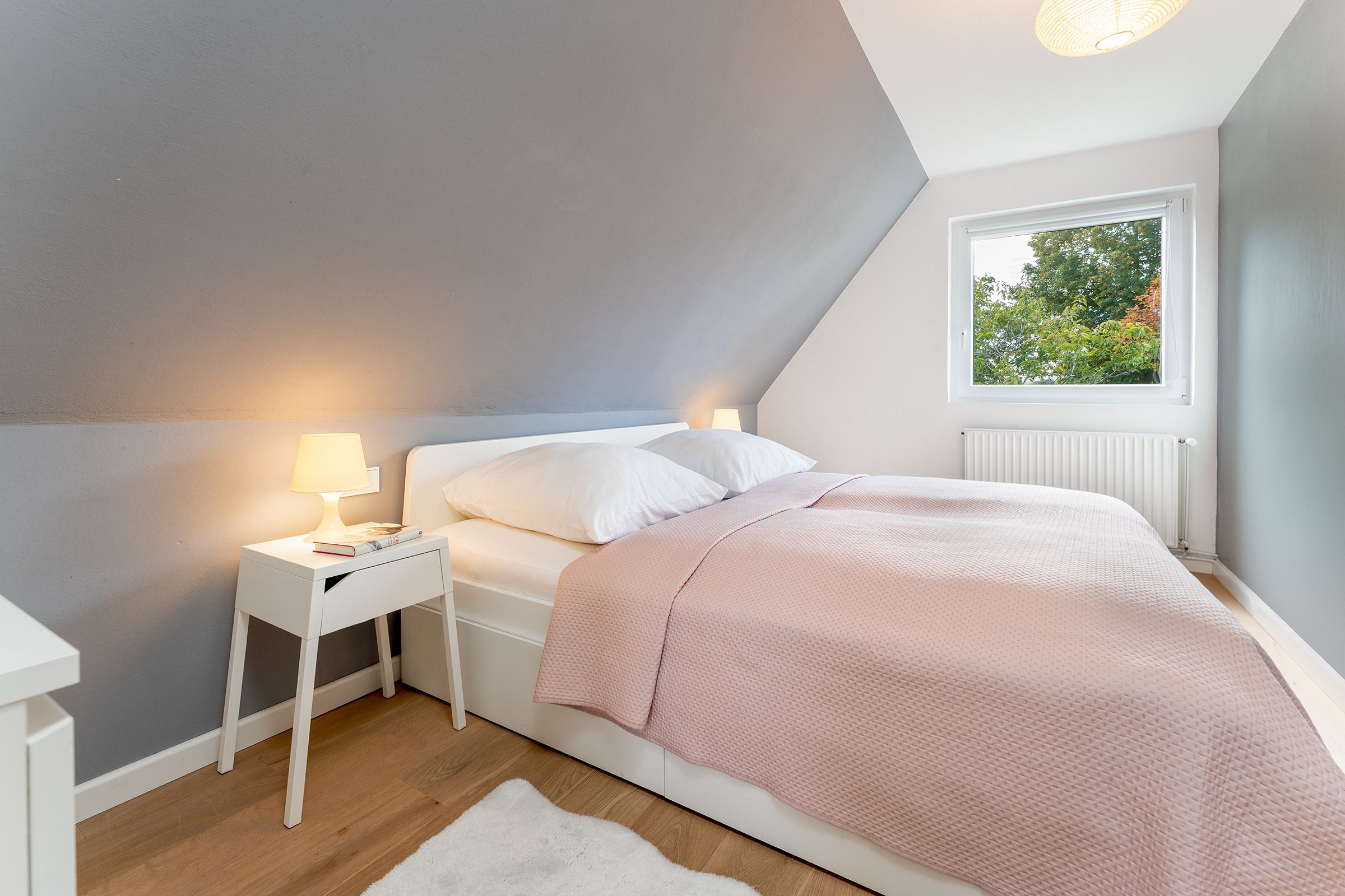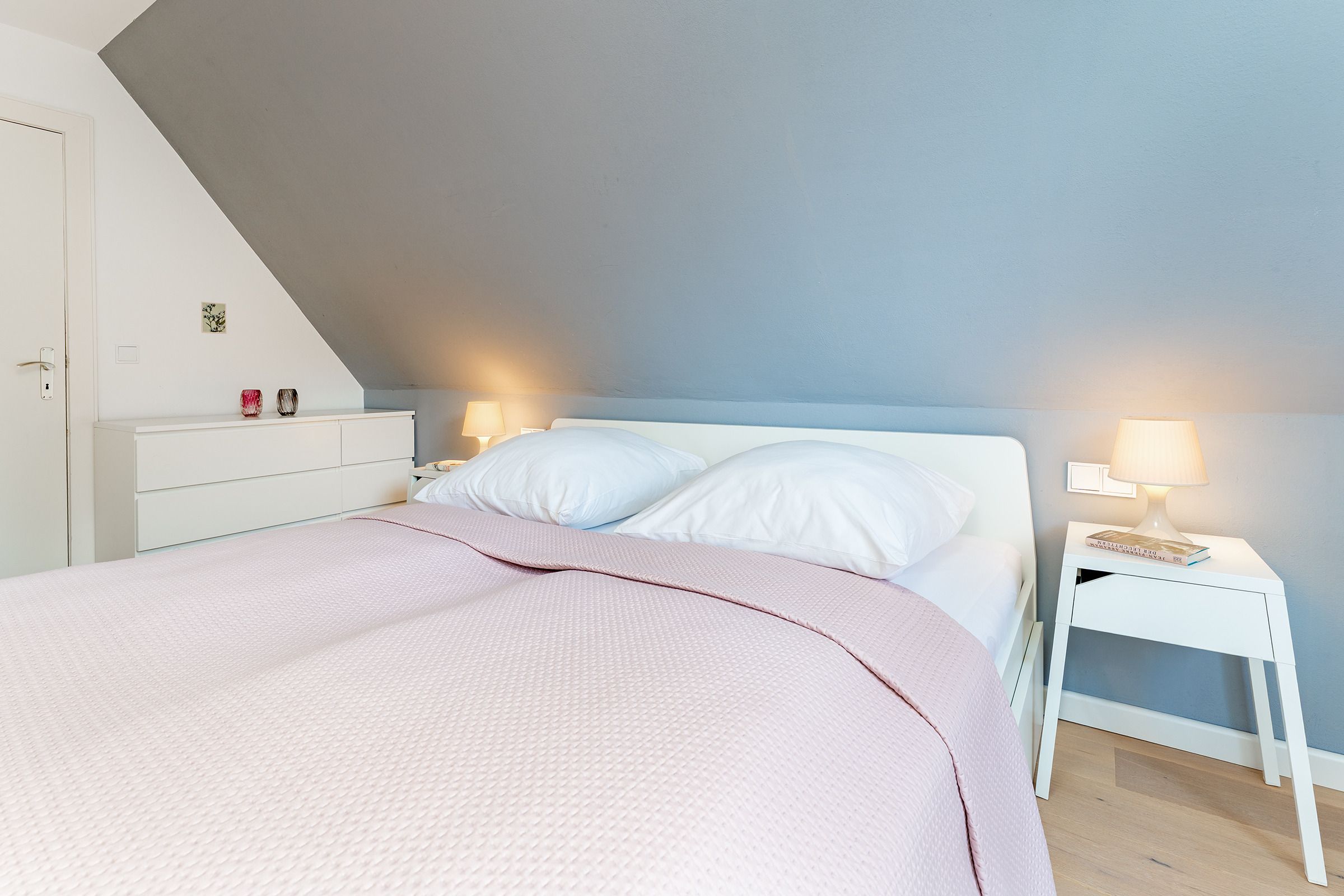 Das tageslichthelle und stilsichere Designbad begeistert mit bodentiefer Dusche, Fußbodenheizung, Waschmaschine, Trockner, beleuchtetem Spiegel und rundum gelungenem Ambiente. Im 1. Obergeschoss befinden sich beide Schlafzimmer: Eines der Schlafzimmer ist mit einem Doppelbett (2x 90x200 cm), Kommode und zwei Nachttischen möbliert, das zweite Schlafzimmer ist mit zwei Einzelbetten (je 80x200 cm), Kommode und TV ausgestattet. Gemütliche Sitzsäcke und eine Sitzecke mit zwei Cocktailsesseln laden im Obergeschoss zum Lümmeln und Entspannen ein. An grauen Tagen vertreiben Sie sich die Zeit mit der großen Spielesammlung oder schmökern in den vorhandenen Büchern und Zeitschriften.