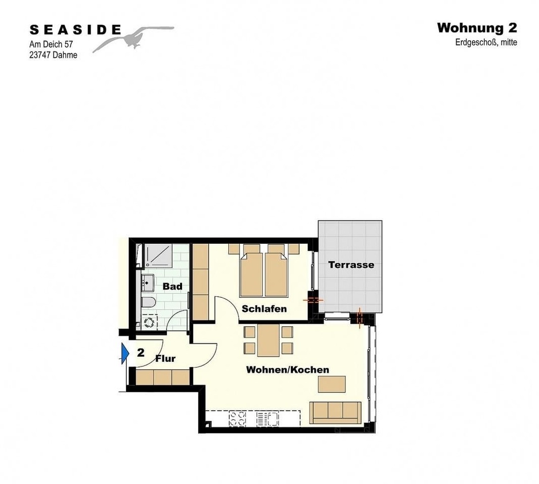 Dieser Urlaubstraum mit Terrasse bietet auf 48m² reichlich Komfort für bis zu 4 Personen. Die Ferienwohnung befindet sich im Erdgeschoss einer in 2020 fertiggestellten Wohnanlage direkt hinter dem Deich in Dahme.