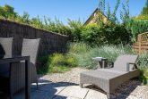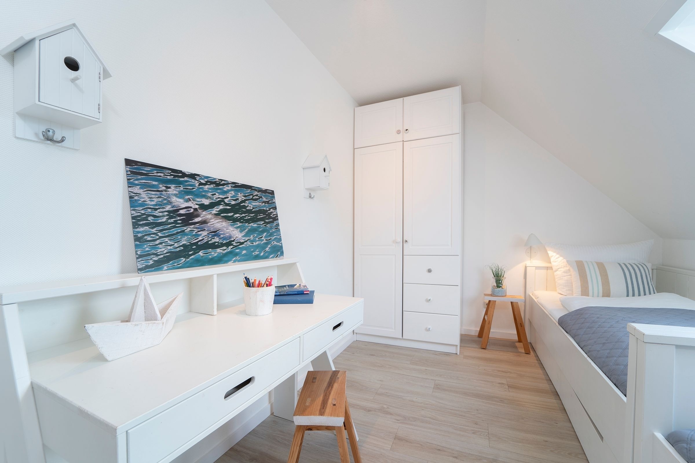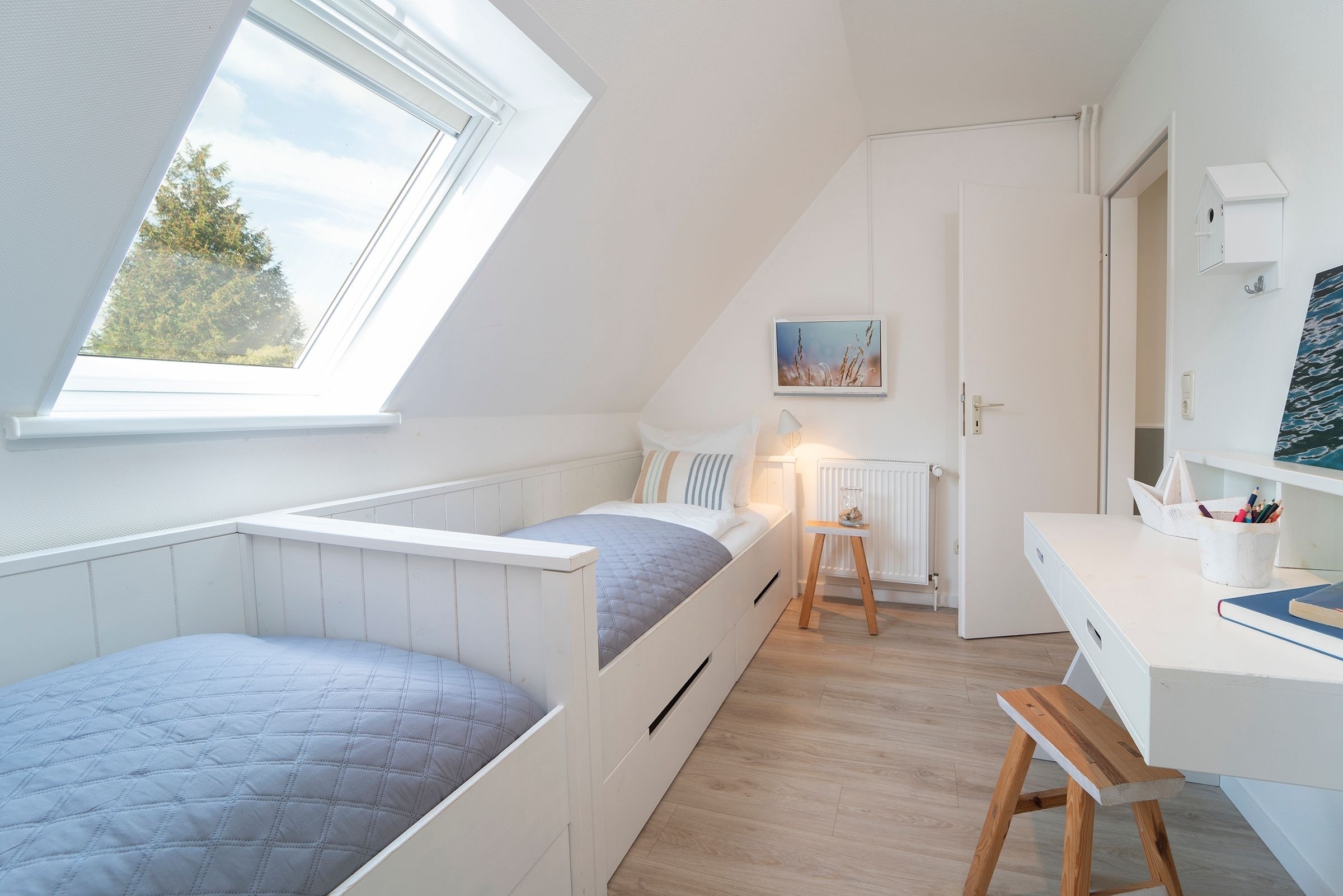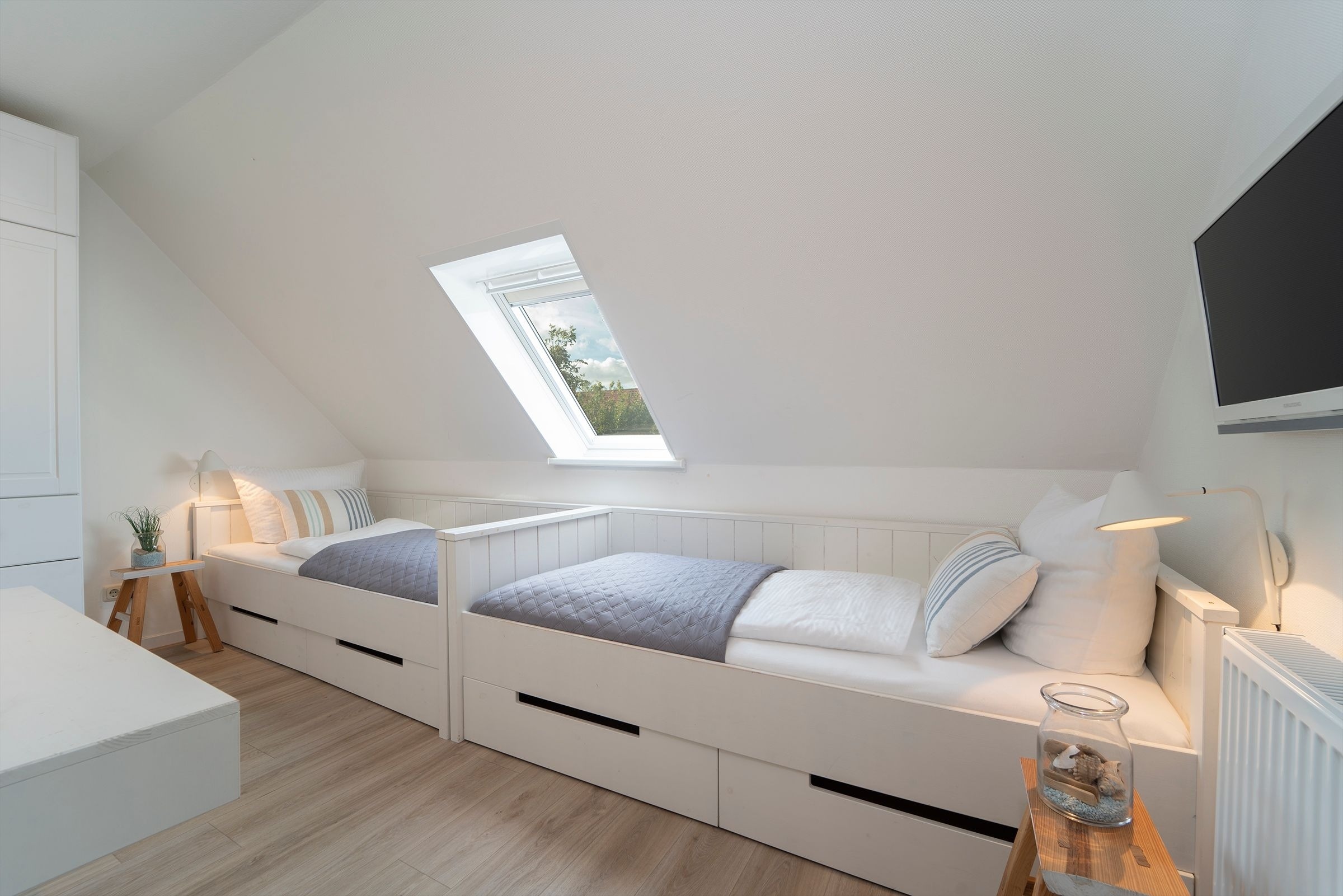 Hell und lichtdurchflutet empfängt Sie der mit viel Liebe zum Detail eingerichtete Wohnbereich. Hier sorgen ein bequemes Sofa und ein Sessel für Komfort und laden zu gemütlichen Fernseh-Abenden ein. Die moderne, voll ausgestattete Küche grenzt offen an den Wohnbereich und verfügt über alle notwendigen Küchenutensilien. Im Obergeschoss erwarten Sie ein Schlafzimmer mit Doppelbett (2x 90x200 cm) und ein Schlafzimmer mit zwei Einzelbetten (je 90x200 cm) und einem Fernseher. Das Duschbad mit Fenster befindet sich im Erdgeschoss und ist neben einem WC mit einer Dusche ausgestattet. Genießen Sie Ihren Urlaub mit einem guten Buch auf der überdachten, möblierten Terrasse oder verbringen Sie erholsame Stunden am nur ca. 400 m entfernten Strand.
