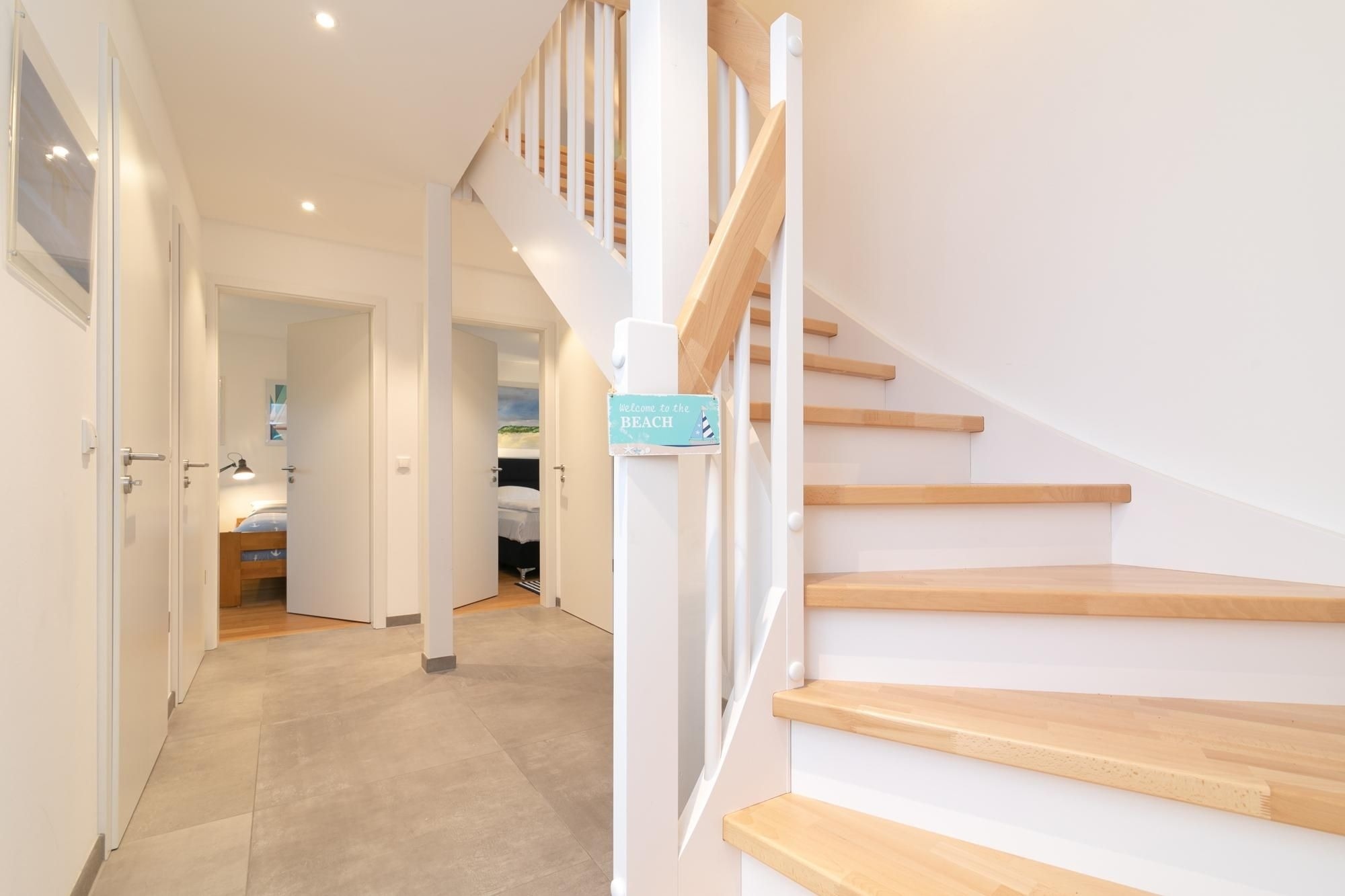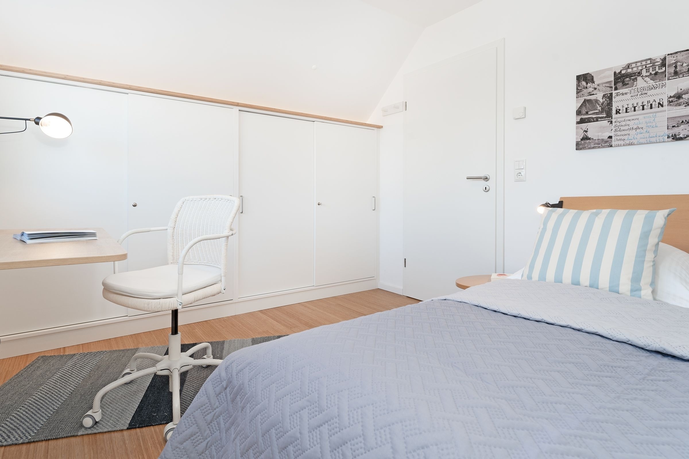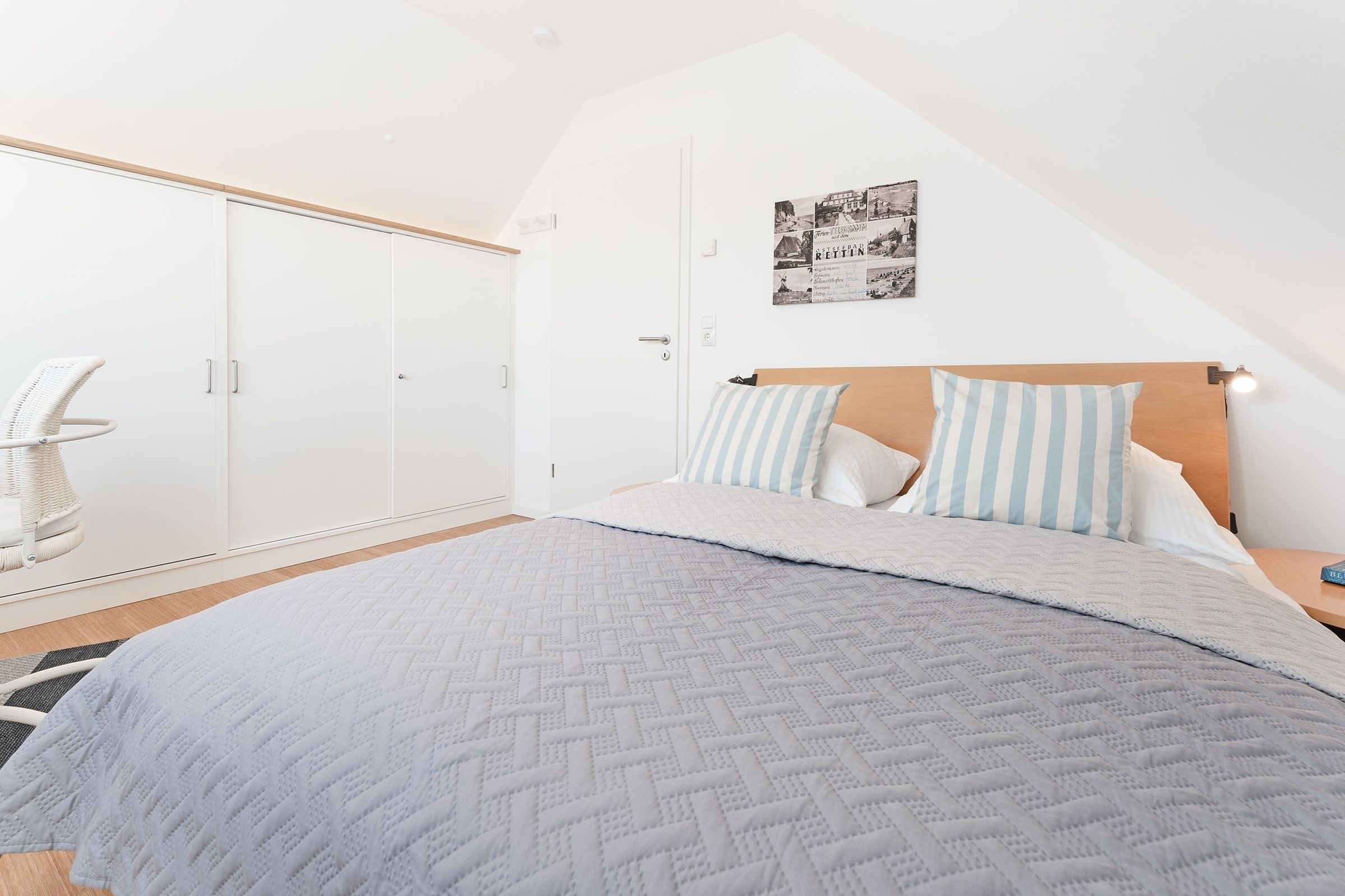 Vom geräumigen Flur gelangen Sie in die offen gestaltete Wohnküche, mit gut ausgestatteter Küchenzeile. Ein lichtdurchfluteter Galeriebereich sorgt für luftige Großzügigkeit. Ein wohliger Ofen, ein großer Esstisch, eine gemütliche Couch und liebevoll platzierte Dekoration bilden das Interieur. Vom Wohnzimmer haben Sie Zutritt zum eigenem Garten mit Terrasse und Strandkorb. Lassen Sie hier am Abend entspannt schöne Urlaubstage ausklingen oder genießen Sie schon den ersten Kaffee am Morgen mit einer frischen Ostseebrise in der Nase. Ein großes Wohlfühlbad mit bodentiefer Walk-In Dusche, Fenster, Handtuchheizung, finnischer Sauna für 3-4 Personen und im Außenbereich während der frostfreien Zeit, eine Dusche sowie ein Gäste-WC perfektionieren dieses schöne Ferienhaus. Im 1. Obergeschoss erwarten Sie zwei Schlafzimmer - eines mit Boxspring-Doppelbett (2x 80x200 cm) und eines mit 2 Einzelbetten (je 90x200 cm). Über ein Treppe gelangen Sie in das stilvolle Dachgeschoss. Hier befinden sich ein Schlafzimmer mit einem Doppelbett (2x 90x200 cm) und einem Homeoffice-Platz für mobiles Arbeiten sowie eine gemütliche Lounge-Ecke im offenen Galeriebereich.