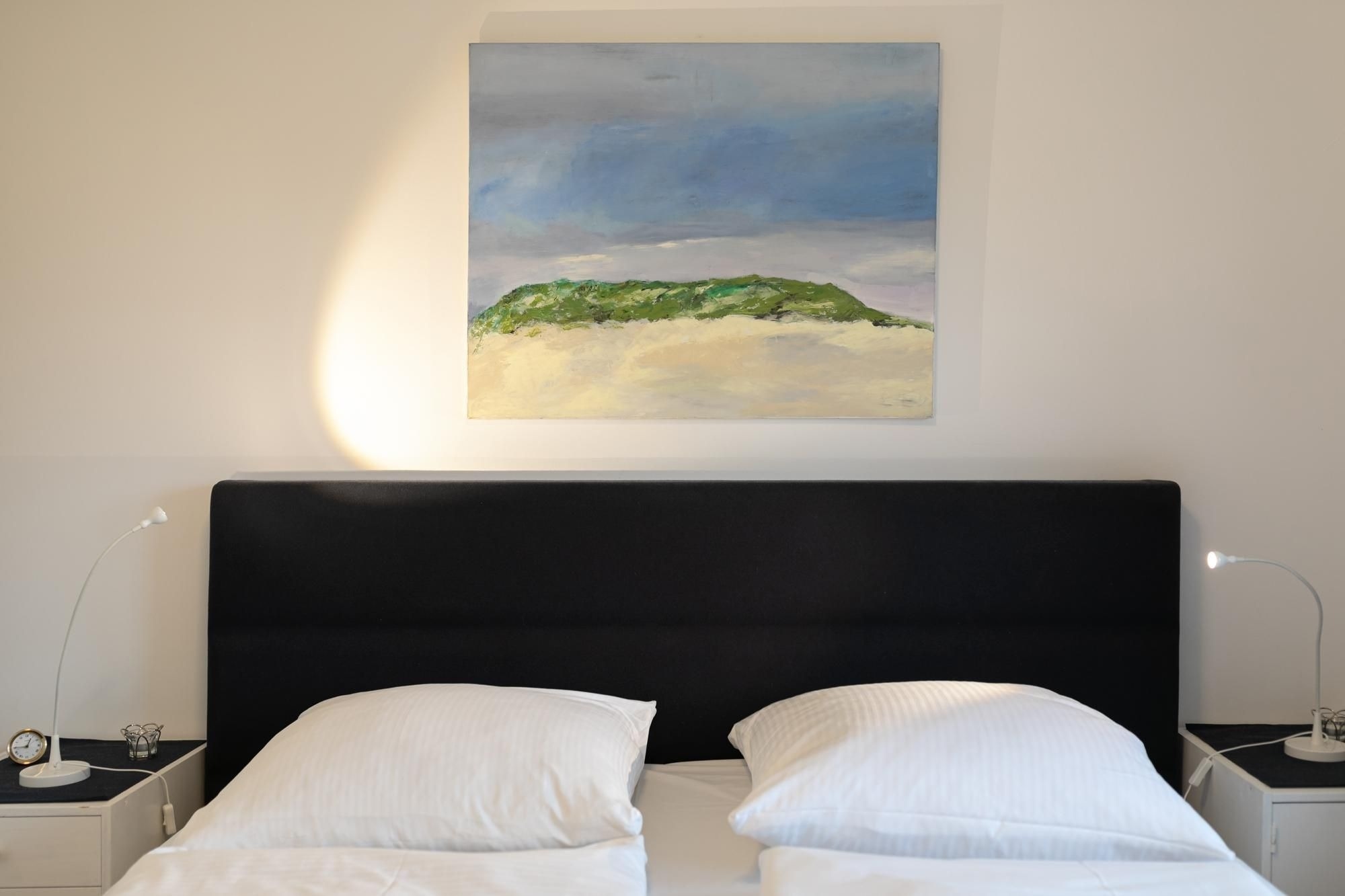 Schlafzimmer 1: 1 Boxspring-Doppelbett (2x 80x200 cm), Kleiderschrank, Verdunkelung (Plissees und Vorhänge)