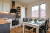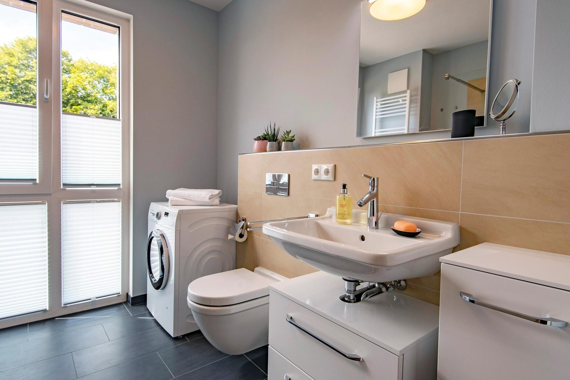 Im separaten Schlafzimmer sorgt ein komfortables Doppelbett (2x90x200cm) für erholsame Nächte und im Wohnzimmer bietet das hochwertige Schlafsofa (Liegefläche ca. 180x240cm) einen weiteren gemütlichen Schlafplatz für zwei. Plissees bieten angenehme Verdunklung. Neben der geschmackvollen Ausstattung sorgt auch die Fußbodenheizung für ein wohliges Ambiente. Das tageslichthelle Wellnessbad begeistert ebenfalls mit Fußbodenheizung, Waschmaschine, Handtuchheizung, sowie bodentiefer Dusche.