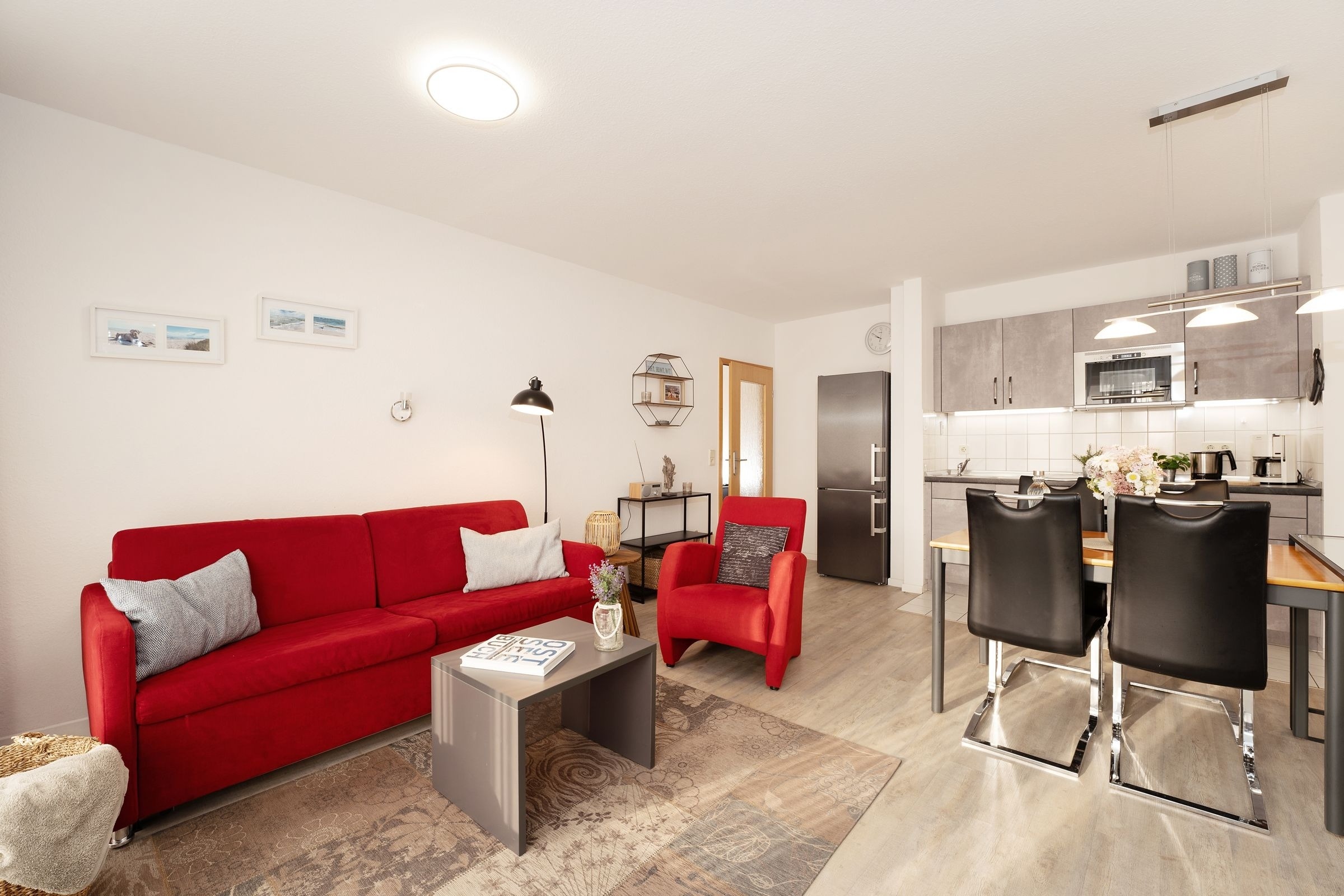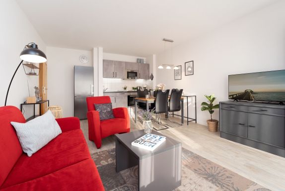 Ankommen, auspacken und wohlfühlen ... die Ferienwohnung Ostseeoase heißt Sie herzlich willkommen. Sie befindet sich im gepflegten Ferien-Wohnpark Kaiserhof – nur rund 100 Meter vom Ostseestrand entfernt. Insgesamt bietet die helle Wohnung mit der charmanten Einrichtung viel Stauraum. Das Wohnzimmer ist mit einer schicken Couch ausgestattet, die sich für die Nacht in ein bequemes Doppelbett verwandeln lässt. Direkt daneben befindet sich der Zugang zur möblierten Terrasse. Hier können Sie geschützt und gemütlich zusammensitzen und Ihre Auszeit genießen – und vielleicht den Abend bei einem Glas Wein ausklingen lassen. Die moderne Küche im zeitlosen Grau bietet sämtliche Annehmlichkeiten, die ein Hobby-Koch im Urlaub braucht. Genießen Sie Ihre Menüs anschließen in der schicken Ess-Ecke. Für die Nacht steht Ihnen ein Doppelbett (2x 90x200 cm) im geräumigen Schlafzimmer zur Verfügung. Wie wäre es hier noch mit einem guten Buch vor dem Einschlafen? Das Duschbad ist hell gefliest und hat Tageslicht.