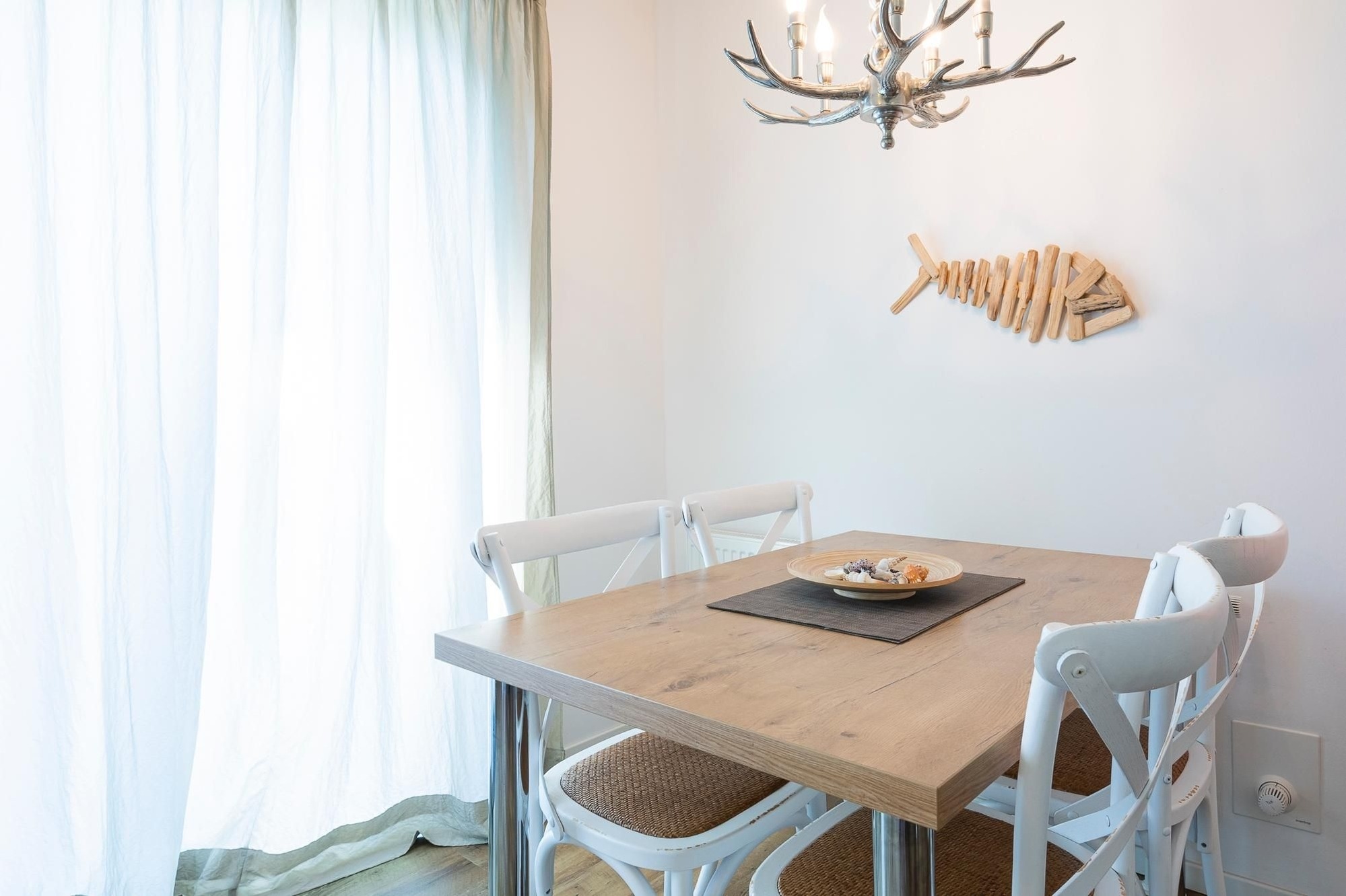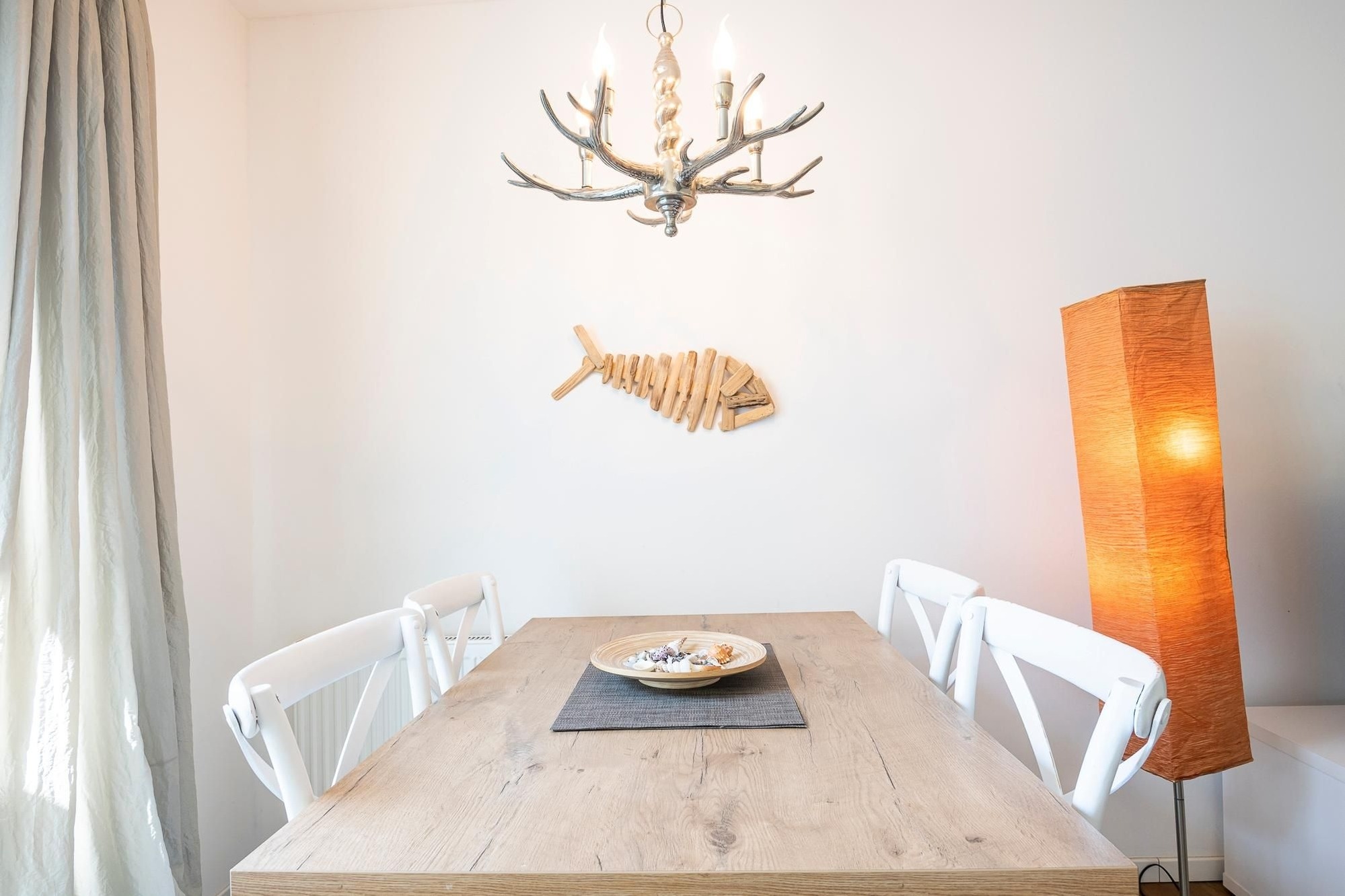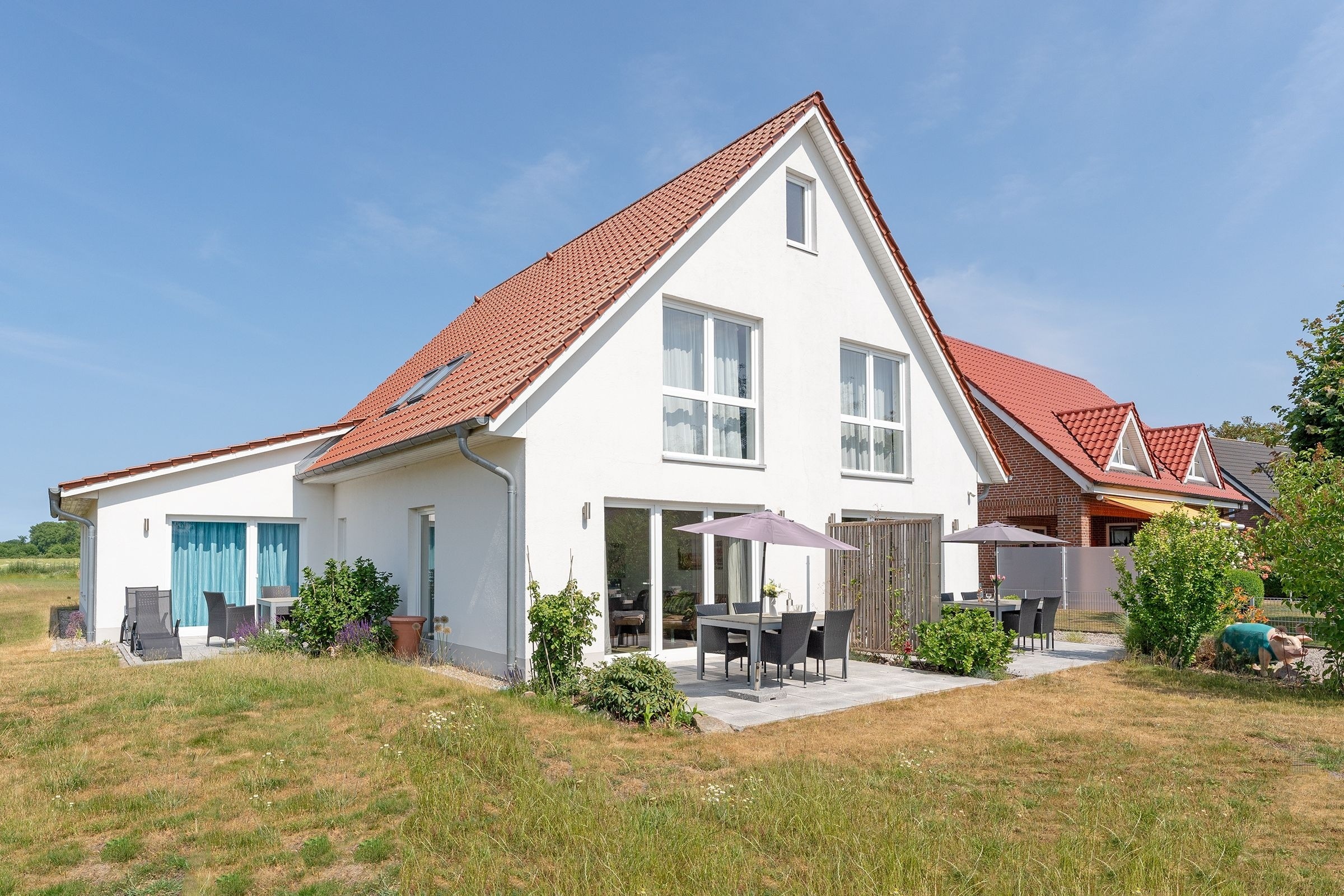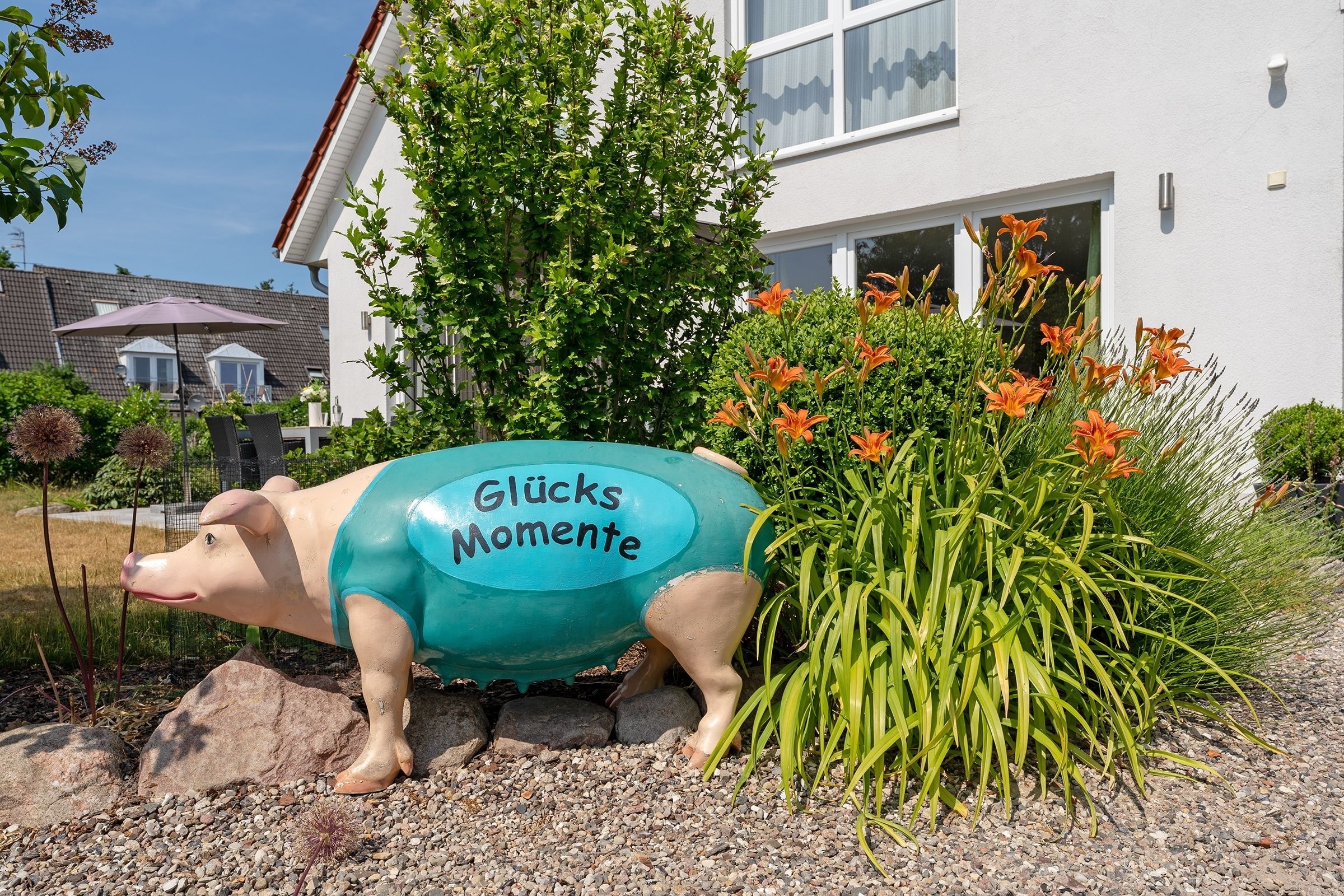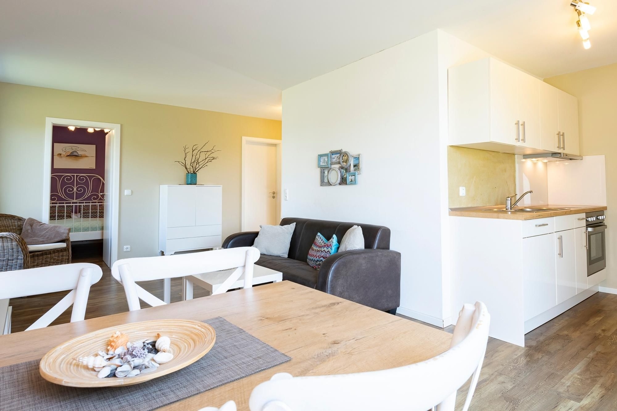 Hier können Sie glücklich sein – die schicke Ferienunterkunft im Bungalowstil befindet sich im Haus Glücksmomente und sorgt mit Sicherheit für wahre Hochgefühle im Urlaub. Der Wohnbereich besticht durch eine liebevoll ausgesuchte Einrichtung. Es lassen sich viele maritime Details finden, aber auch die Nähe zum Wald wird in der Dekoration deutlich. Wald und Meer – eine wunderbare Kombination. Nehmen Sie auf dem schicken Dreisitzer oder auf dem Relaxsessel mit Hocker Platz und lassen Sie sich vom TV-Gerät unterhalten. Auch vor der großen Terrassentür befindet sich eine schöne Sitz-Ecke zum Verweilen. Genießen Sie hier Ihre Urlaubs-Menüs oder planen Sie hier Ihre Ausflüge. Die Ostseeküste hat viel zu bieten. Direkt hier können Sie auch raus auf die möblierte Süd-Terrasse treten und es sich auf der Sonnenliege gemütlich machen. Oder wie wäre es hier abends mit einem Glas Wein? Auch befindet sich hier ein Gemeinschaftsgrill, den Sie gern nutzen können. Zurück im Wohnraum präsentiert sich die offene Küche mit Spülmaschine in einer Nische, sodass sie doch etwas abgetrennt wirkt. Die gute Ausstattung lässt sicher keine Wünsche offen. Nach einem erlebnisreichen Urlaubstag kommen Sie in den beiden Schlafräumen wunderbar zur Ruhe. Ein Zimmer verfügt über ein französisches Bett (140x200 cm) und ein Zimmer über 2 Einzelbetten (je 90x200 cm). Das moderne, helle Duschbad mit Fenster verspricht einen guten Start in den Tag. Angenehme Wärme verschafft die Fußbodenheizung in Badezimmer und Wohnbereich.