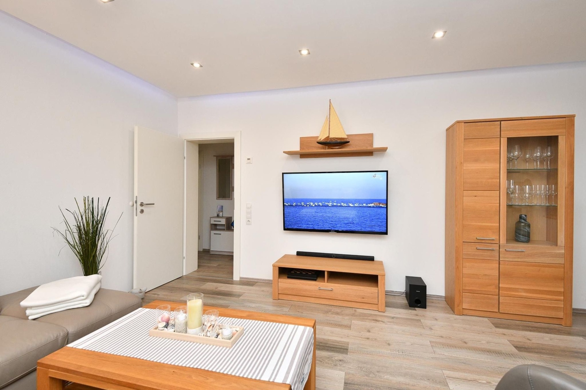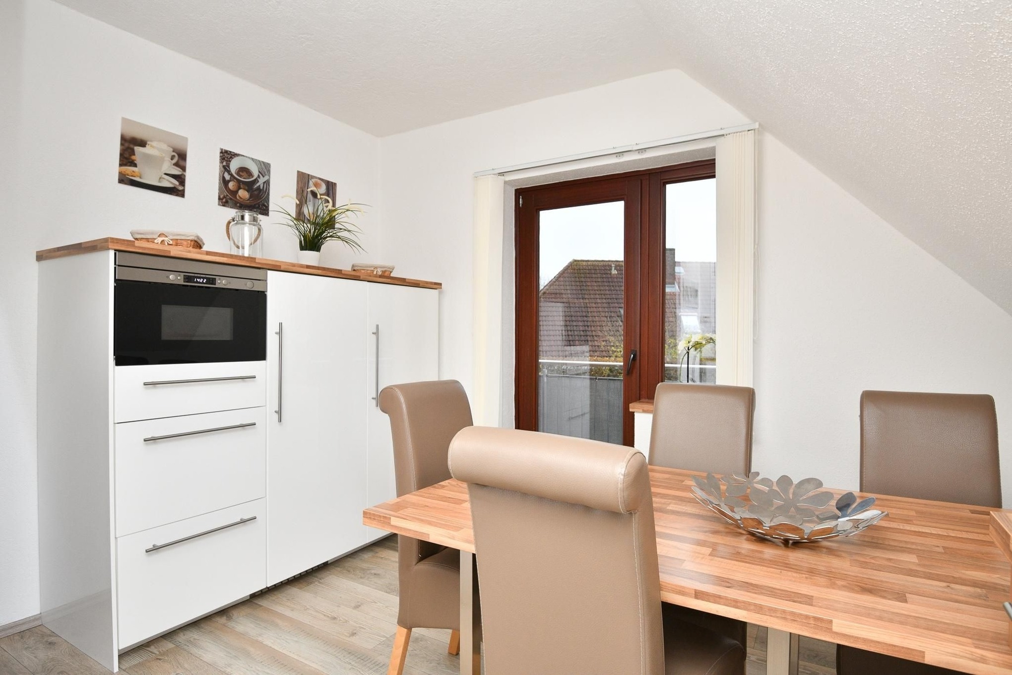 In der besten Lage von Kellenhusen: moderne 3-Zimmer-Ferienwohnung im 1. Stock (Dachgeschoss) mit Kaminofen und Süd-Balkon. Auf einer Wohnfläche von ca. 84 m² können sich bis zu 4 Personen plus Baby wunderbar erholen.