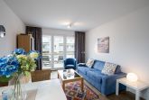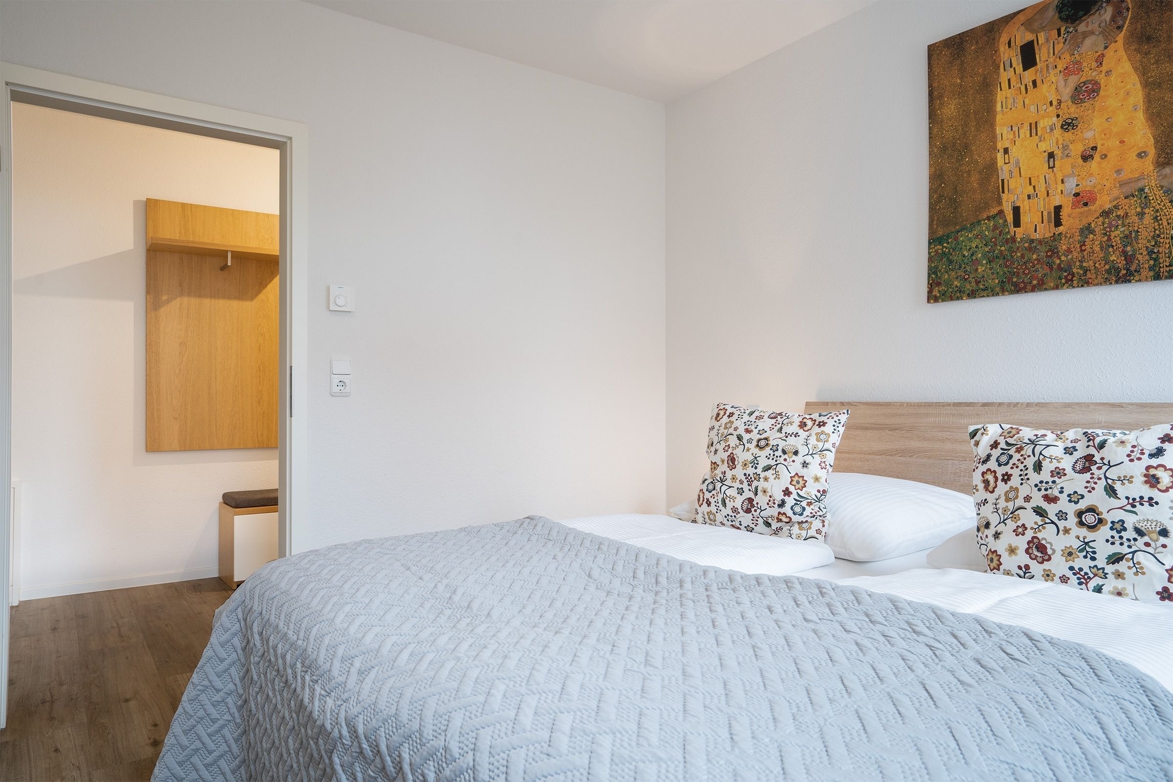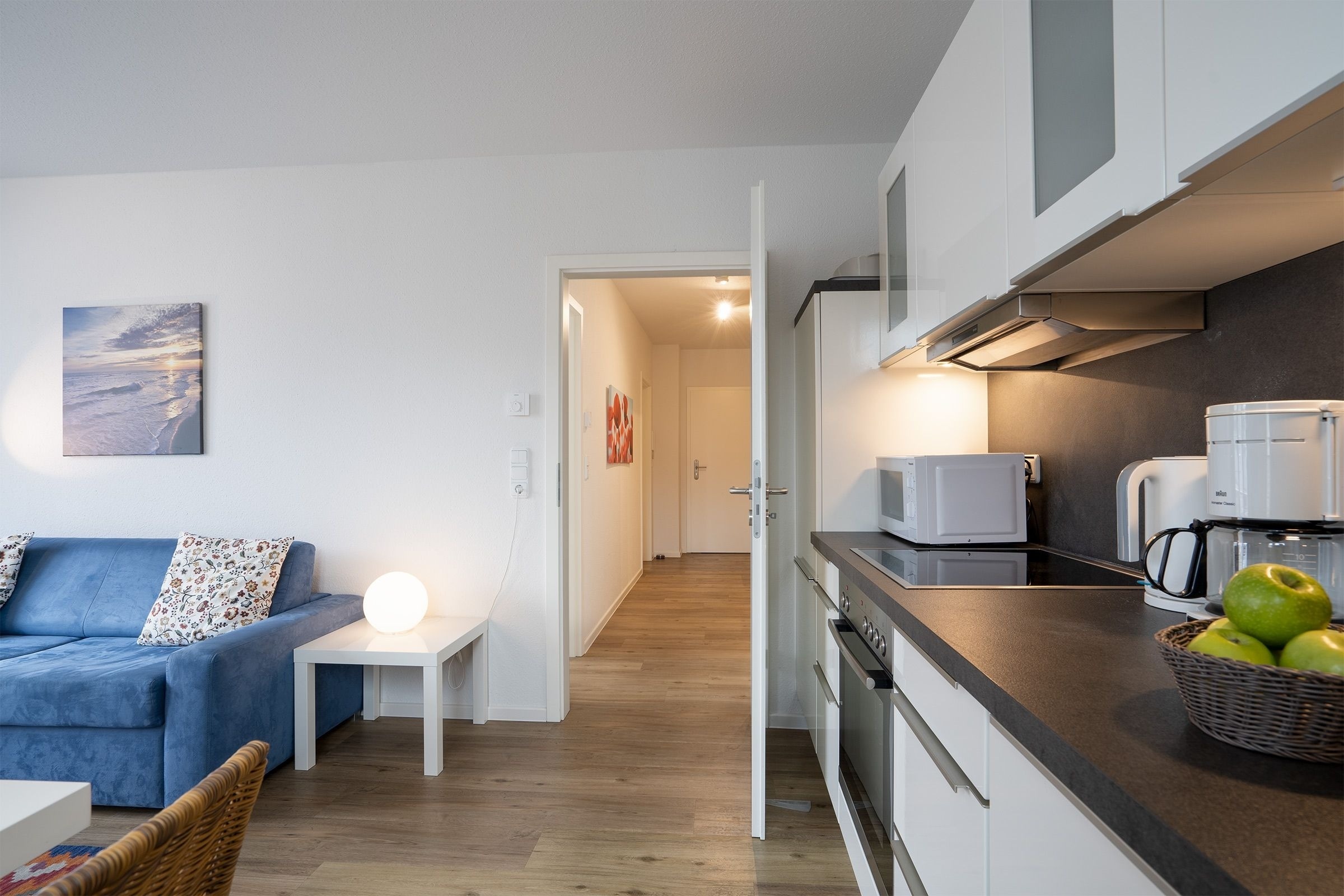 Dieses modern und komfortabel eingerichtete Feriendomizil ist aufgeteilt in einen Wohn-/Essbereich (Schlafcouch ca. 140 cm breit) mit TV, Radio, offene Einbauküche mit Geschirrspüler, Backofen mit Ceranfeld, Mikrowelle, Kühlschrank mit Gefrierfach, Kaffeemaschine, Toaster etc.. Das Schlafzimmer verfügt über ein Doppelbett (180x200 cm) und ein 2. TV-Gerät. Das Duschbad mit WC hat einen Waschtrockner. Die sonnige, möblierte Balkon-Loggia in West-Lage lädt zum Entspannen ein.