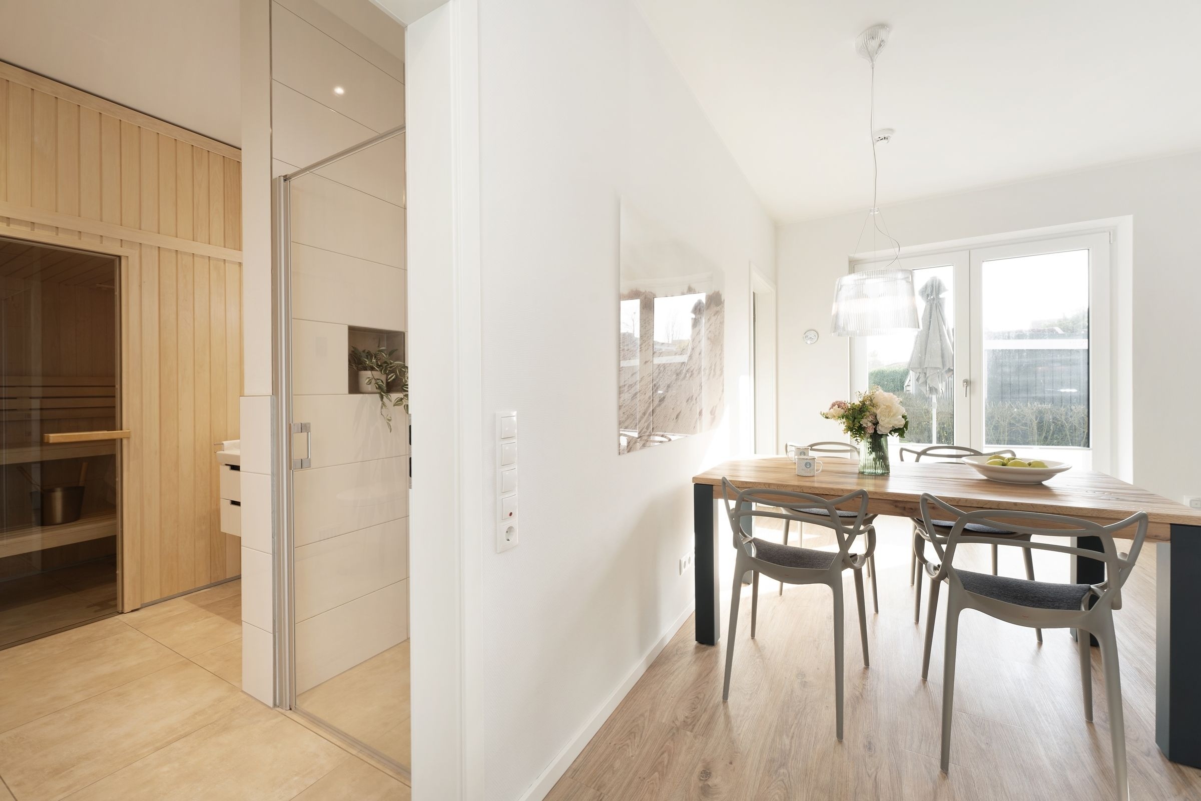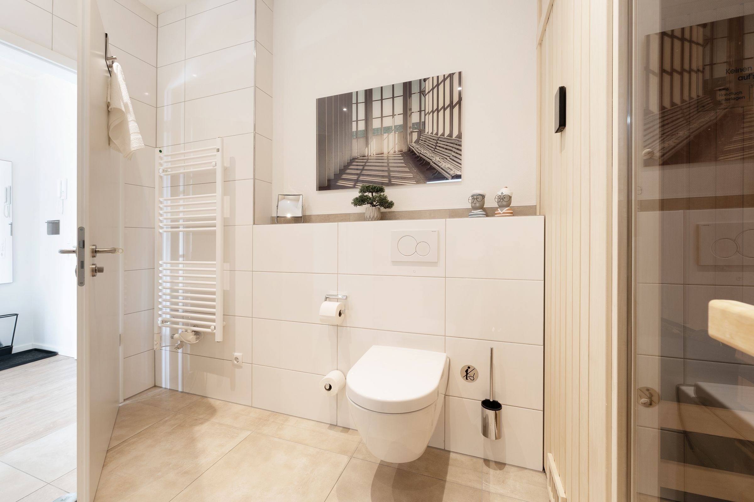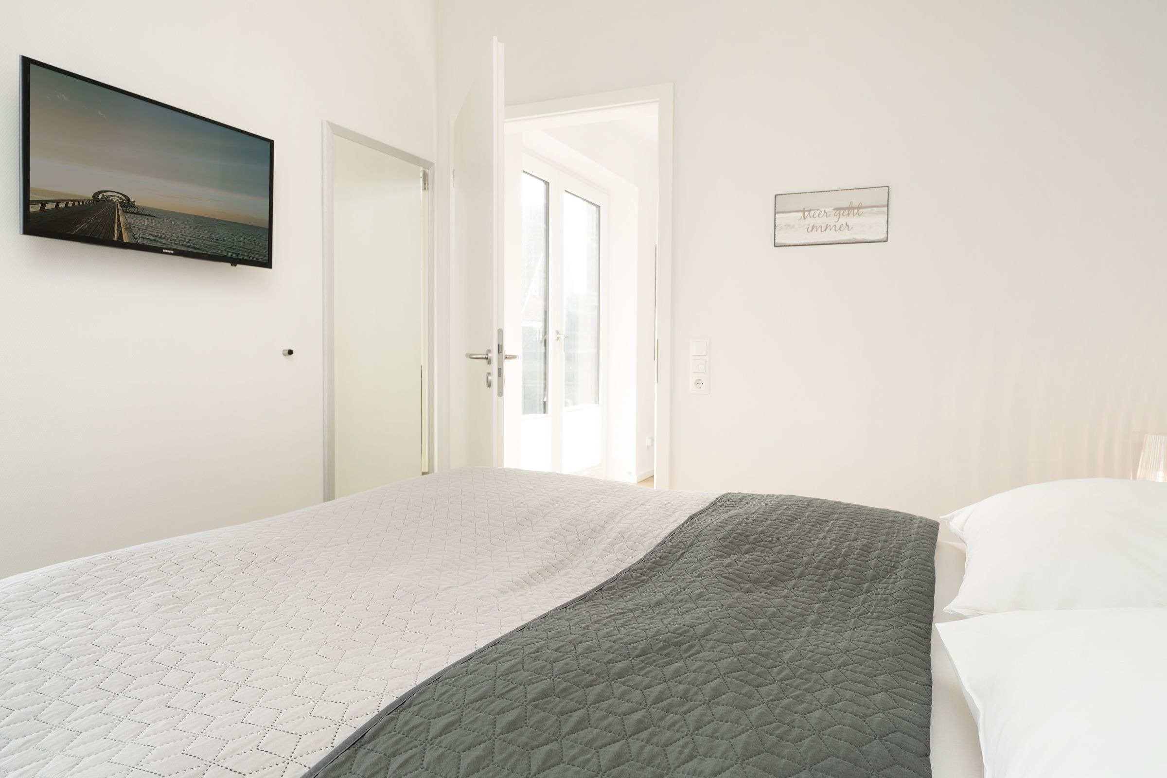 Hell, freundlich und mit bodentiefen Fenstern begrüßt Sie diese moderne, barrierearme Wohnung. Die Einrichtung ist liebevoll ausgesucht und verspricht Wohlfühl-Garantie. In dem großzügigen Wohn- und Essbereich sorgt ein Smart-TV für gute Unterhaltung. Verbringen Sie auf der bequemen Couch Ihre Abende bei einem Glas Wein. Bei gutem Wetter geht es natürlich raus auf die möblierte Terrasse. Genießen Sie hier Ihre Urlaubszeit oder planen Sie Ihre Ausflüge entlang der Ostseeküste. Die offene Küche ist hochwertig ausgestattet und bringt Hobby-Köche zum Lächeln. Nach dem Kochen und Schmausen übernimmt ein Geschirrspüler den Abwasch. Das Schlafzimmer ist mit einem Boxspringbett (180x200 cm) und einem weiteren TV-Gerät möbliert. Das großzügige Bad mit bodengleicher Dusche und Sauna sorgt auch an kälteren Tagen für Wärme und Entspannung. Die gesamte Wohnung verfügt über eine Fußbodenheizung. Im Abstellraum finden Sie einen Waschtrockner.