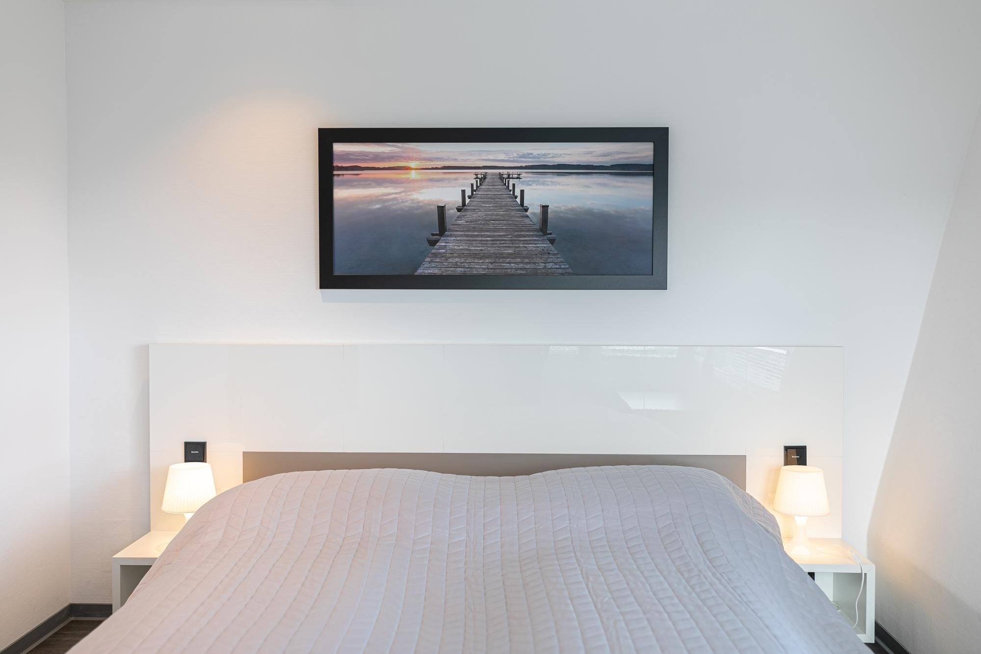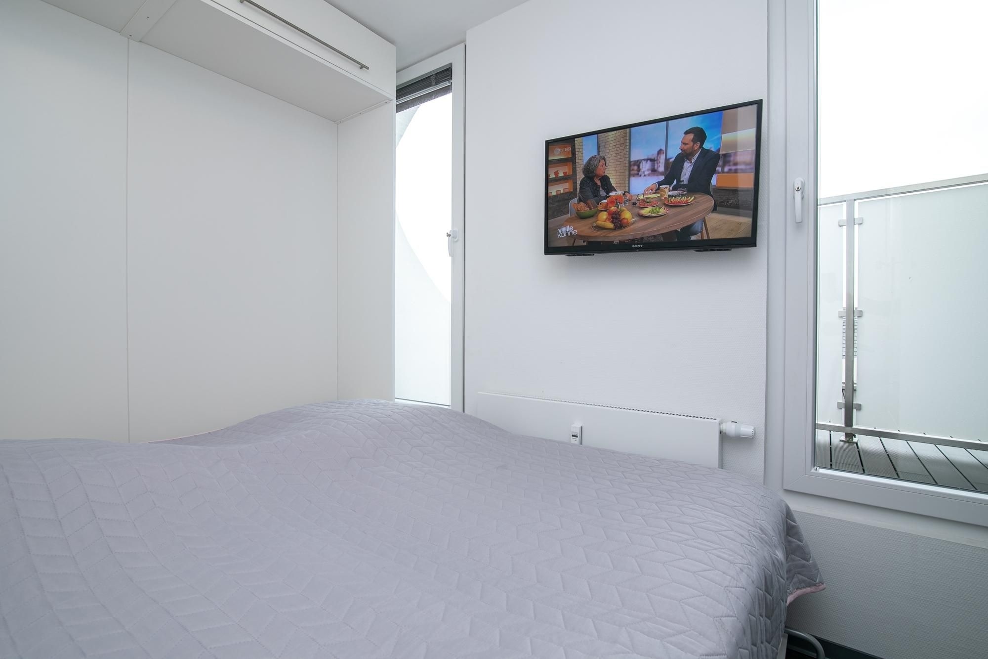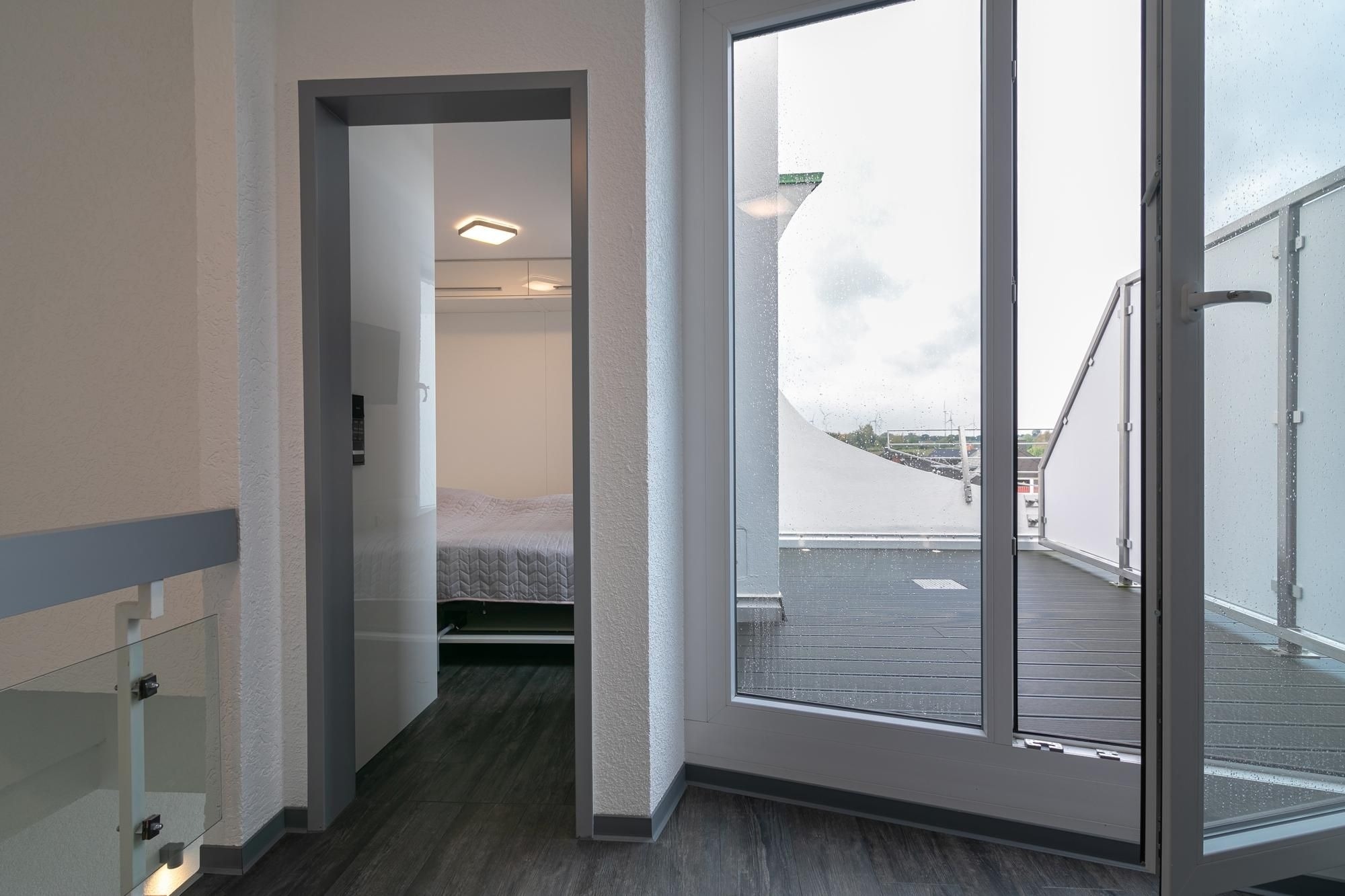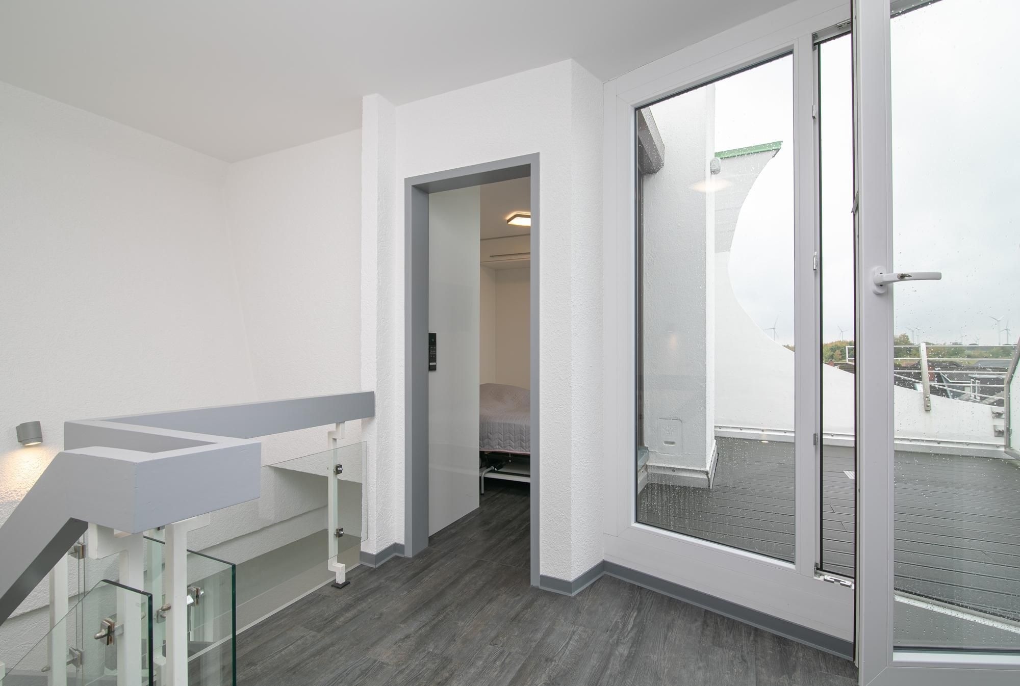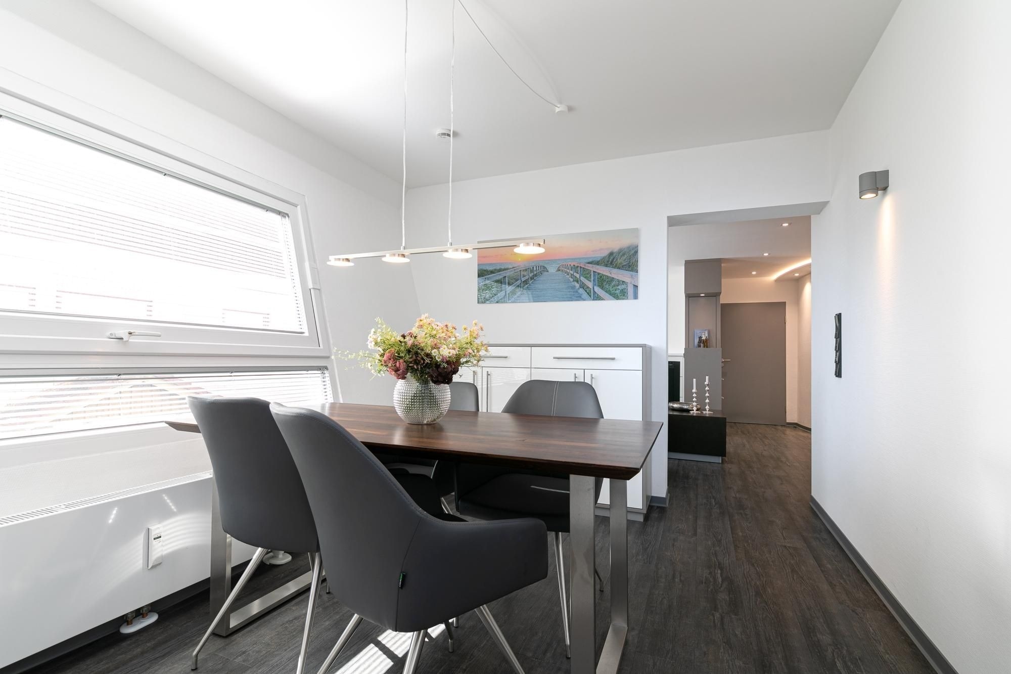 Der moderne Wohn-/Essbereich mit markanter Raumstruktur bietet eine gemütliche Sofa Ecke mit Flatscreen-TV, sowie einen stilsicheren Essplatz für 4 Personen. Die hochwertige, offen gestaltete Küchenzeile ist mit Annehmlichkeiten wie Kühlschrank mit Gefrierfach, Backofen und Spülmaschine gut ausgestattet. Treten Sie aus der Wohnung in den Hausflur, gelangen Sie zur möblierten Dachterrasse mit Süd-West-Ausrichtung. Eines der separaten Schlafzimmer ist mit einem komfortablen Doppelbett (2x 100x200 cm), Flatscreen-TV und Kleiderschrank möbliert. Im zweiten Schlafzimmer befinden sich zwei Einzelschrankbetten (je 100x200 cm), ein Flatscreen-TV, sowie ein Kleiderschrank, dieses Schlafzimmer wird über den Hausflur erreicht und ist daher eher für Erwachsene oder ältere Kinder geeignet. Im geschmackvollen Bad sorgen Wohlfühl-Elemente wie Waschbecken mit Unterschrank und beleuchtetem Spiegel, Walk-in-Dusche, Waschmaschine und beheizbarer Handtuchhalter für Komfort.