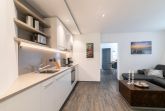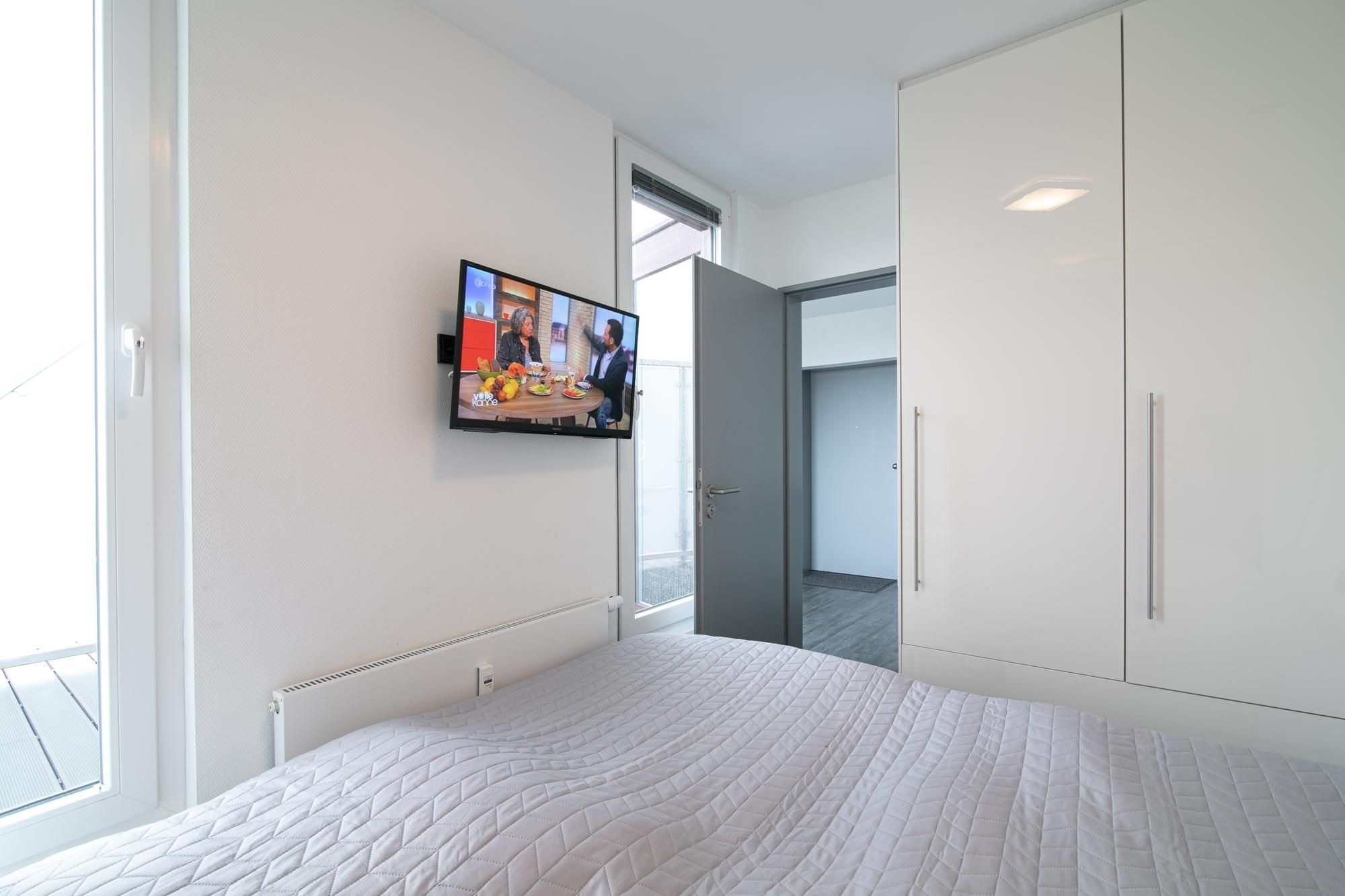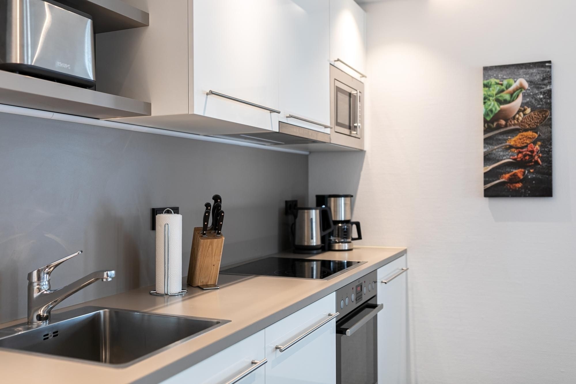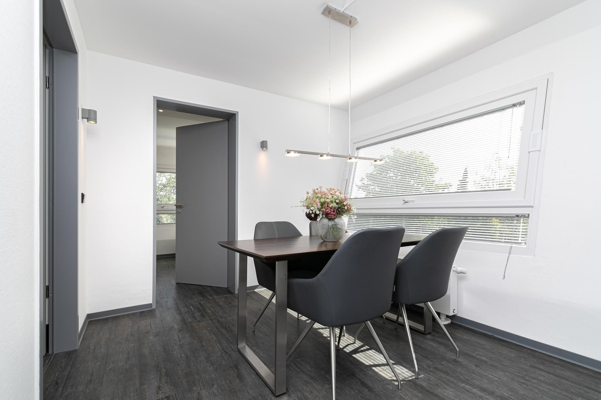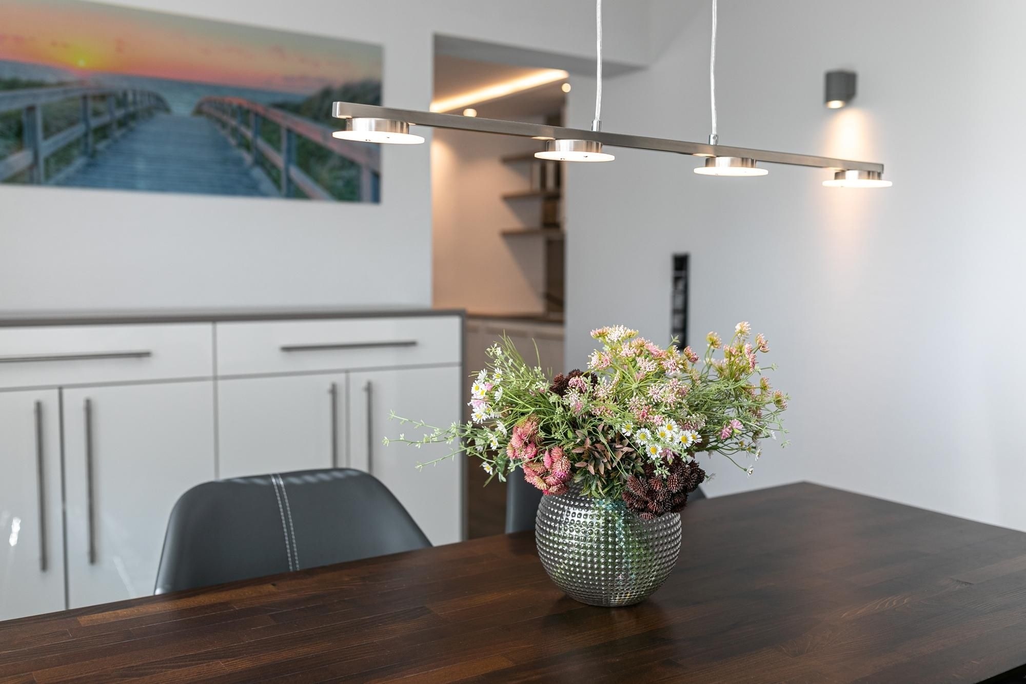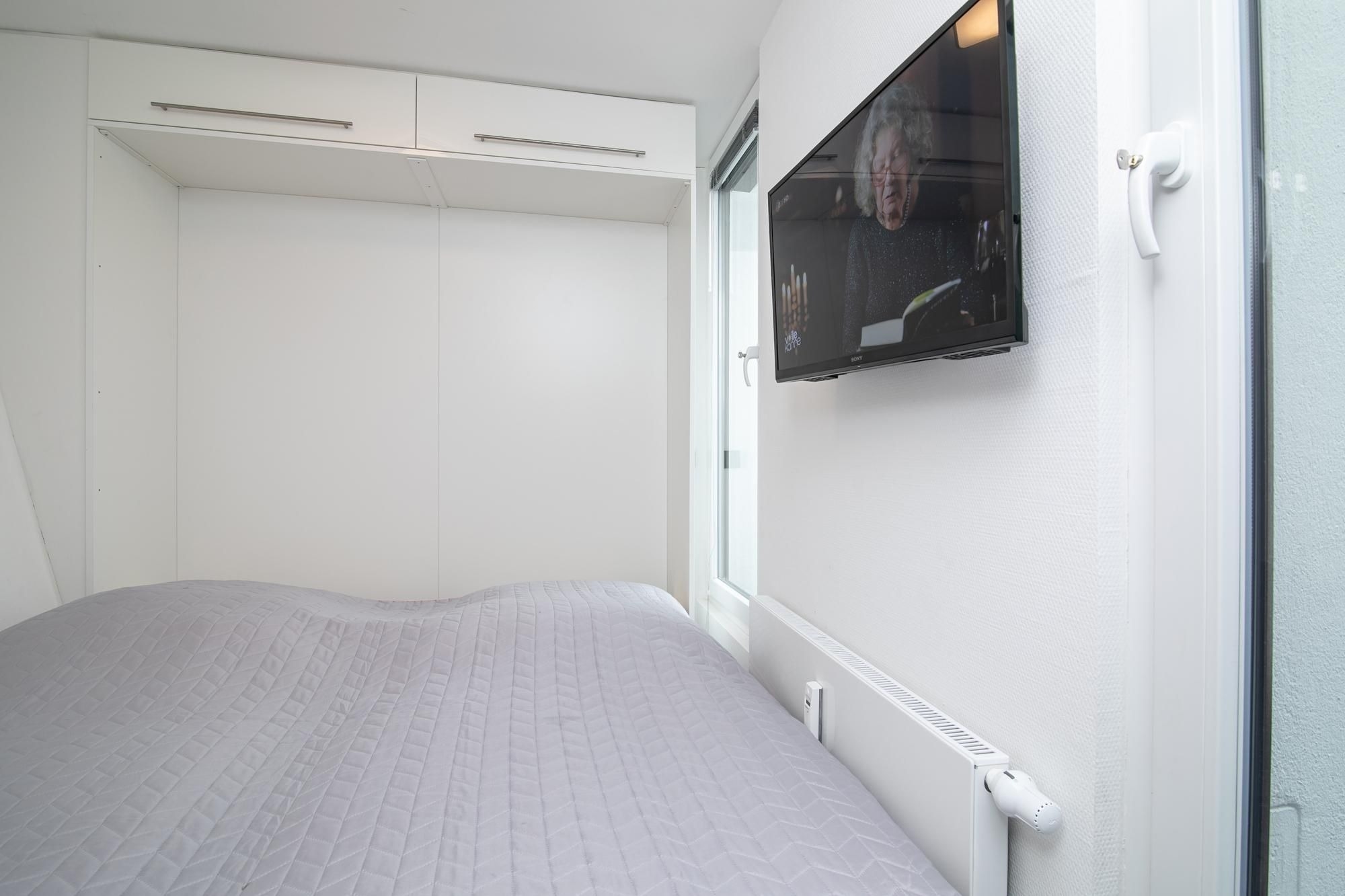 Der moderne Wohn-/Essbereich mit markanter Raumstruktur bietet eine gemütliche Sofa Ecke mit Flatscreen-TV, sowie einen stilsicheren Essplatz für 4 Personen. Die hochwertige, offen gestaltete Küchenzeile ist mit Annehmlichkeiten wie Kühlschrank mit Gefrierfach, Backofen und Spülmaschine gut ausgestattet. Treten Sie aus der Wohnung in den Hausflur, gelangen Sie zur möblierten Dachterrasse mit Süd-West-Ausrichtung. Eines der separaten Schlafzimmer ist mit einem komfortablen Doppelbett (2x 100x200 cm), Flatscreen-TV und Kleiderschrank möbliert. Im zweiten Schlafzimmer befinden sich zwei Einzelschrankbetten (je 100x200 cm), ein Flatscreen-TV, sowie ein Kleiderschrank, dieses Schlafzimmer wird über den Hausflur erreicht und ist daher eher für Erwachsene oder ältere Kinder geeignet. Im geschmackvollen Bad sorgen Wohlfühl-Elemente wie Waschbecken mit Unterschrank und beleuchtetem Spiegel, Walk-in-Dusche, Waschmaschine und beheizbarer Handtuchhalter für Komfort.