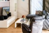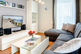 Sie lieben das Besondere? Dann schauen Sie sich diese moderne Ferienwohnung genauer an: Das Objekt liegt in der gepflegten Wohnanlage Im Kirschgarten und bietet diverse Extras. Der großzügige Wohn-/Essbereich empfängt Sie mit einer gemütlichen Sofalandschaft zum Entspannen – für die richtige Unterhaltung stehen Ihnen ein SAT-TV in Ultra HD, ein Blueray-Player sowie eine Stereoanlage mit CD-Player zur Verfügung. Ein Kaminofen sorgt an kühleren Tagen für wohlige Wärme. Die angrenzende, offene Küche mit heller Front punktet durch viele Annehmlichkeiten wie Nespresso-Kapselmaschine und Geschirrspüler. Die gute Ausstattung wird Sie beim Zubereiten Ihrer Lieblingsmenüs sicher zum Lächeln bringen. Ihre Speisen können Sie in der schicken Essecke zu sich nehmen - oder aber an der frischen Ostseeluft auf dem großzügigen möblierten Balkon. Nach einem zauberhaften Tag an der Küste können Sie sich auf eine geruhsame Nacht freuen. Das Eltern-Schlafzimmer verfügt über ein Boxspringbett (180x200 cm) und ein zusätzliches TV-Gerät. Im Kinderzimmer stehen 2 einzelne Boxspringbetten (je 90x200 cm). Das komfortable, tageshelle Duschbad mit Sauna bietet auch an kälteren Tagen Wärme und Entspannung. Diese Ferienwohnung ist an allen Fenstern mit Fliegengittern ausgestattet, zudem lassen sich alle Wohn- und Schlafräume dank verdunkelnder Vorhänge komplett abdunkeln.