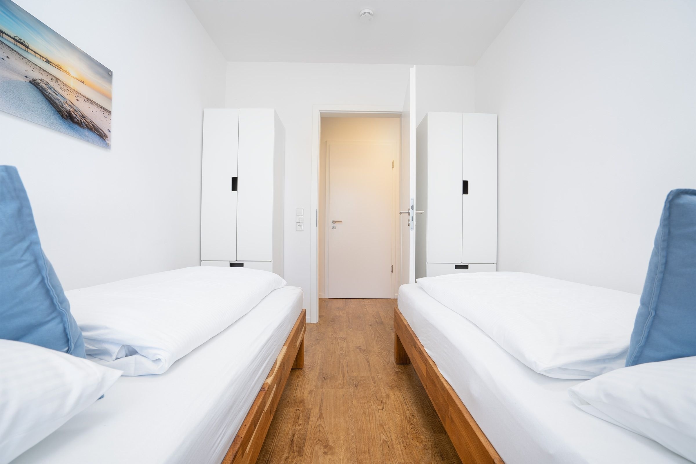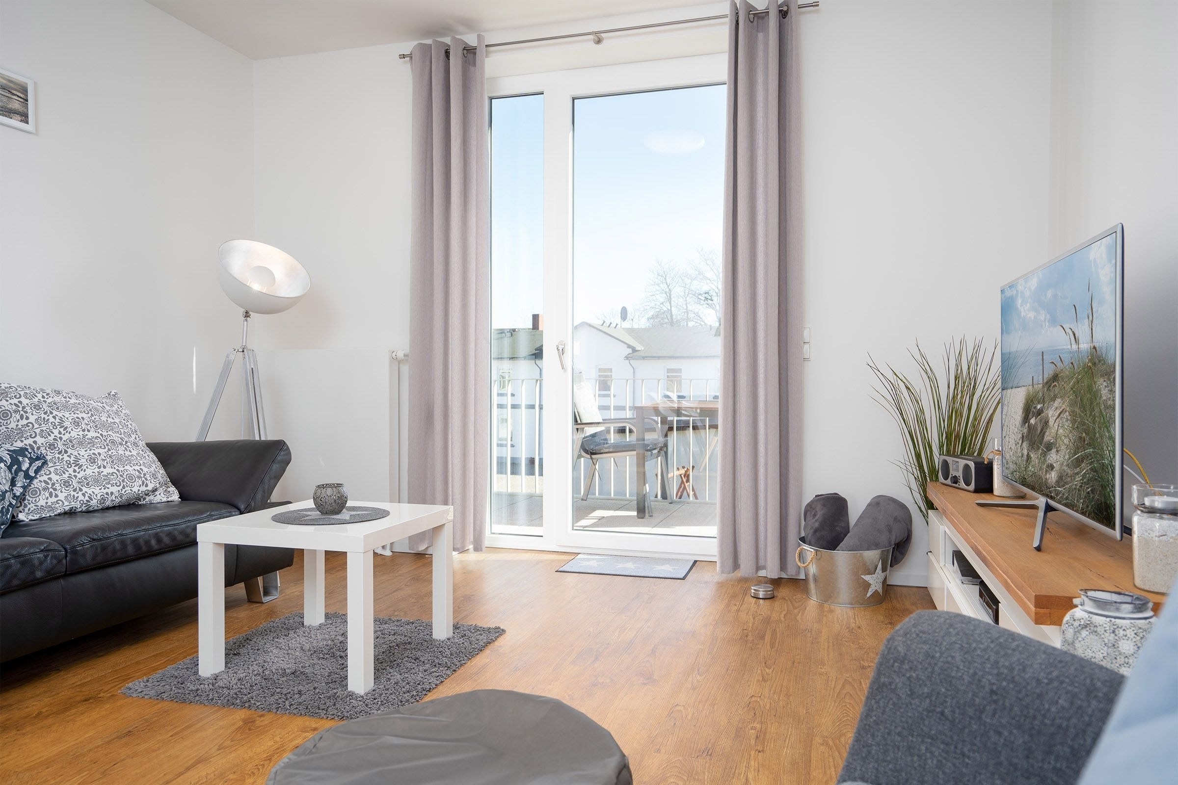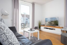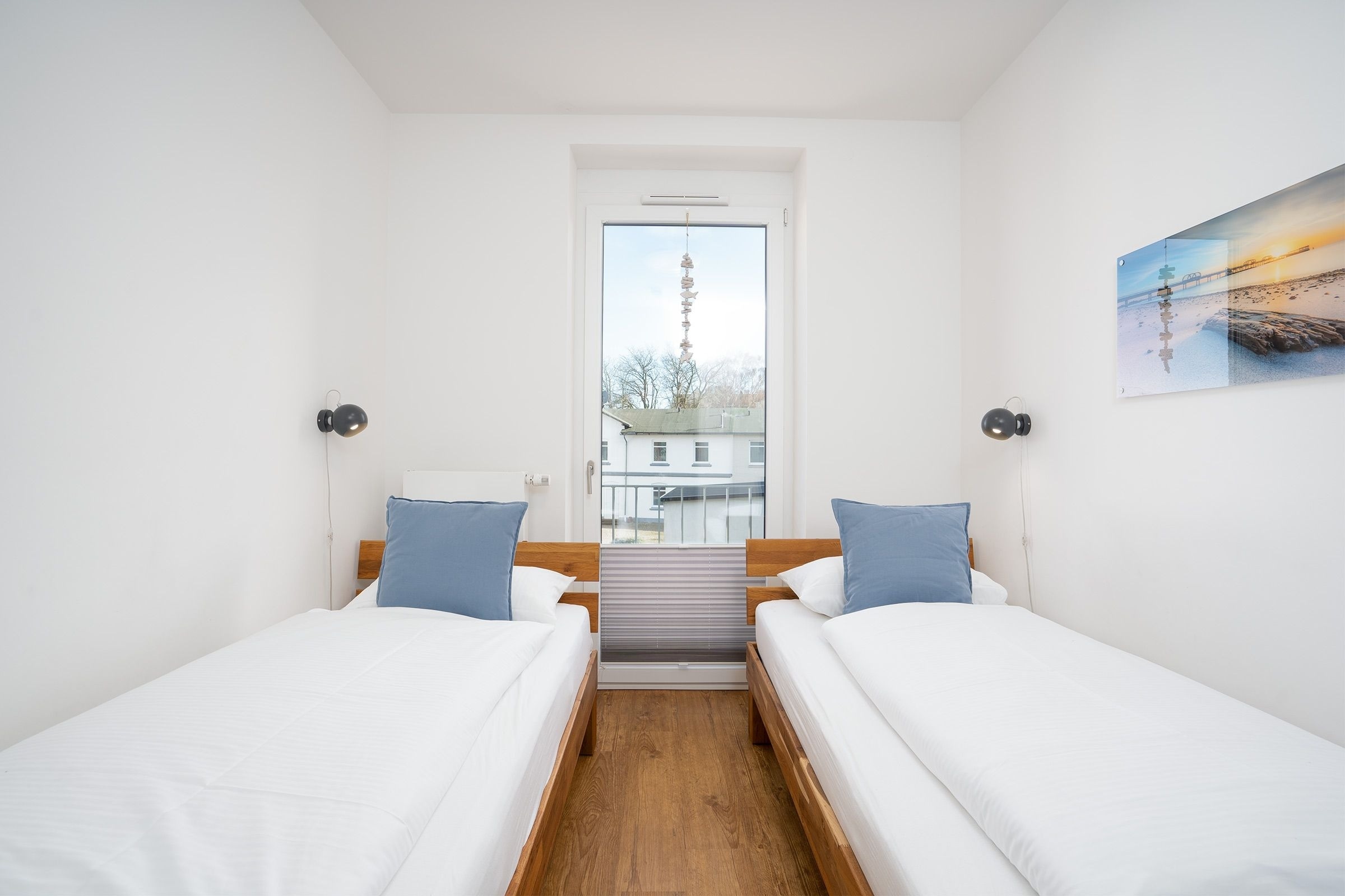Herzlich Willkommen im Urlaub – Dank der liebevoll eingerichteten Einrichtung fühlt man sich hier sofort wohl. Der lichtdurchflutete Wohn-/Essbereich erwartet Sie mit einem schicken Sofa, auf dem Sie gemütliche Fernseh-Abend verbringen können. Nebenan geht es auf den sonnigen Balkon. Nehmen Sie hier Platz und genießen Sie Ihre freie Zeit. Vielleicht bei einem Glas Tee oder Wein? Auch im Wohnbereich steht eine großzügige Sitzecke für Sie bereit. Hier können Sie Ihre Ausflüge entlang der Ostseeküste planen und natürlich auch vorzüglich schlemmen. Die offene, gut ausgestattete Küche mit Induktionsherd und Geschirrspüler bringt Sie als Hobby-Koch bestimmt zum Lächeln. Als zusätzliche Highlights stehen Ihnen eine Espresso-Kapselmaschine (Cafissimo), ein Waffeleisen sowie ein Sandwichtoaster zur Verfügung. Kommen Sie nach einem erlebnisreichen Urlaubstag in den beiden Schlafräumen wunderbar zur Ruhe: Ein Zimmer verfügt über ein Doppelbett (2x 90x200 cm) und einem zusätzlichen TV-Gerät. In dem anderen Zimmer stehen 2 Einzelbetten (je 90x200 cm). Beide Räume haben elektrische Außenrollläden. Das komfortable Badezimmer mit Tageslicht punktet durch eine bodentiefe Dusche und Handtuchwärmer. In einem kleinen Abstellraum befindet sich ein Waschtrockner. Praktisch ist der Personenaufzug im Hause.