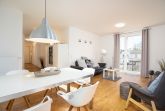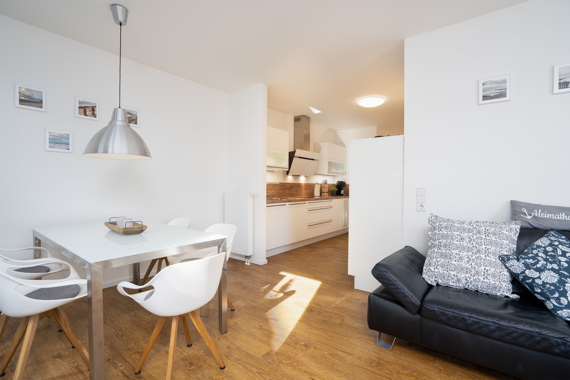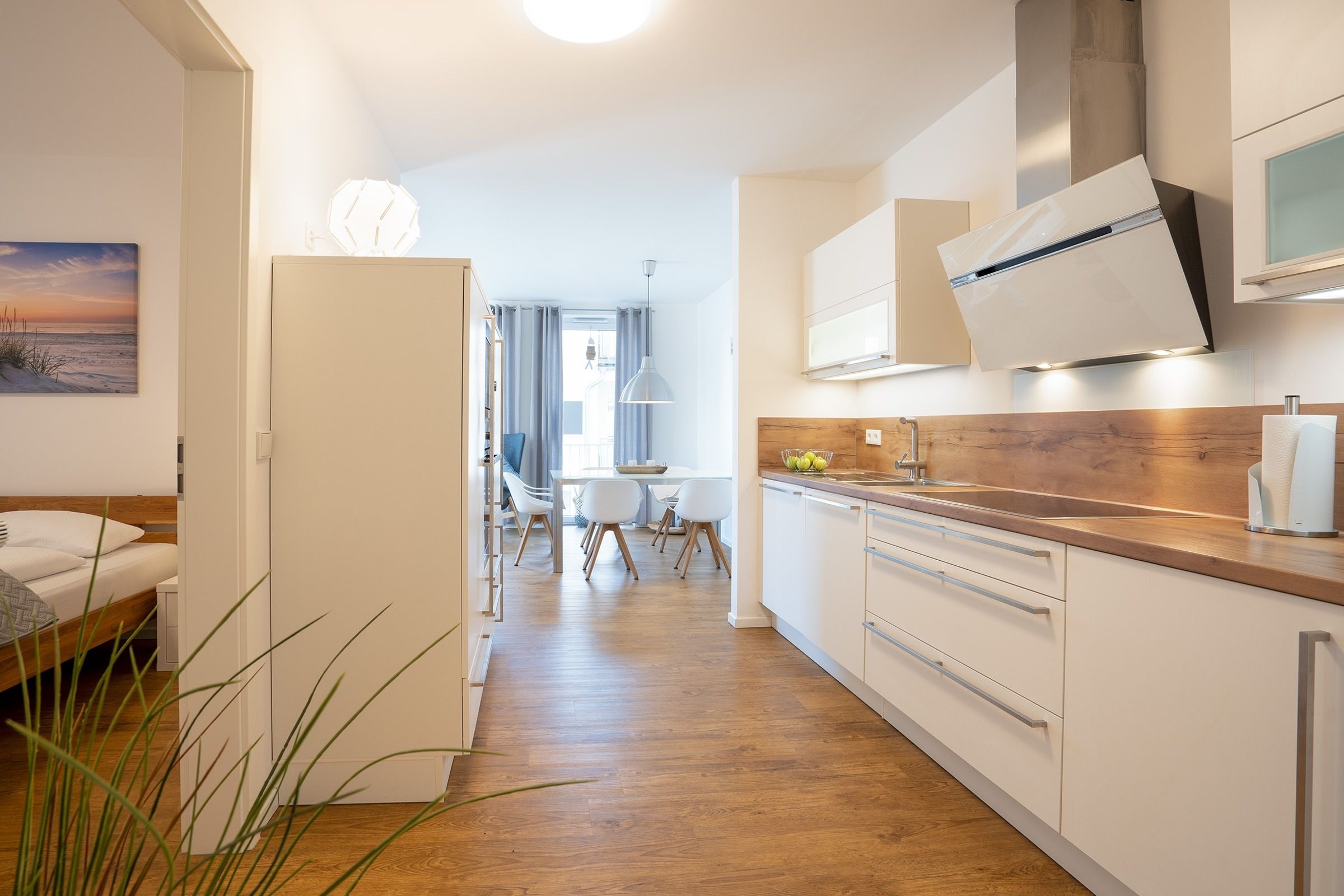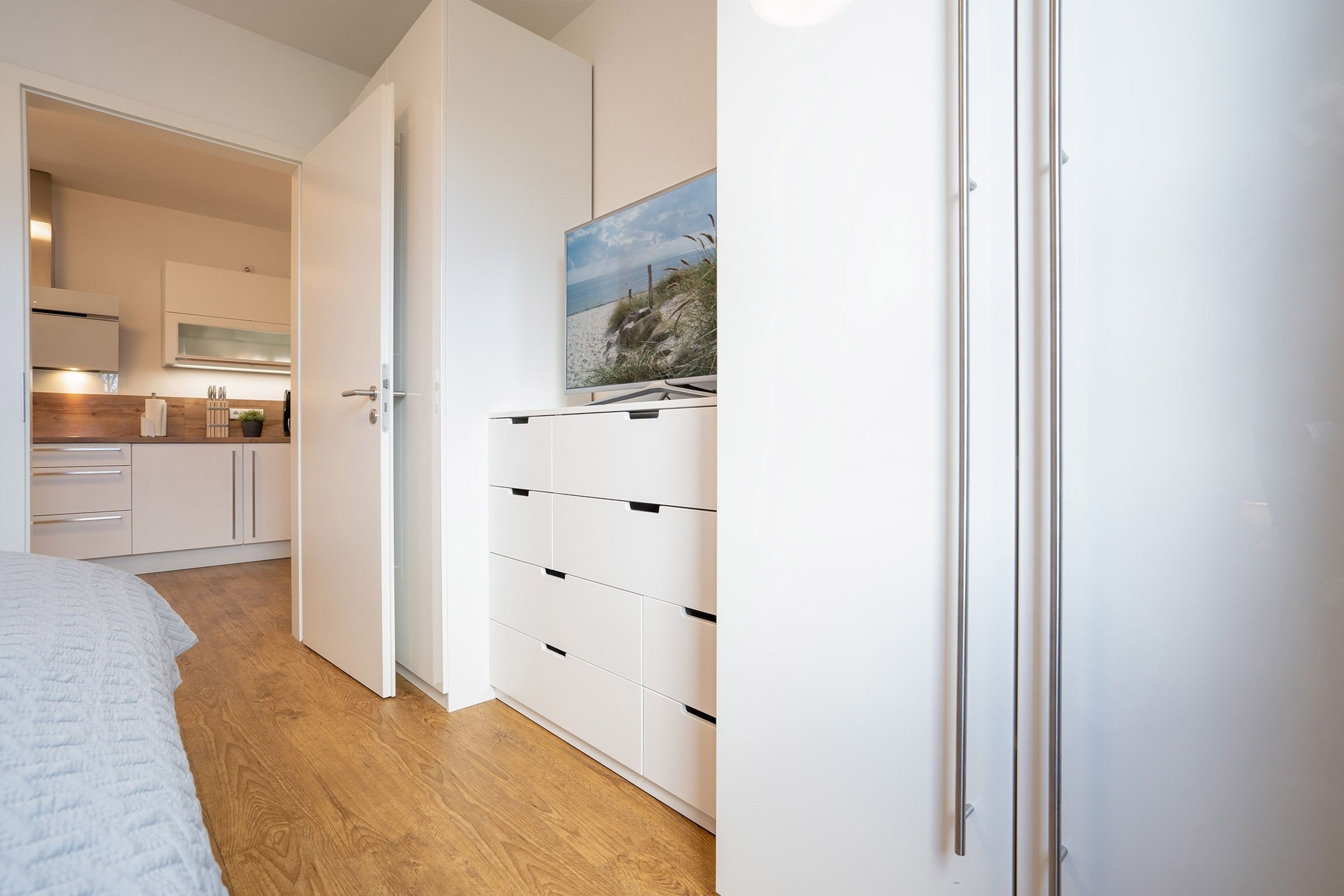 Herzlich Willkommen im Urlaub – Dank der liebevoll eingerichteten Einrichtung fühlt man sich hier sofort wohl. Der lichtdurchflutete Wohn-/Essbereich erwartet Sie mit einem schicken Sofa, auf dem Sie gemütliche Fernseh-Abend verbringen können. Nebenan geht es auf den sonnigen Balkon. Nehmen Sie hier Platz und genießen Sie Ihre freie Zeit. Vielleicht bei einem Glas Tee oder Wein? Auch im Wohnbereich steht eine großzügige Sitzecke für Sie bereit. Hier können Sie Ihre Ausflüge entlang der Ostseeküste planen und natürlich auch vorzüglich schlemmen. Die offene, gut ausgestattete Küche mit Induktionsherd und Geschirrspüler bringt Sie als Hobby-Koch bestimmt zum Lächeln. Als zusätzliche Highlights stehen Ihnen eine Espresso-Kapselmaschine (Cafissimo), ein Waffeleisen sowie ein Sandwichtoaster zur Verfügung. Kommen Sie nach einem erlebnisreichen Urlaubstag in den beiden Schlafräumen wunderbar zur Ruhe: Ein Zimmer verfügt über ein Doppelbett (2x 90x200 cm) und einem zusätzlichen TV-Gerät. In dem anderen Zimmer stehen 2 Einzelbetten (je 90x200 cm). Beide Räume haben elektrische Außenrollläden. Das komfortable Badezimmer mit Tageslicht punktet durch eine bodentiefe Dusche und Handtuchwärmer. In einem kleinen Abstellraum befindet sich ein Waschtrockner. Praktisch ist der Personenaufzug im Hause.