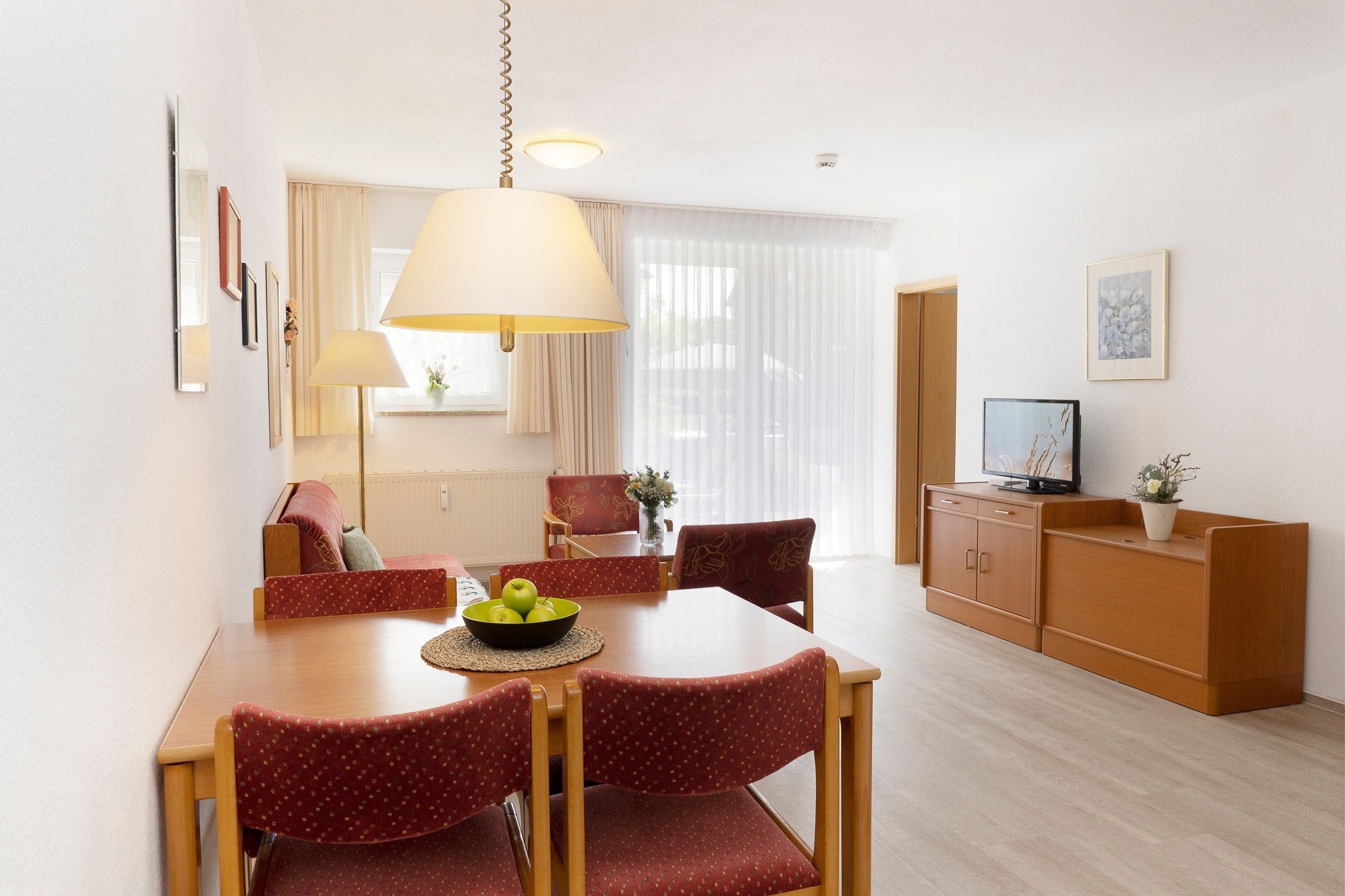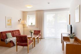 Hell, freundlich und strandnah präsentiert sich die charmante Ferienwohnung Ostseerauschen im gepflegten Ferien-Wohnpark Kaiserhof – nur rund 100 Meter vom Ostseestrand entfernt. Vielleicht können Sie von der Terrasse aus das Wellenrauschen der Ostsee hören? Die zeitlose Polster-Garnitur sowie die farblich passende Ess-Ecke sorgen für eine gemütliche Atmosphäre. Treten Sie näher, Ihr Urlaub kann beginnen. Vermutlich zieht es Sie bei schönem Wetter gleich raus auf die möblierte Terrasse. Wir wäre es hier mit einem guten Frühstück? Auch den restlichen Tag kann man hier wunderbar verbringen. Und sollte die Sonne mal zu stark scheinen, schützt Sie ein Sonnenschirm. Die moderne Küche ist einerseits zum Wohnraum hin offen, andererseits doch für sich in einer praktischen Nische untergebracht. Die Ausstattung mit Spülmaschine dürfte jeden Hobby-Koch erfreuen. Probieren Sie hier typische Rezepte der Region aus. Für die Nacht können Sie die Couch im Wohnzimmer in ein bequemes Doppelbett (2x 80x200 cm) verwandeln. Zudem befindet sich im sogenannten Moltke-Schlafzimmer, es ist von 2 Seiten begehbar, ein schönes Doppelbett (2x 90x200 cm). Das Duschbad ist hell gefliest und verspricht einen guten Start in den Tag.