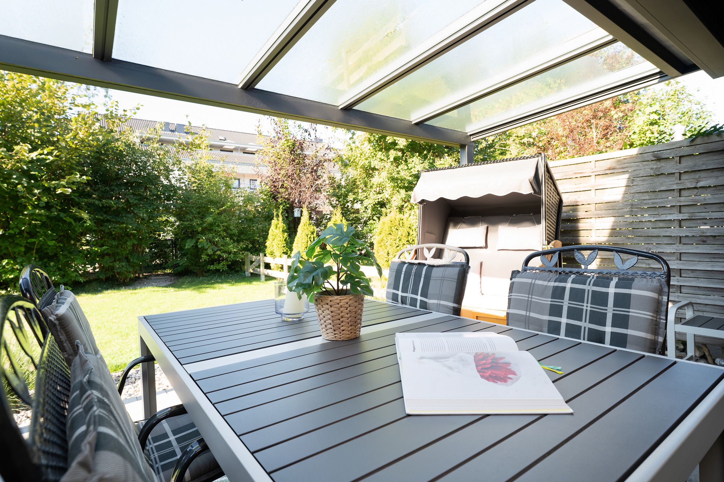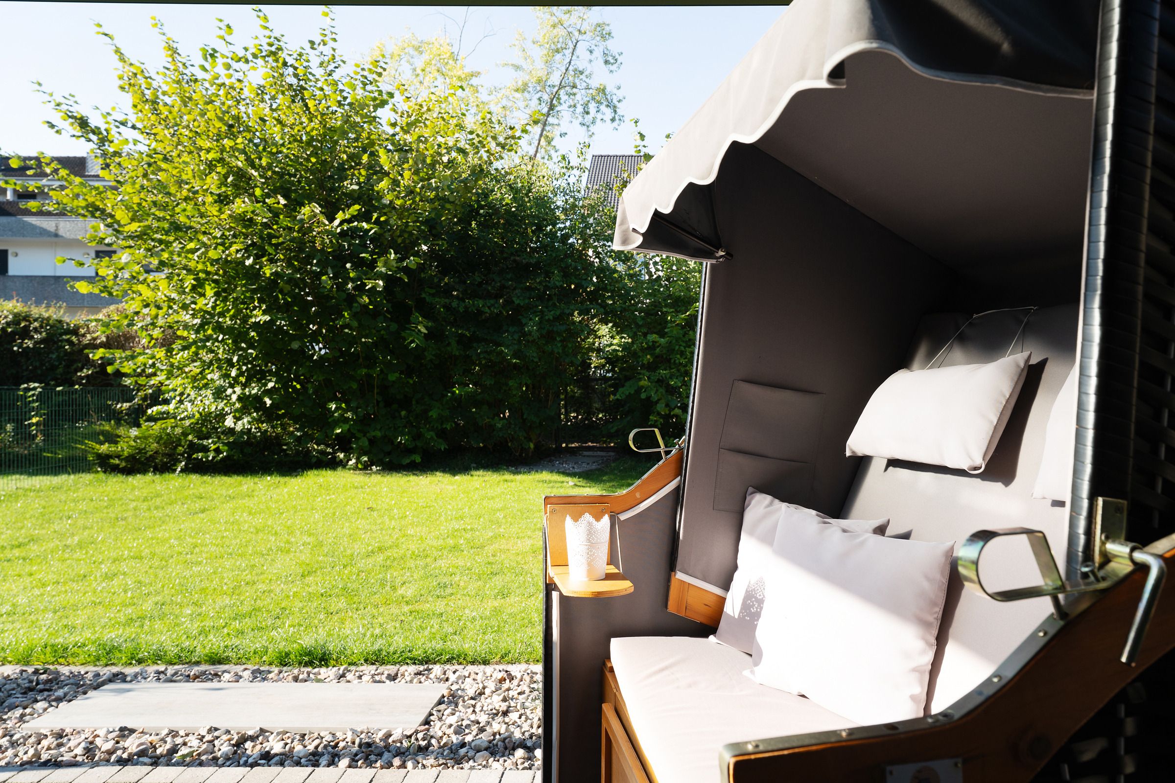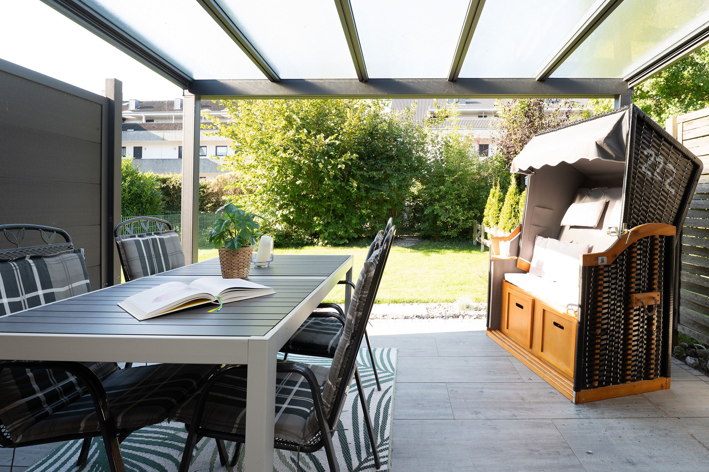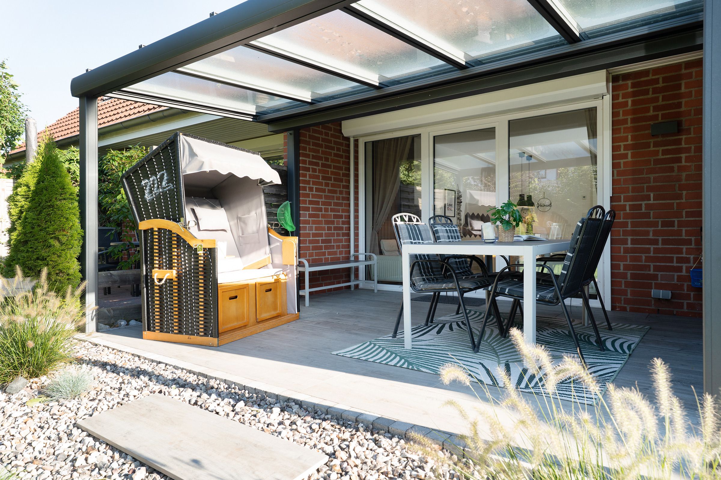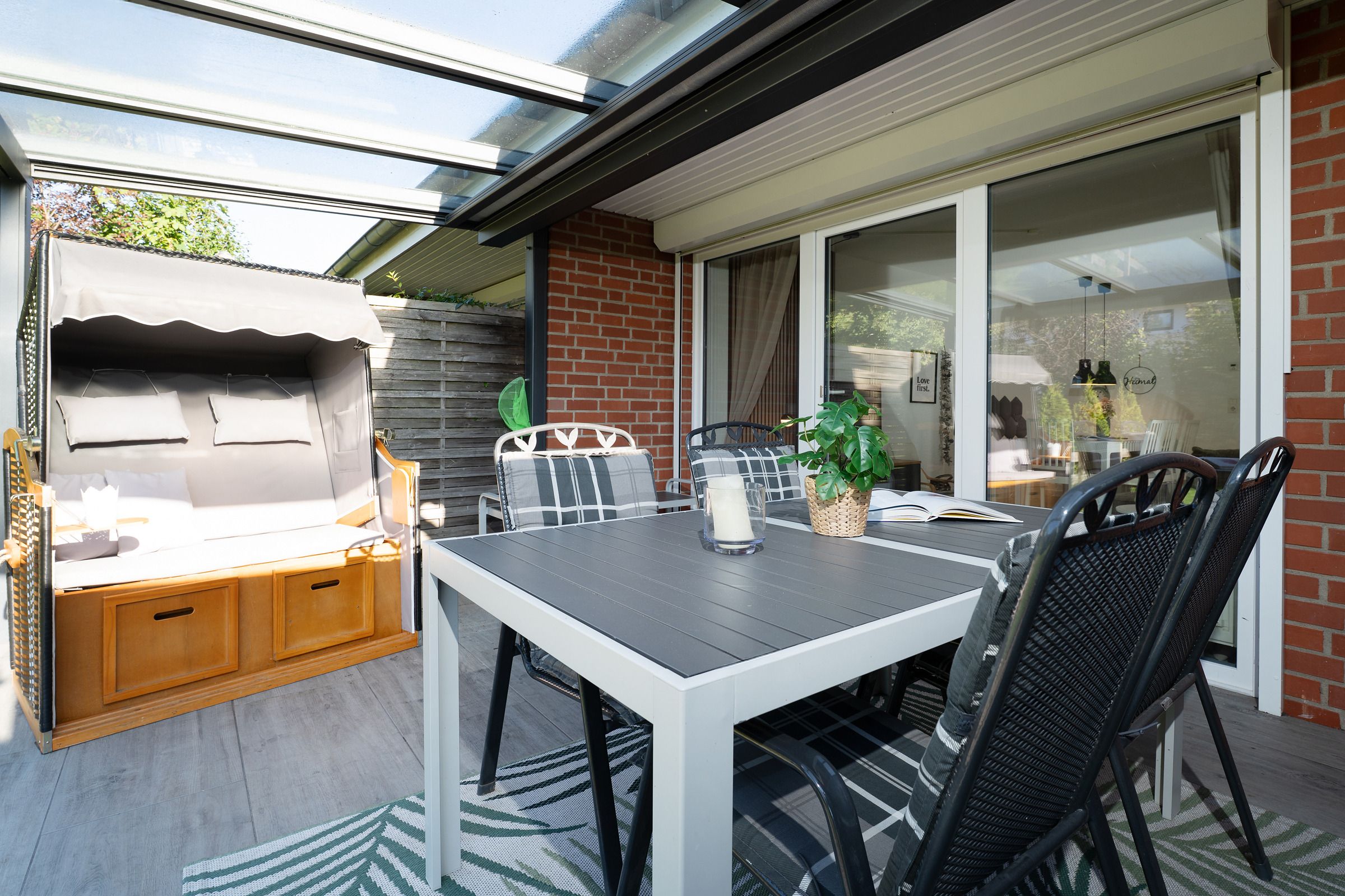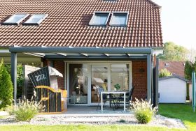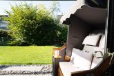 Genießen Sie Ihren Urlaub mit einem guten Buch im eigenen Strandkorb auf der überdachten Süd-Terrasse am Haus. Als zusätzlichen Sonnenschutz können Sie hier eine Markise ausfahren. In der Saison von ca. Mai bis September steht Ihnen je nach saisonalen Witterungsverhältnissen ein Saisonstrandkorb am Strand zur Verfügung.