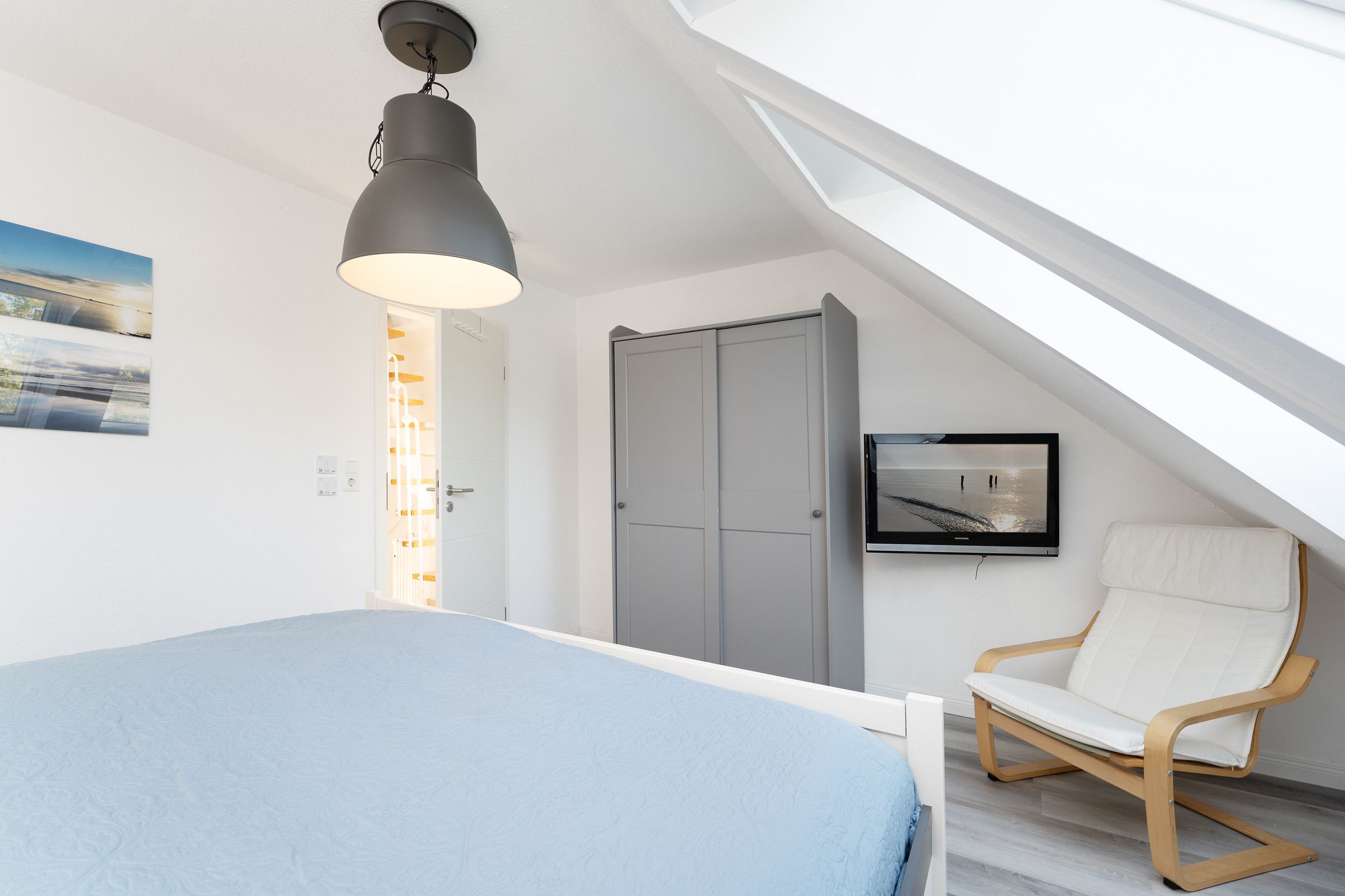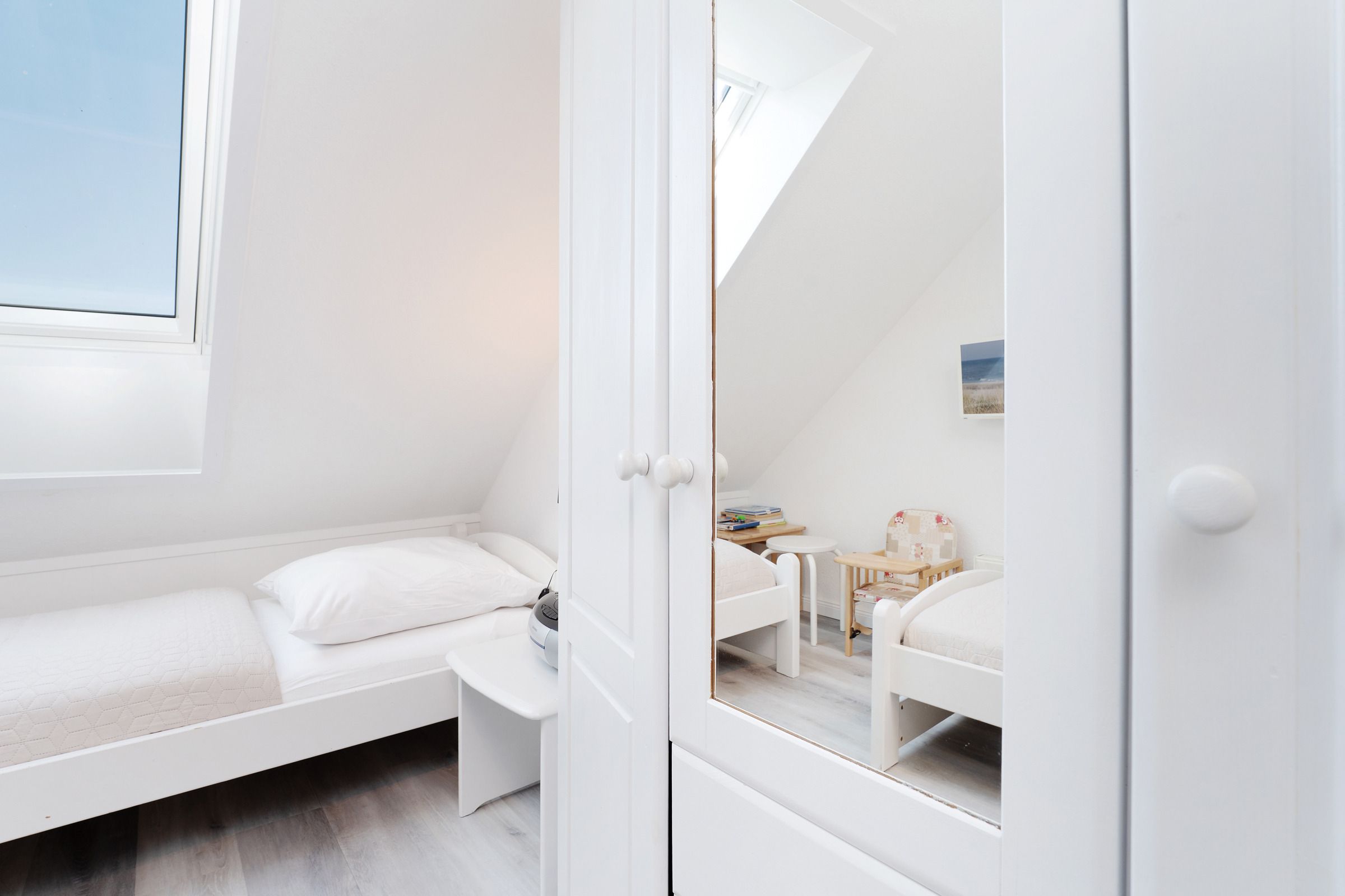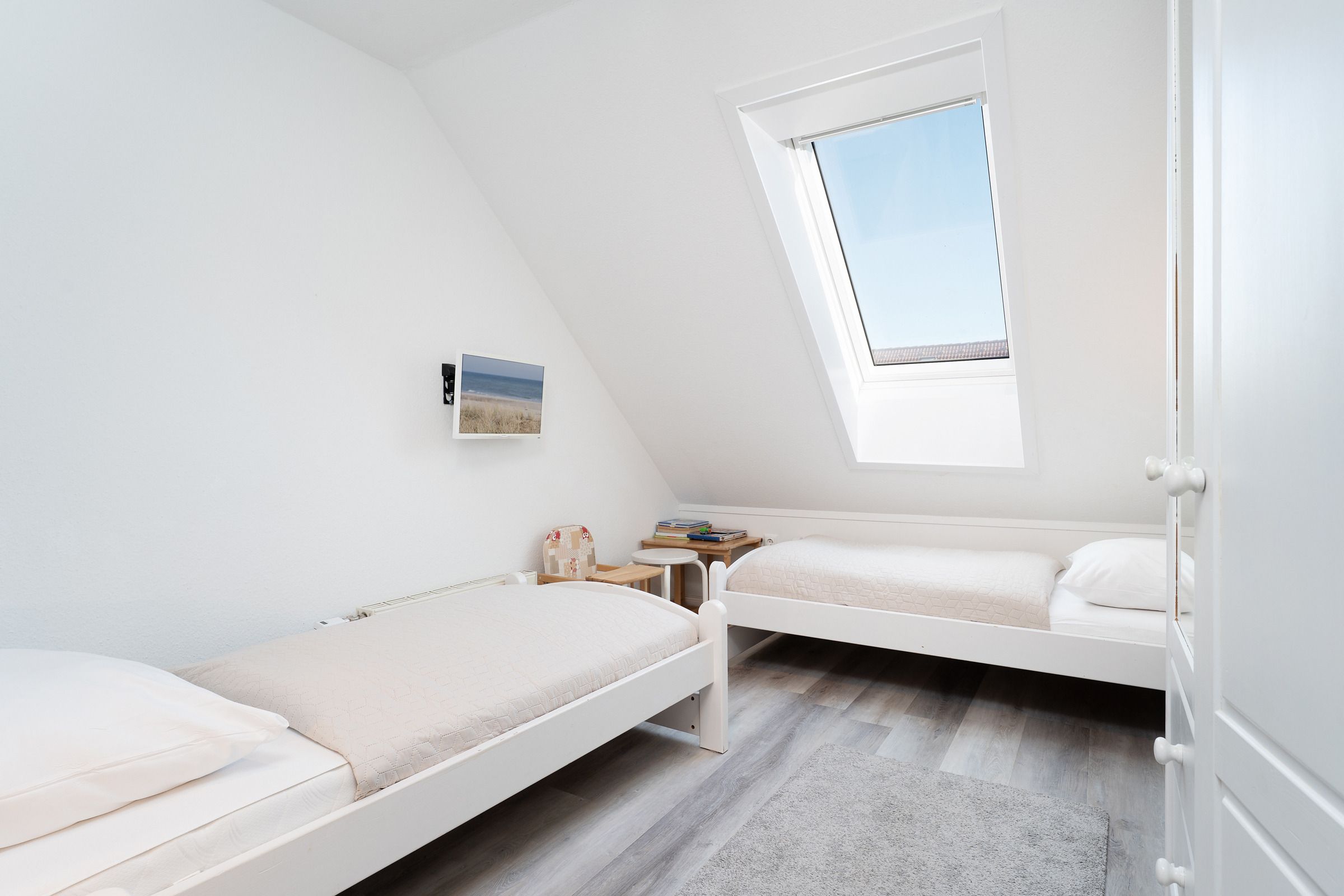 Schlafzimmer 3: (Dachgeschoss): 1 Doppelbett (2x 90x200 cm), Kommode, TV, Verdunkelung (elektrische Rollläden)