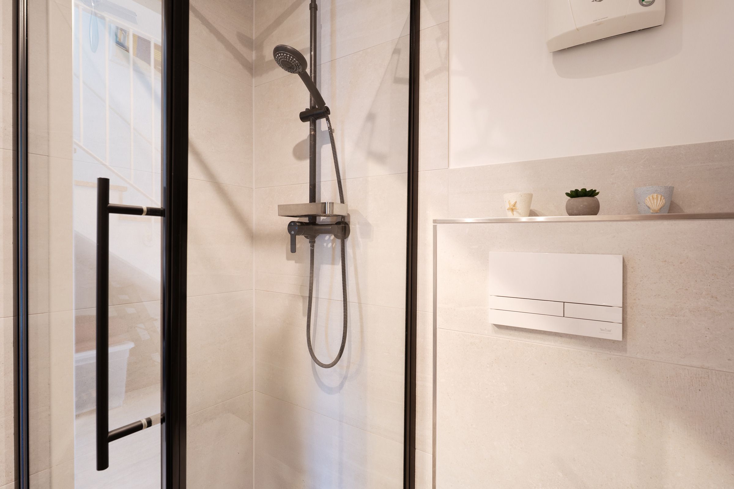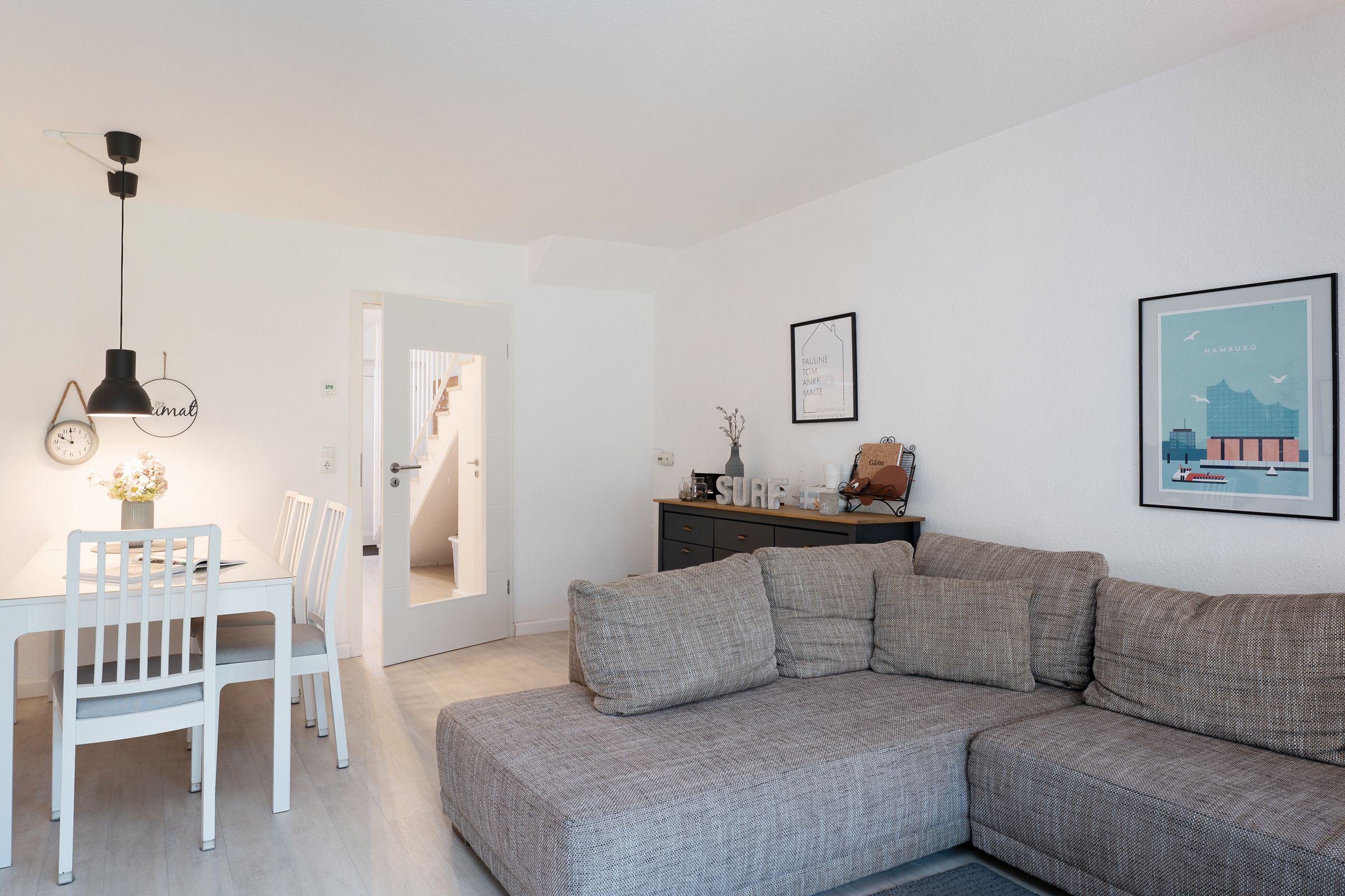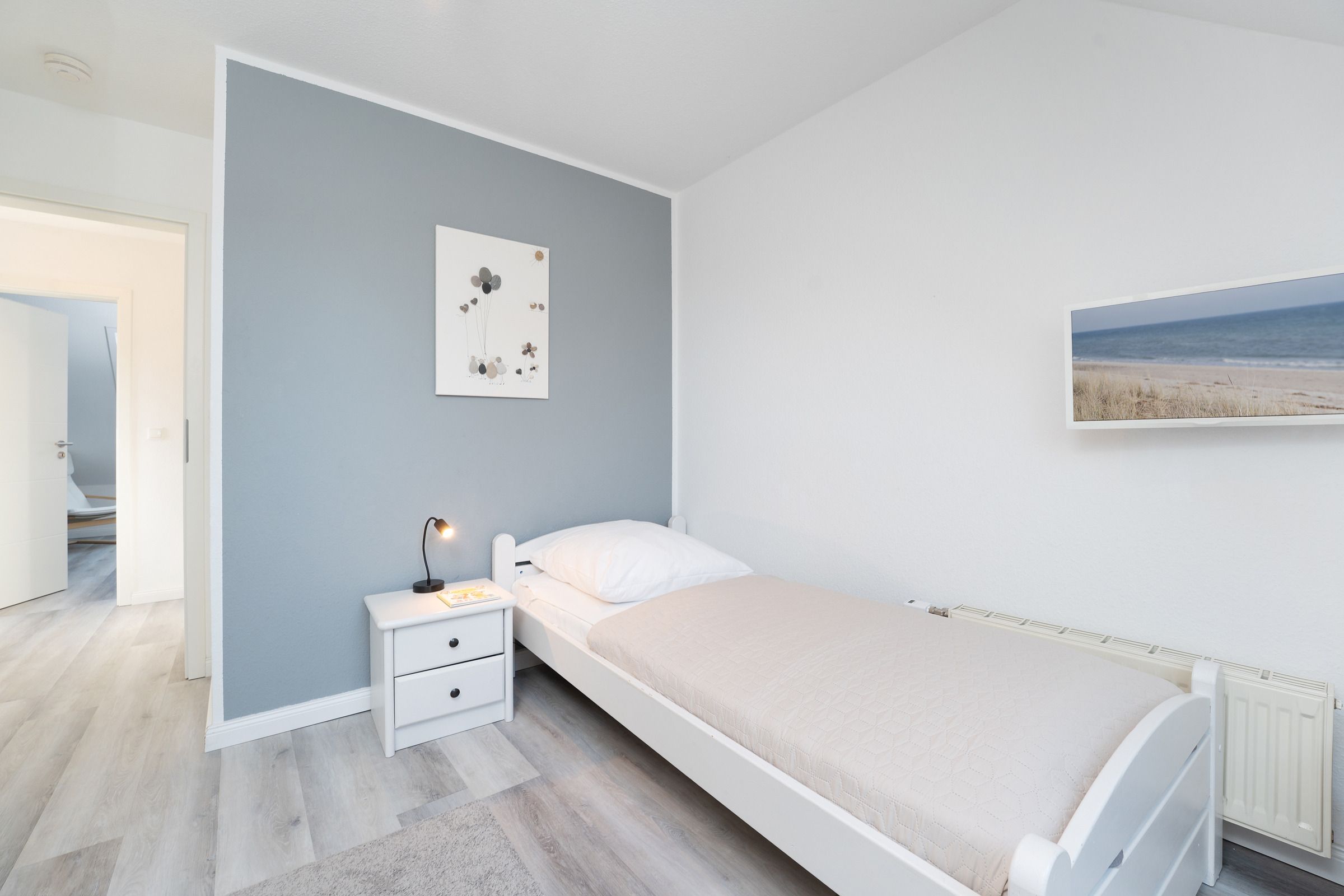Im Erdgeschoss befindet sich das Wohnzimmer mit einer gemütlichen Couch- und Essecke, einem Fernseher und direktem Zugang zur möblierten Terrasse. Die neue Küche vermittelt Strandhaus-Feeling pur und lässt keine Wünsche offen. Die Ausstattung umfasst u. a. einen Backofen, einen Geschirrspüler, eine Einbau-Mikrowelle sowie einen großen Kühlschrank mit Gefrierfach. Weiterhin bietet Ihnen das Erdgeschoss ein modernes Duschbad mit Waschmaschine. Im ersten Obergeschoss stehen Ihnen ein Schlafzimmer mit einem Doppelbett (2x 90x200 cm) und ein weiteres Schlafzimmer mit zwei Einzelbetten (je 90x200 cm) zur Verfügung. Auf dieser Etage ist ein weiteres Badezimmer mit Dusche vorhanden. Im Dachgeschoss befindet sich ein zusätzliches, helles Schlafzimmer mit einem Doppelbett (2x 90x200 cm) und einer Kommode. Die Dachfenster verfügen über elektrische Außenrollläden. Der WLAN-Anschluss ist für Sie inklusive.