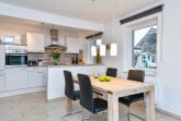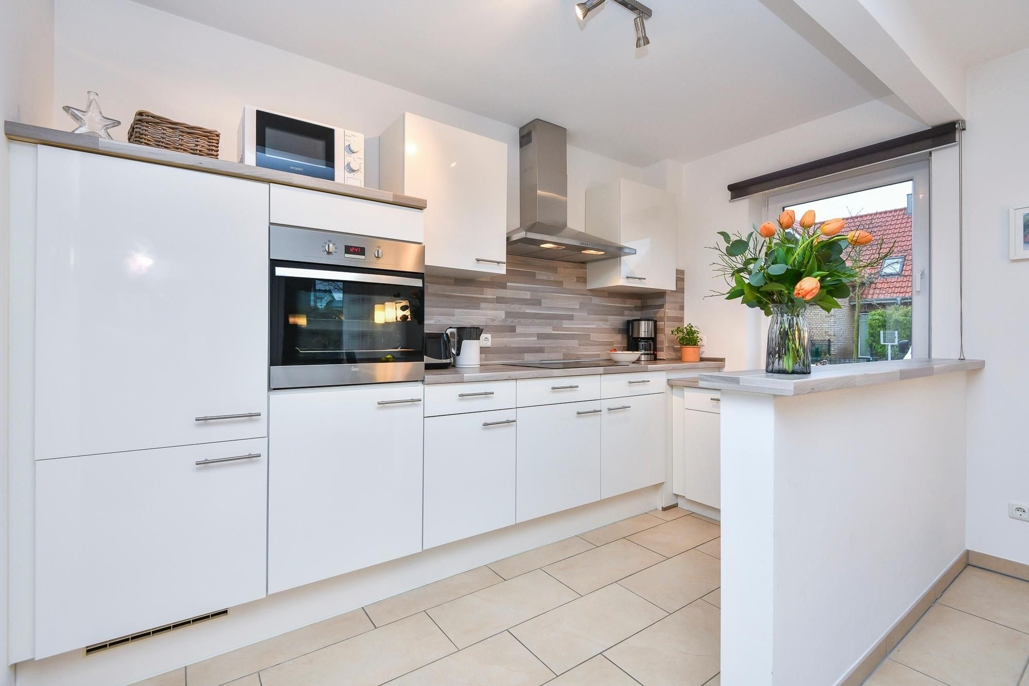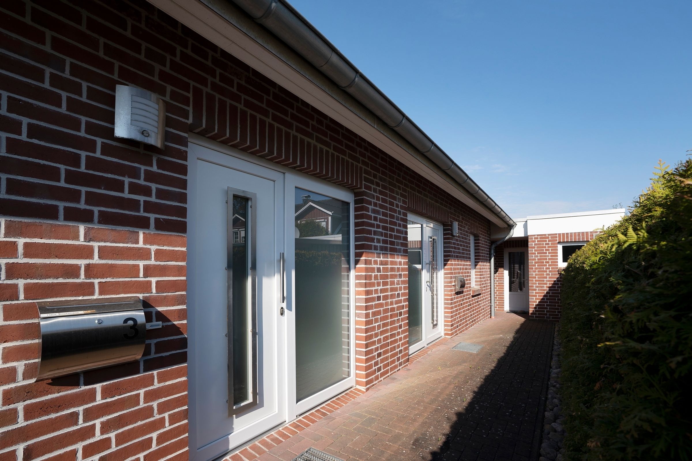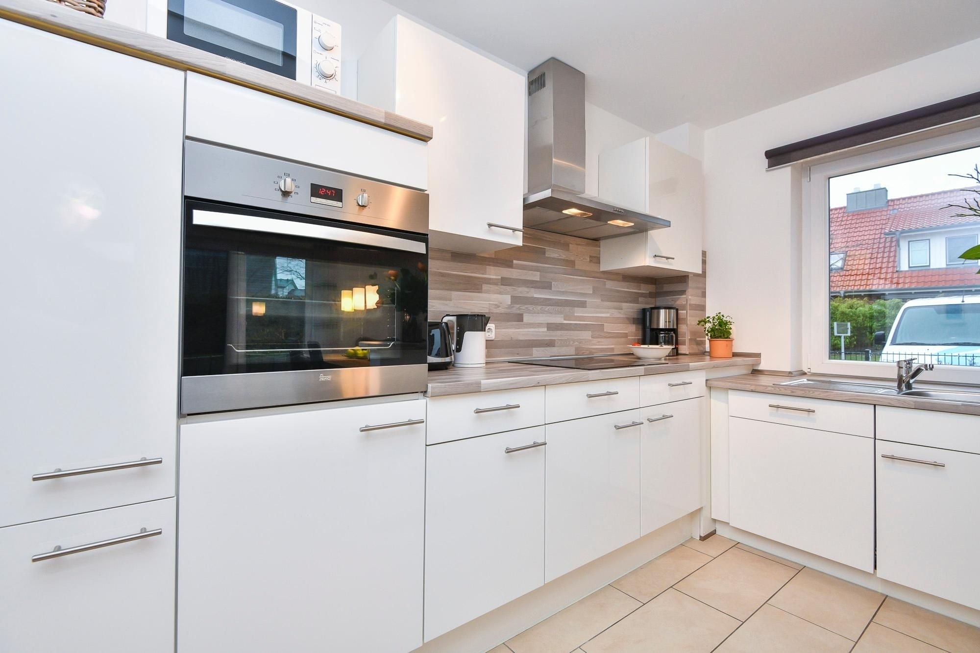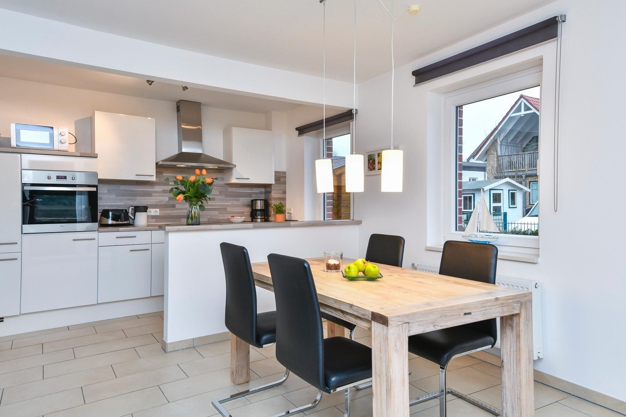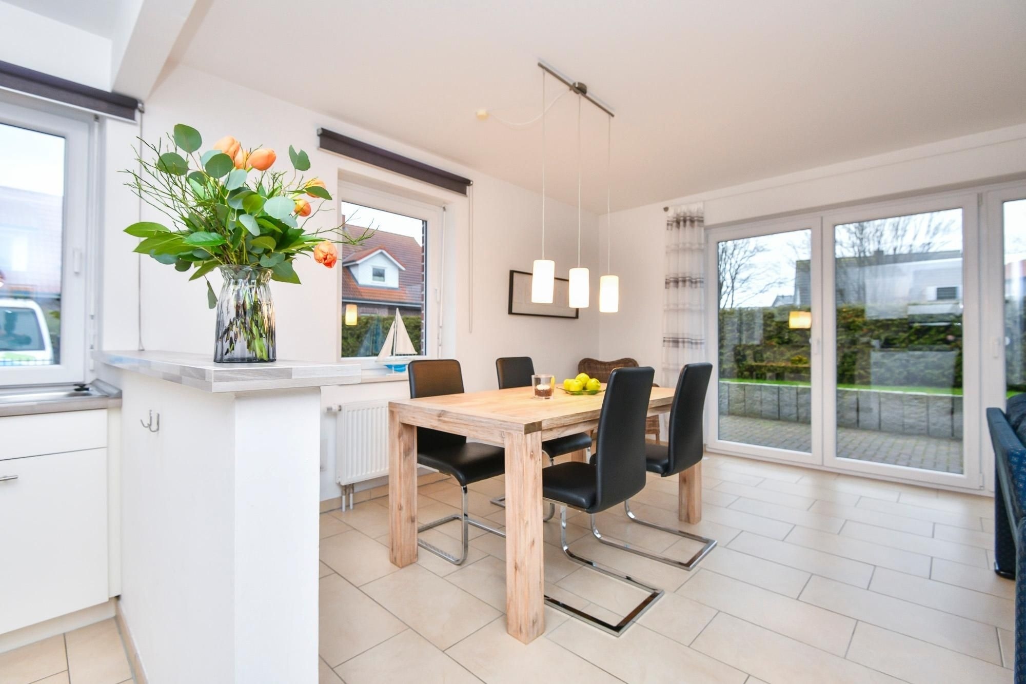 Das Ferienhaus Bootsmann empfängt Sie mit moderner, ansprechender Ausstattung. Im offenen Wohn-, Ess- und Kochbereich verbringen Sie entspannte Stunden auf der einladenden Sofalandschaft oder lassen sich am Esstisch die selbst zubereiteten Mahlzeiten schmecken. Mit einem spannenden Buch können Sie es sich auf der sonnigen, möblierten Terrasse bequem machen. Im Obergeschoss schlafen Sie im Hauptschlafzimmer in einem komfortablen Doppelbett (2x 90x200 cm). Im Kleiderschrank verstauen Sie Ihre Urlaubsgarderobe. Im zweiten Schlafzimmer tanken Sie in 2 Einzelbetten (2x 90x200 cm) neue Energie. Um Stress am Morgen zu vermeiden, gibt es im Erd- und im Obergeschoss jeweils ein Duschbad mit Tageslicht. In den beiden Bädern und im Wohnzimmer sorgt eine Fußbodenheizung für wohlige Wärme. Außerdem genießen Sie dank Entkalkungsanlage im ganzen Haus weiches Wasser.