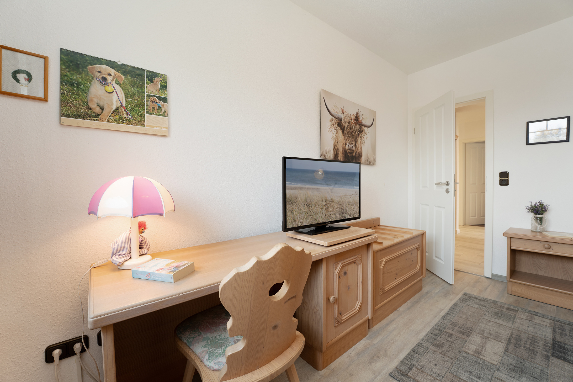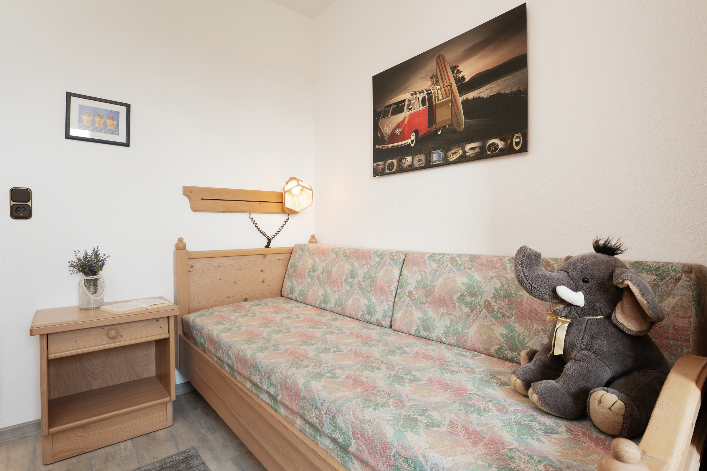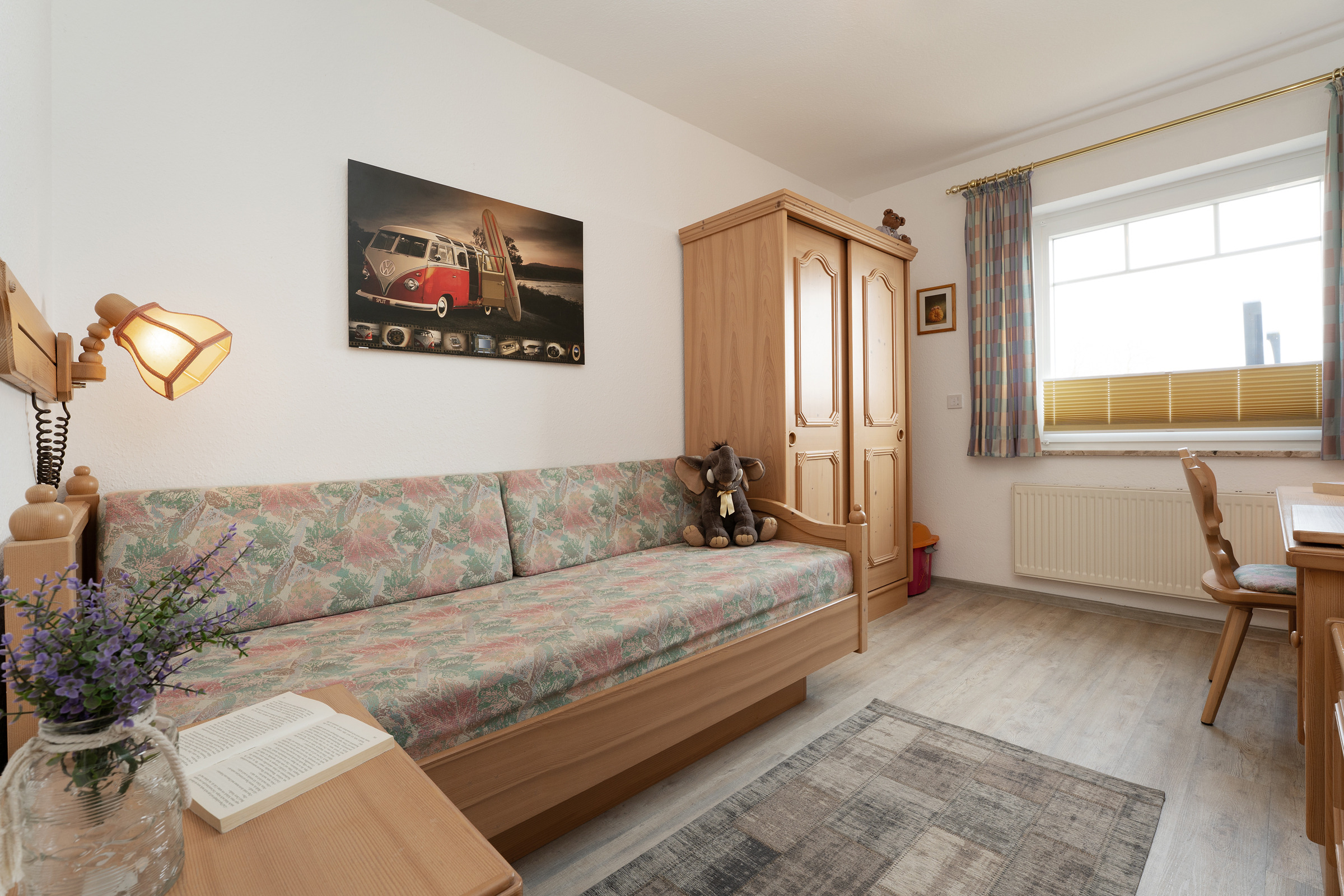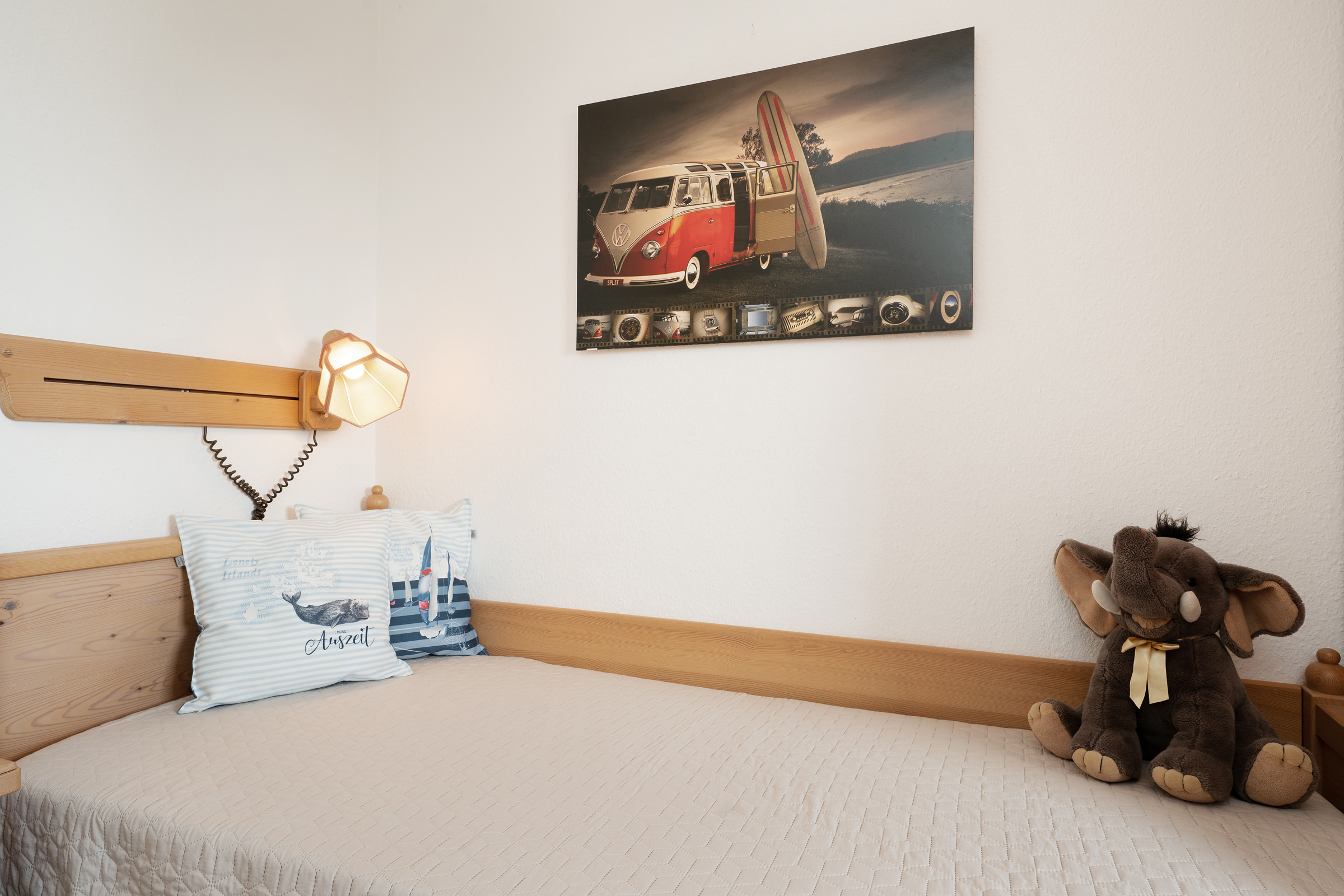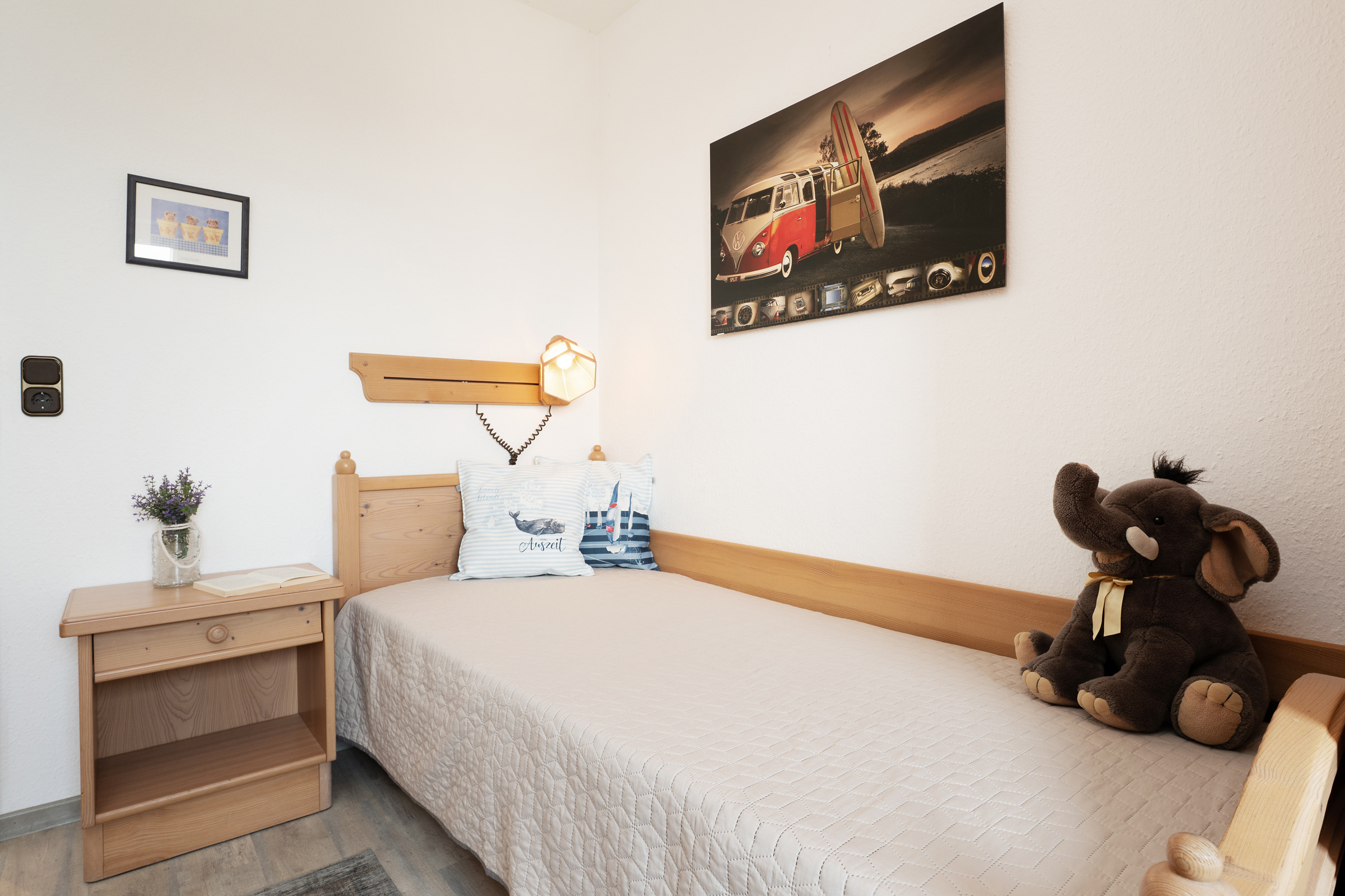 Schlafzimmer 3: 1 Einzelbett (90x200 cm), Kleiderschrank, TV, Verdunkelung (Plissee und Vorhang)