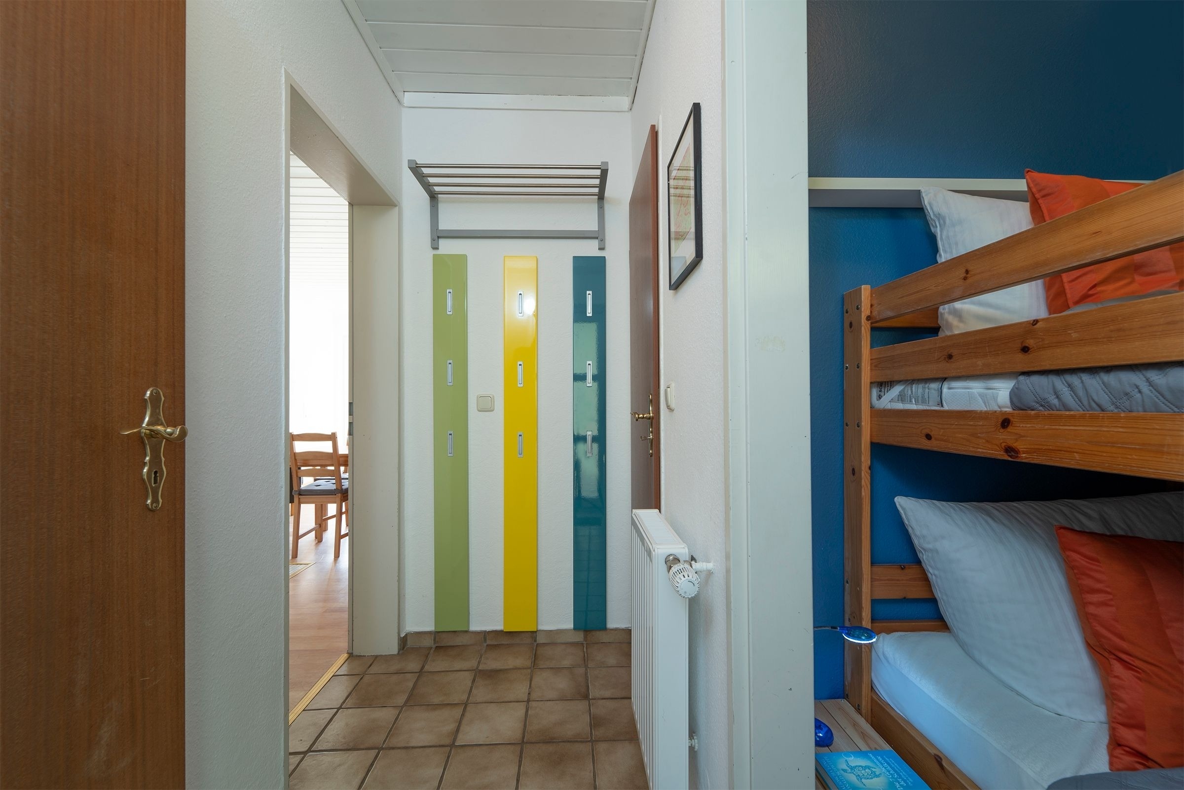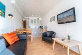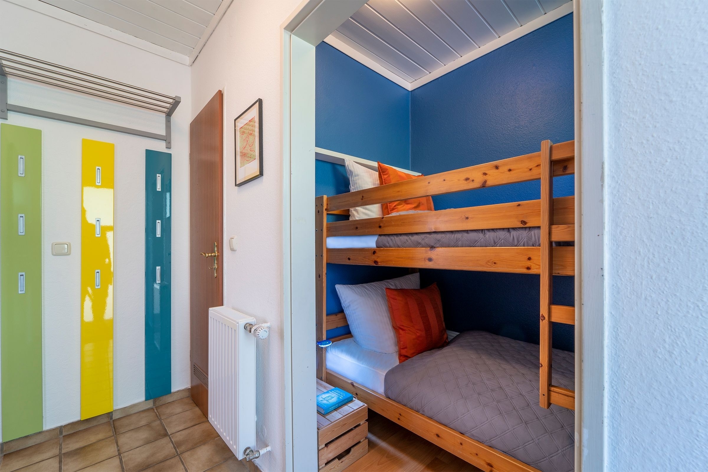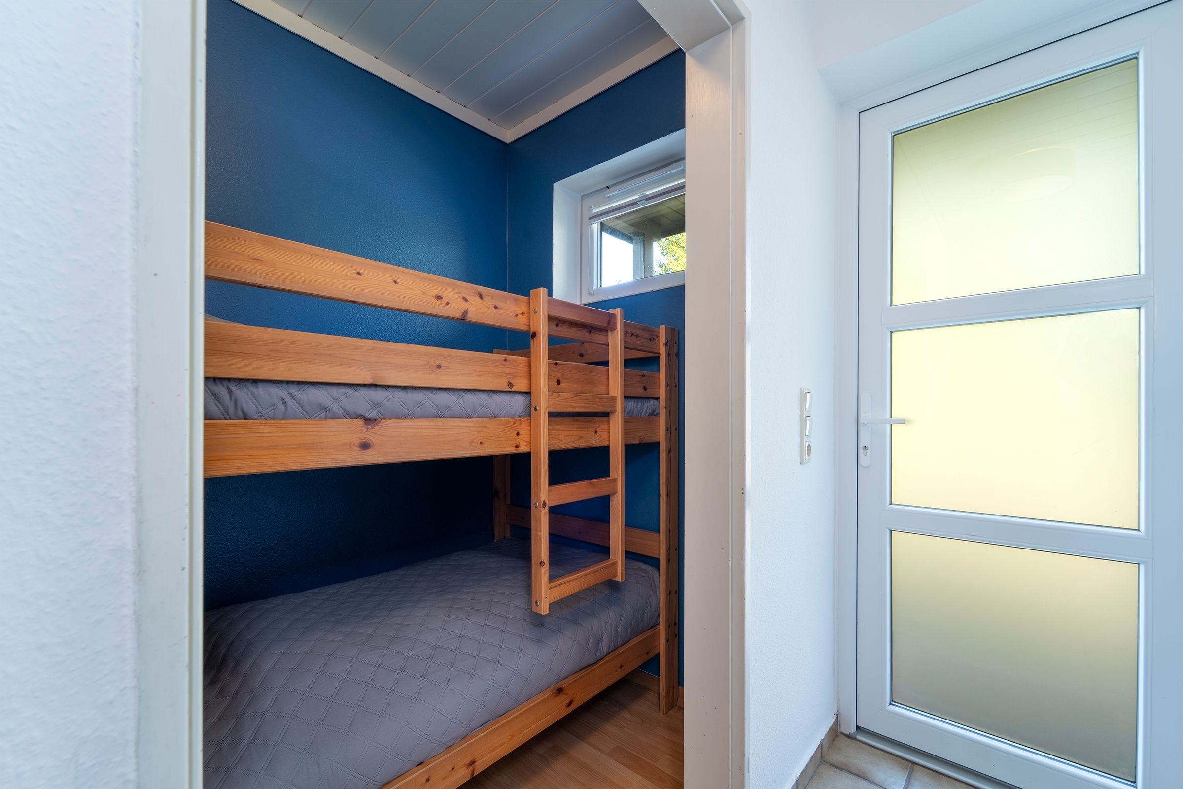 Dieses Feriendomizil verfügt über ein separates Schlafzimmer mit Doppelbett (160x200 cm, durchgehender Topper), ein Wohnzimmer mit offener Küche (ausgestattet mit Herd, Kombigerät (Backofen und Mikrowelle in Einem), Kühlschrank mit Gefrierfach etc.) und Zugang zur Terrasse mit anliegendem Garten zur Gemeinschaftsnutzung. Eine gemütliche Schlafnische mit Etagenbett (je 90x200 cm) sorgt für weitere Schlafmöglichkeiten.