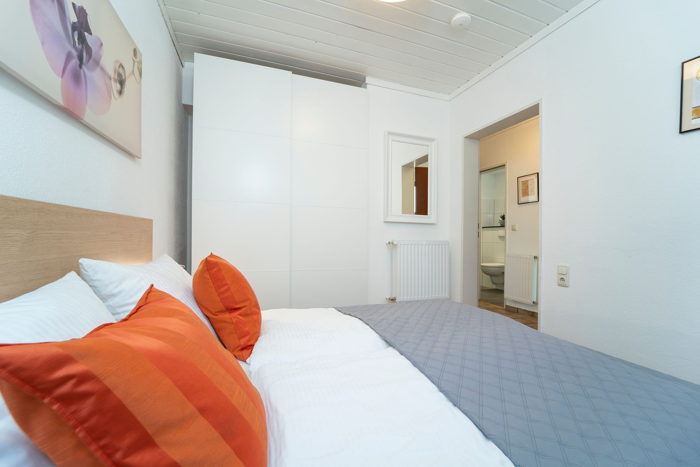 Schlafzimmer: 1 Doppelbett (160x200 cm, durchgehender Topper), Kleiderschrank, Verdunkelung