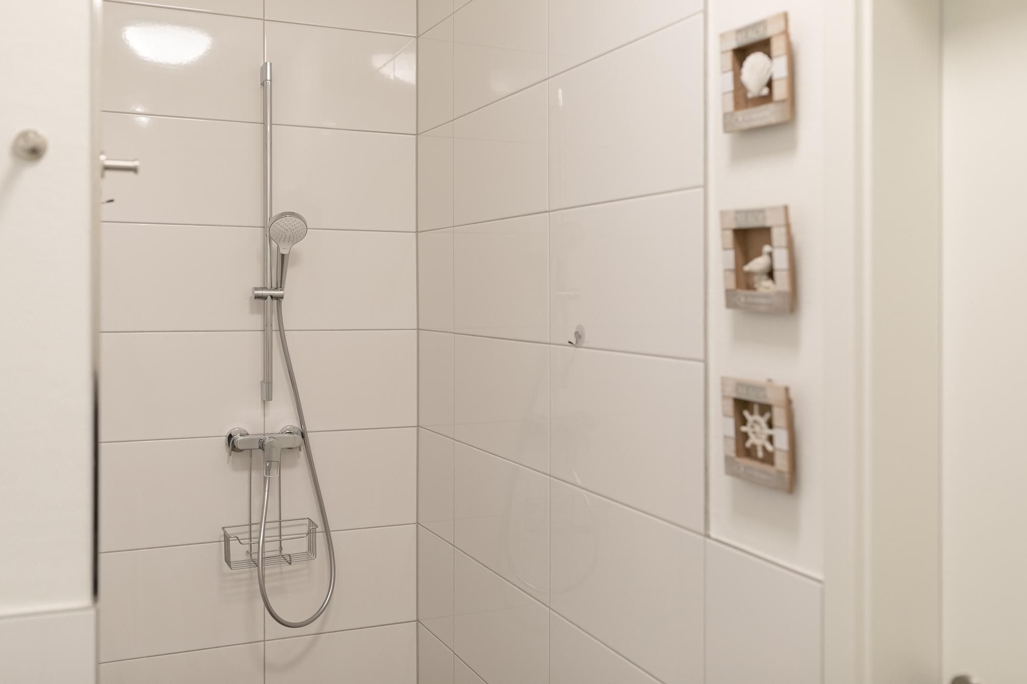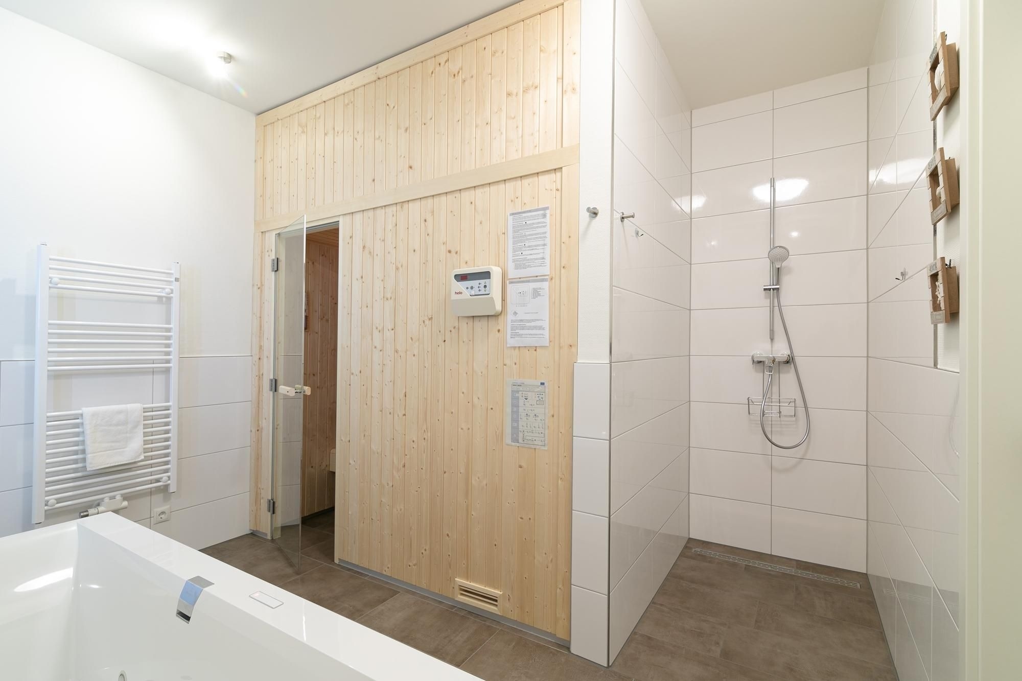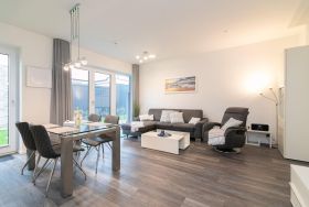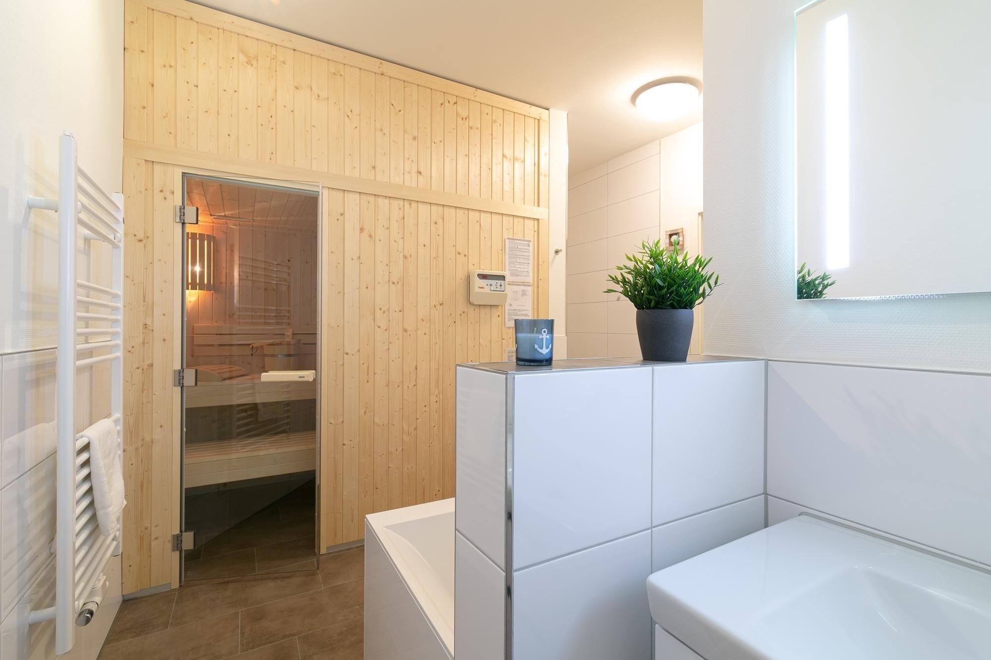 Ankommen, auspacken und sich wohlfühlen. Die moderne Wohnung Ankerplatz besticht durch ihre edle Ausstattung im maritimen Look. Hier fühlt man sich sofort wie im Urlaub. Genießen Sie den großzügigen Wohn-/Essbereich. Von der kuscheligen Sofa-Landschaft und auch von der schicken Sitzecke aus haben Sie einen Blick auf das TV-Gerät, was durchaus praktisch sein kann. Doch wenn man ehrlich ist, ist es doch draußen an der frischen Luft immer noch am schönsten: Zum gemütlichen Verweilen lädt die großzügige Terrasse ein. Lassen Sie hier den Abend bei guten Gesprächen ausklingen. Ein Grill sorgt dabei für eine kulinarische Abwechslung. Die moderne Küche mit Spülmaschine ist gut ausgestattet und im Wohnbereich integriert. Wunderbar träumen werden Sie sicher in den beiden Schlafräumen. Ein Zimmer verfügt über ein Boxspringbett (2x 90x200 cm) mit durchgängigem Topper, das zweite über 2 Einzel-Boxspringbetten (je 90x200 cm) – in beide Schlafzimmern steht jeweils ein TV-Gerät. Das großzügige Bad mit Sauna und Whirlwanne bietet auch an kälteren Tagen Wärme und Entspannung. Zusätzlich gibt es ein Gäste-WC sowie einen kleinen Abstellraum mit Waschmaschine. Ein bequemes Plus ist der Personenaufzug im Hause.