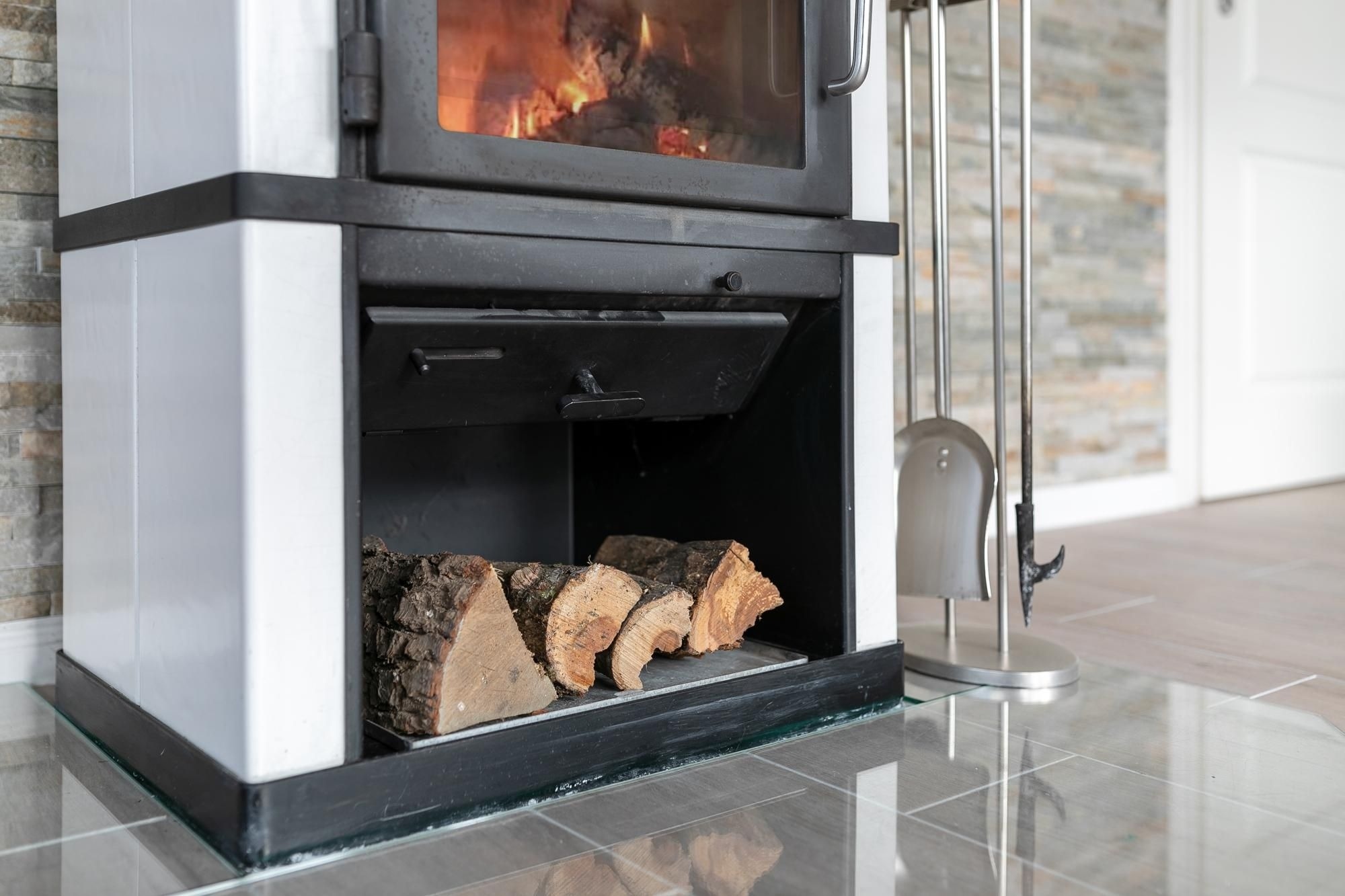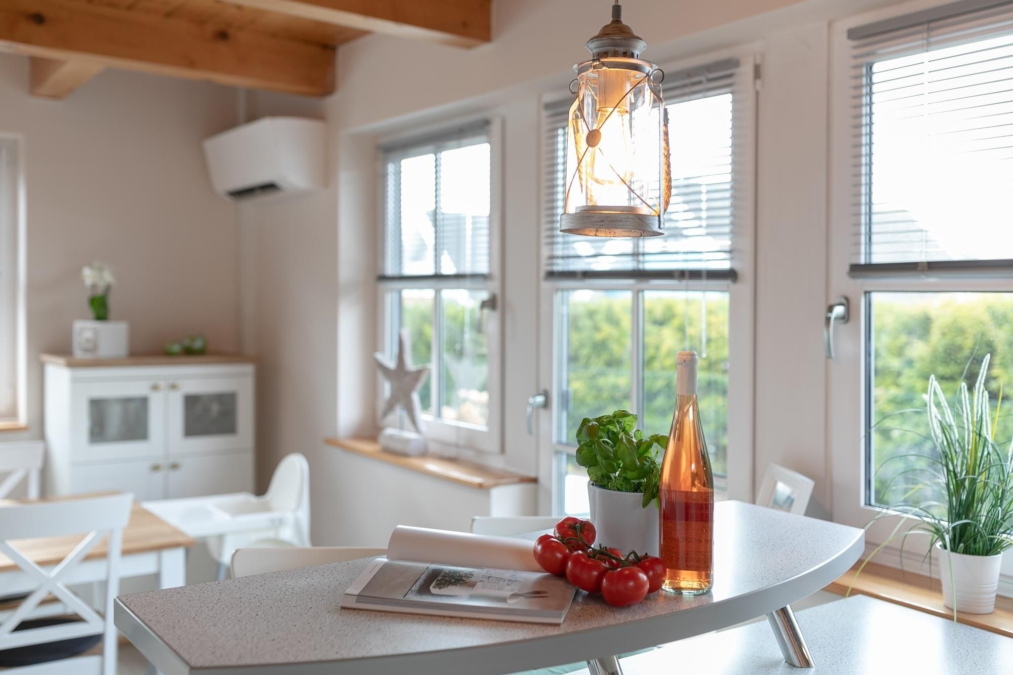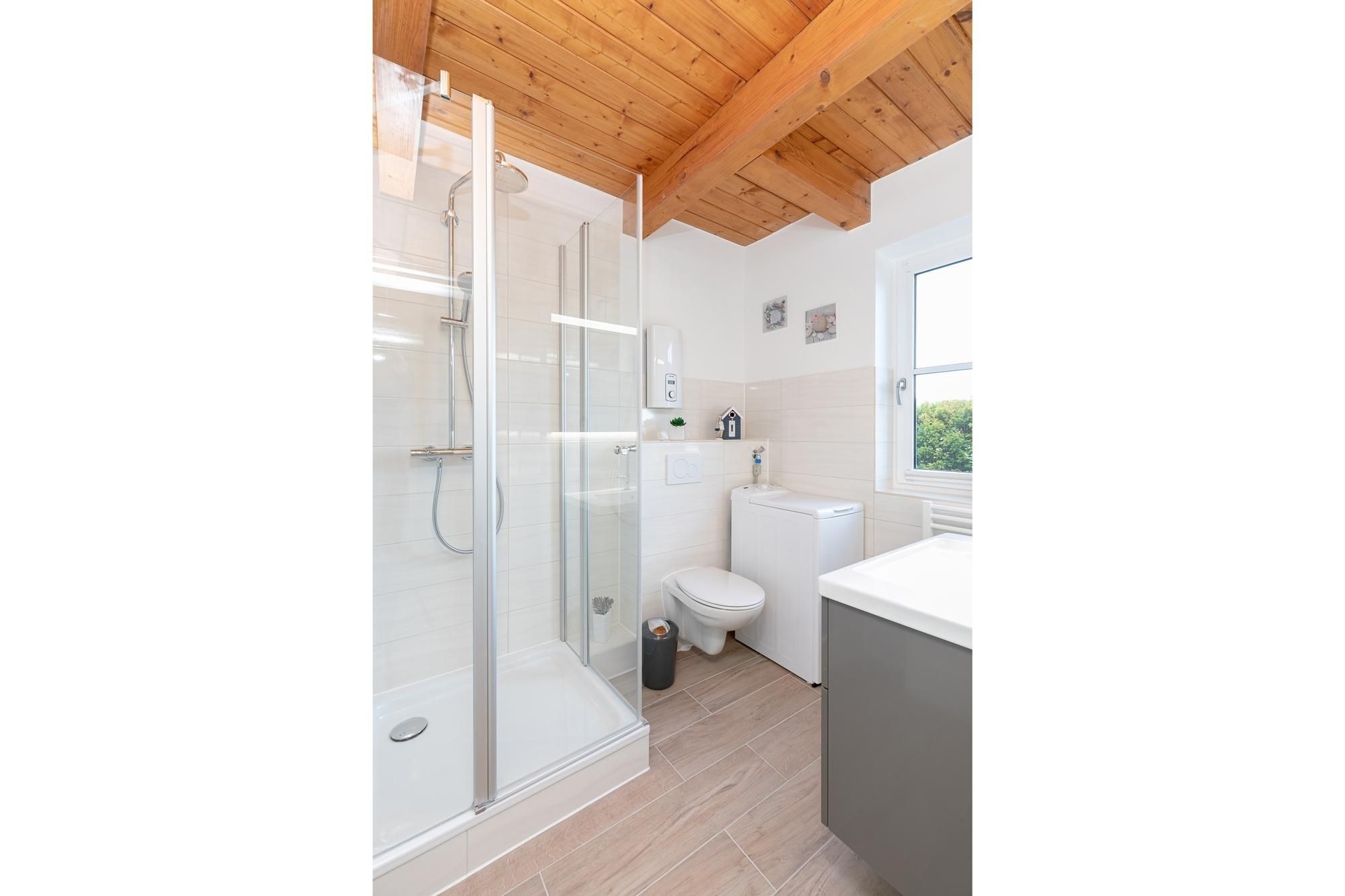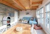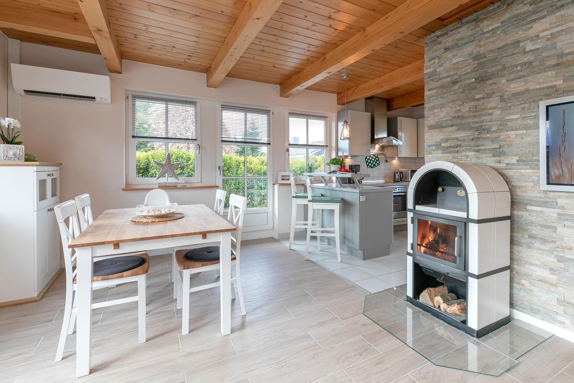 Das Erdgeschoss umfasst einen Windfang, einen Abstellraum unter der Treppe, ein helles Duschbad sowie ein Wohnzimmer mit stilvoller Steinwand und Kaminofen für die gemütlichen Stunden im Herbst und Winter. Die Küche mit ansprechendem Esstresen ist in den Wohnbereich integriert. Eine offene Holzbalkendecke sorgt für Atmosphäre und unterstreicht den Stil des Hauses. Sowohl vom Wohnzimmer als auch von der Küche führen direkte Zugänge auf die Terrassen und in den vollständig eingezäunten Garten, der sich somit Ideal für Urlauber mit Hund eignet.
