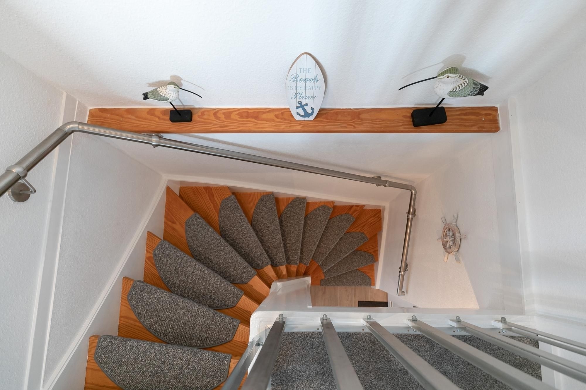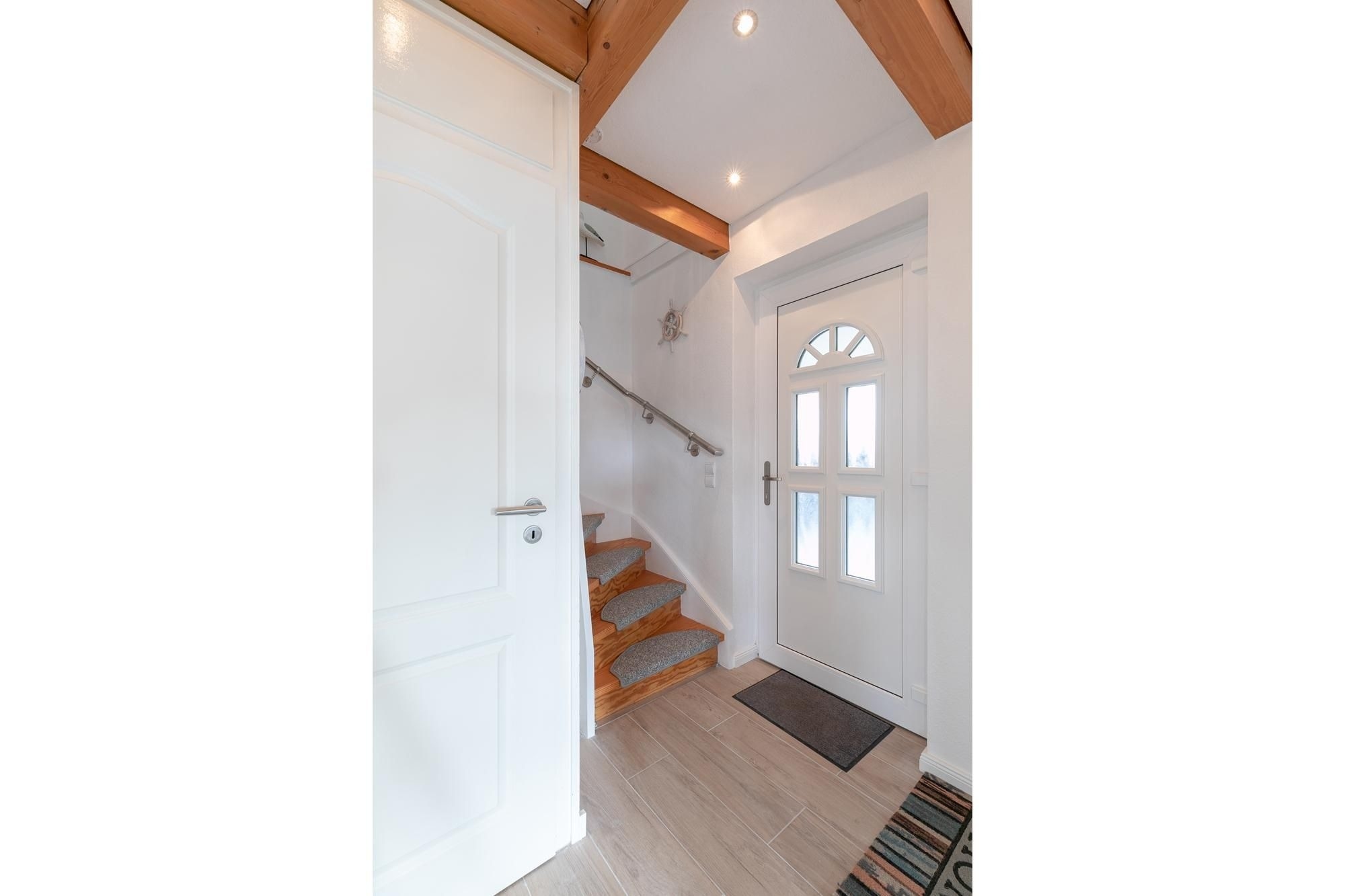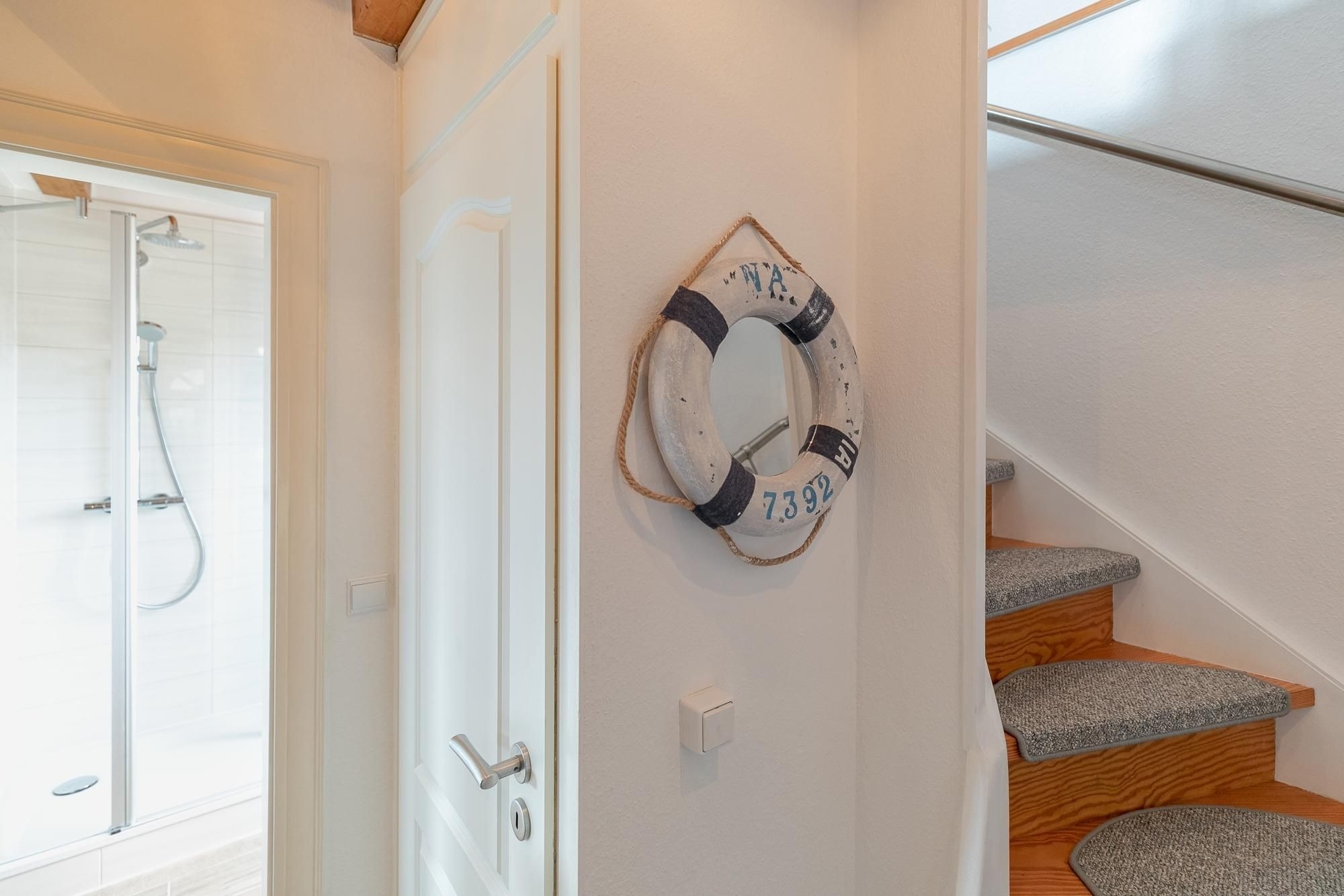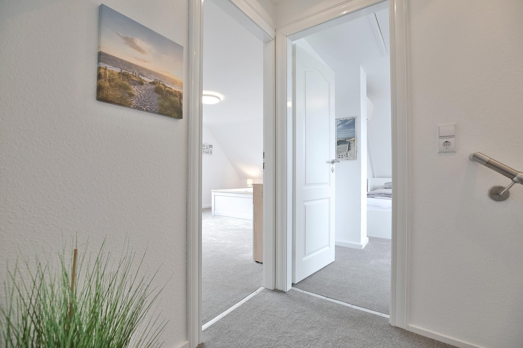 Eine Holztreppe führt in das Obergeschoss, hier liegt ein kleiner Flur zwischen den beiden Schlafzimmern.