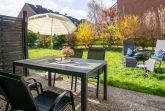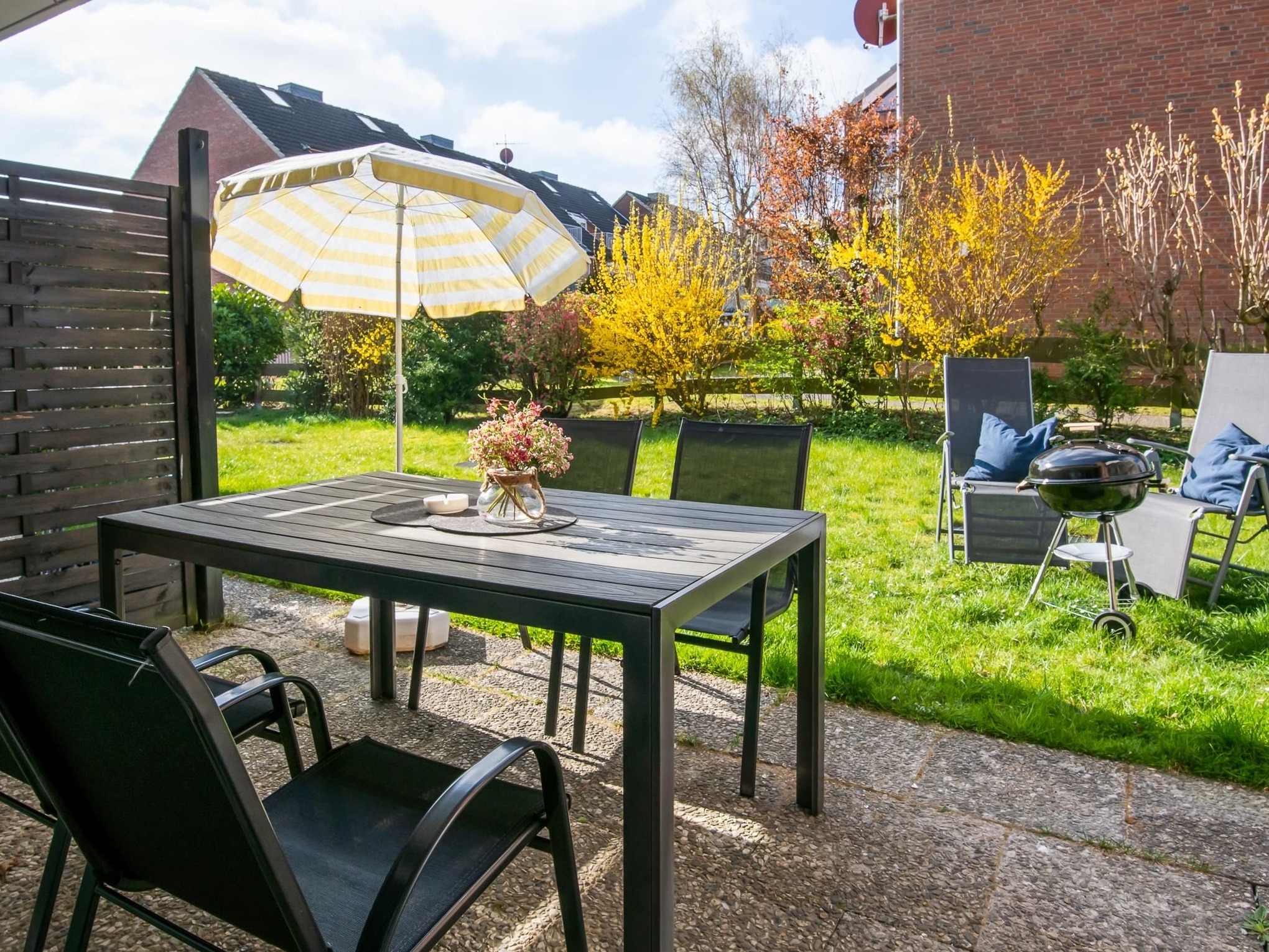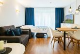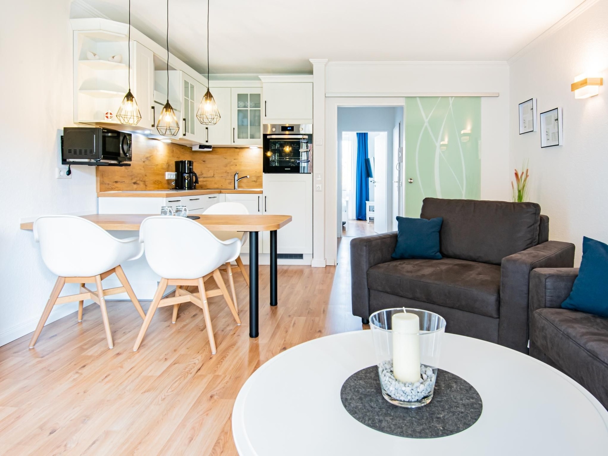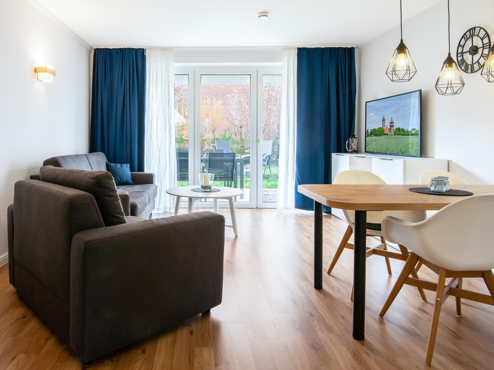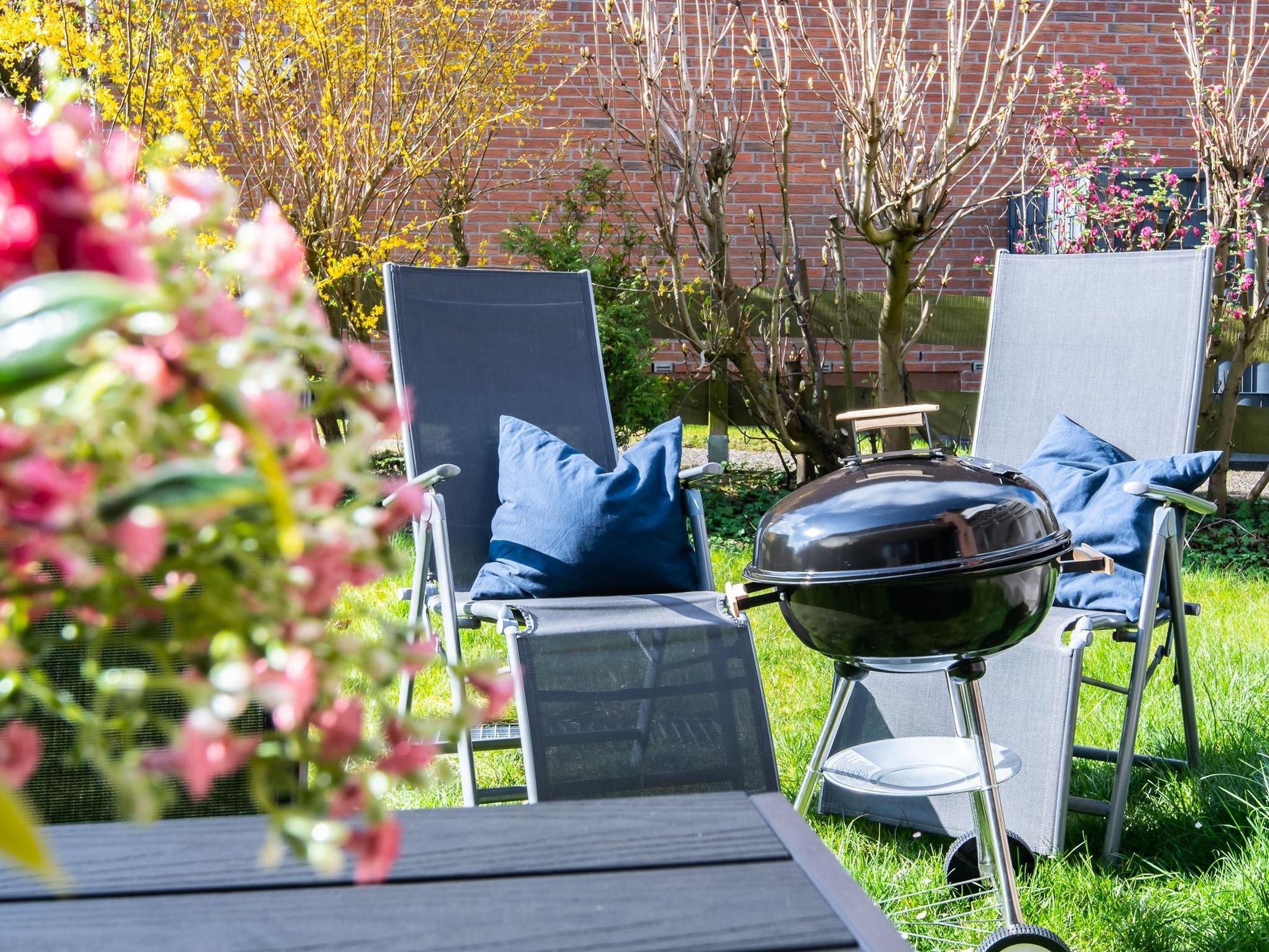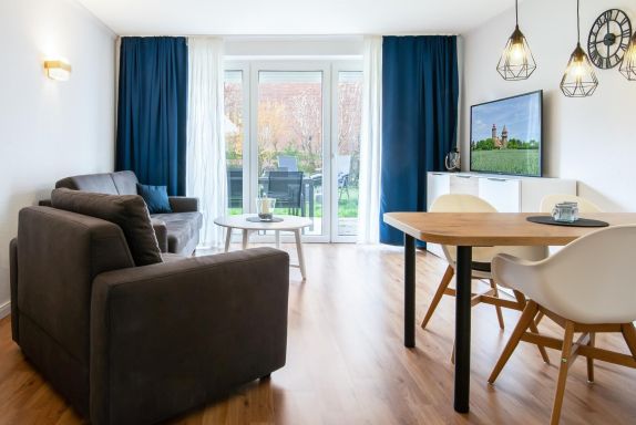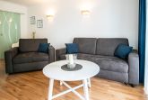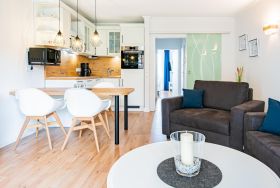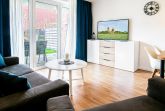 Herzstück der Wohnung ist der helle und offene Wohnbereich mit integriertem Essplatz für vier und angrenzender Küche. Alltagshelfer wie Induktionsherd, Backofen in angenehmer Arbeitshöhe, Mikrowelle und Spülmaschine sorgen für gute Laune, mit Blick ins Grüne kann man hier leckere Ferienmahlzeiten zaubern. Entspannen Sie im Wohnbereich auf bequemem Sofa und Sessel, ein Flatscreen-TV bietet elektronische Unterhaltung in HD-Qualität. Natürlich steht den Gästen auch ein kostenfreier WLAN-Anschluss zur Verfügung. Das hochwertige Schlafsofa offeriert einen weiteren gemütlichen Schlafplatz für zwei (Liegefläche 160x200 cm). Das Wohnzimmer führt direkt auf die möblierte Terrasse mit angrenzendem Gartenstück, hier lässt es sich wunderbar in der Morgensonne frühstücken oder abends entspannt den Tag ausklingen. Für gesellige BBQ Abende ist ein Elektrogrill vorhanden.