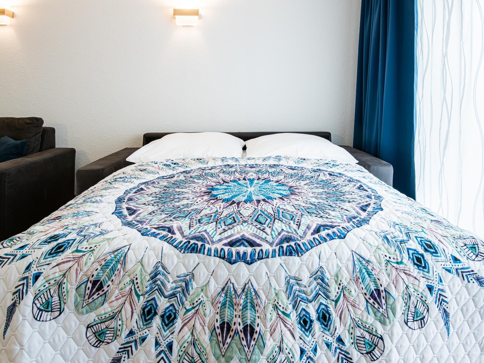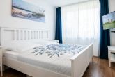 Das separate Schlafzimmer ist mit gemütlichen Doppelbett samt Topper (180x200 cm), Kleiderschrank und zweitem Flatscreen-TV ausgestattet. Das moderne Badezimmer ist elegant mit Eckdusche, WC und Waschtisch mit beleuchtetem Spiegel möbliert. Das gesamte Interieur ist modern, lässig und mit sicherem Gespür für Behaglichkeit und Stil aufeinander abgestimmt. Fußbodenheizung sorgt im Wohnzimmer für wohliges Raumklima, Außenjalousien ermögliche angenehme Verdunklung.