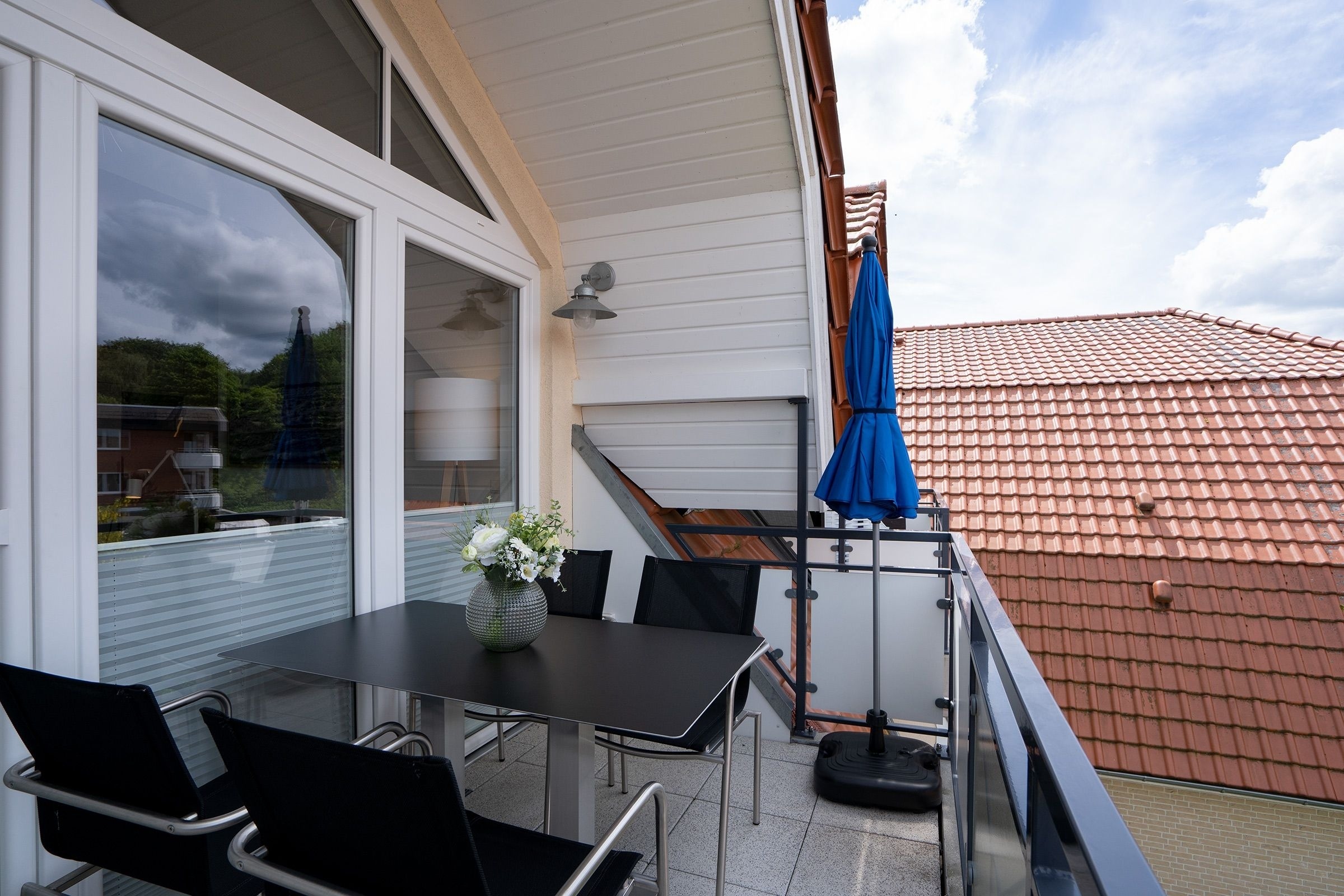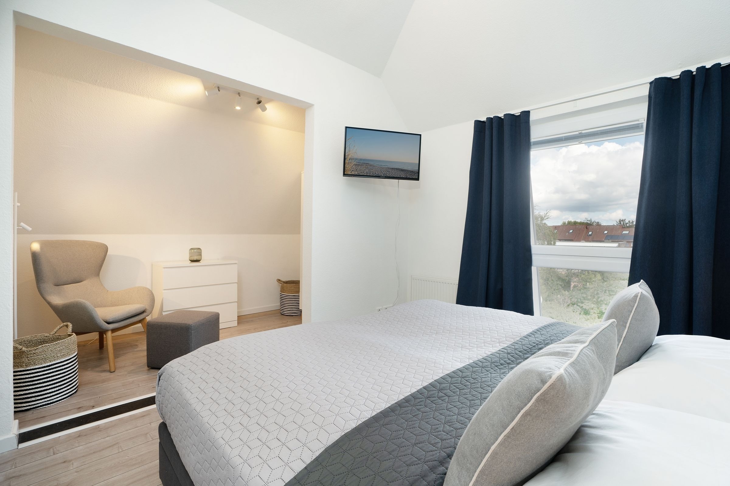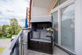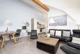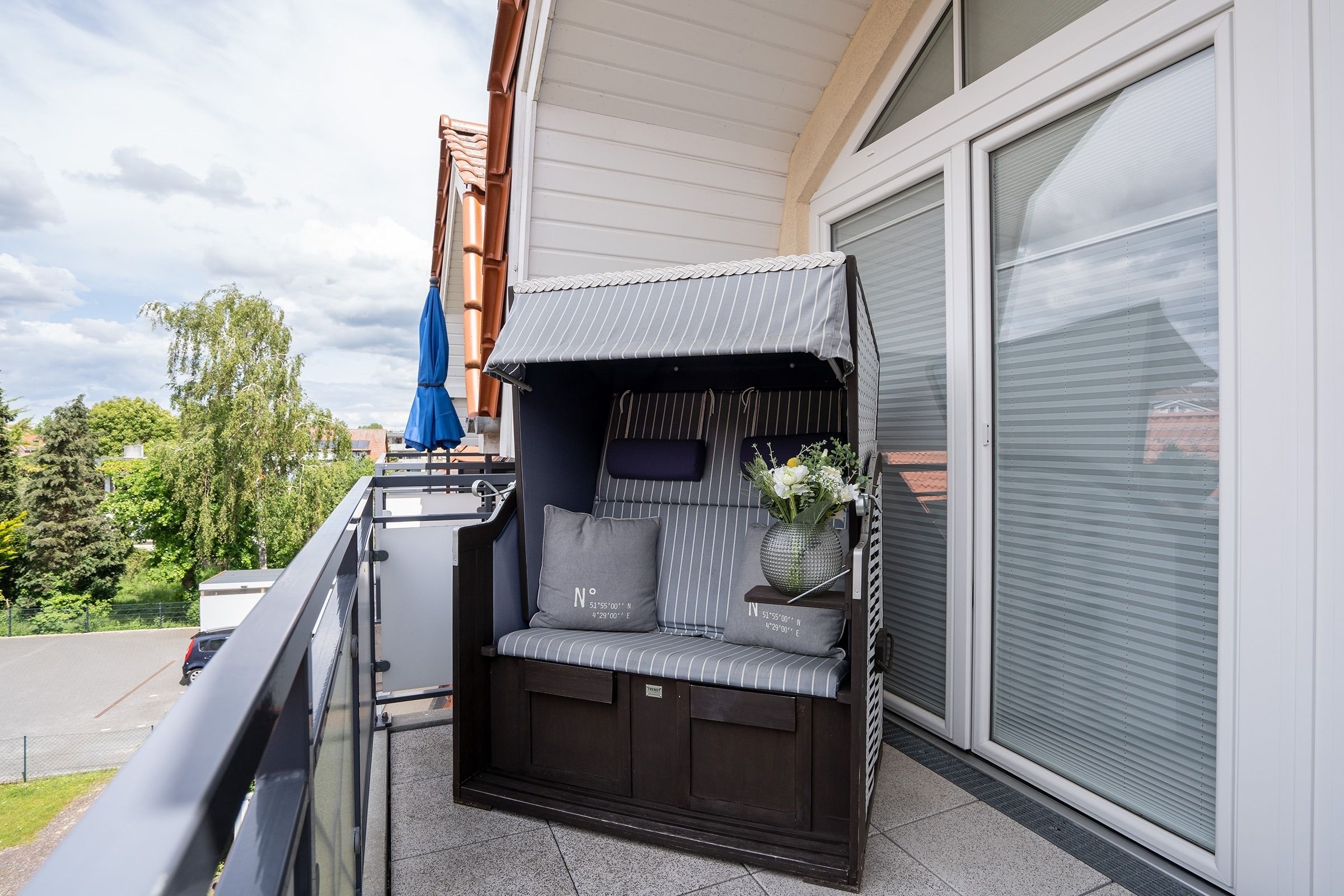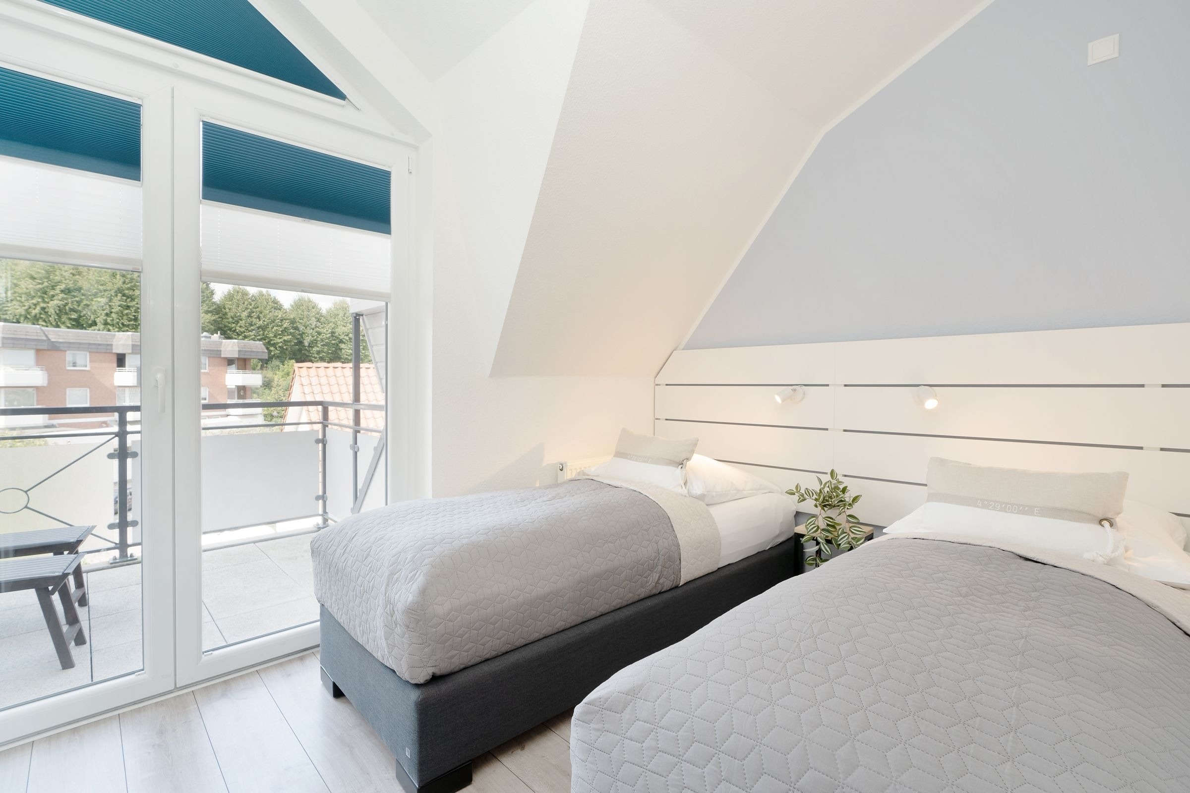 Der großzügige Wohn-/Essbereich mit gemütlicher Sofaecke, Flachbild-TV, integrierter Küche und Essplatz ist offen gestaltet, hell und lichtdurchflutet. Die gute Ausstattung der Küche umfasst Annehmlichkeiten wie 4-Platten-Ceranherd, Backofen, Mikrowelle und Spülmaschine - perfekt geeignet für gesellige Kochabende. Vom Wohnbereich führt ein direkter Zugang auf Ihren eigenen Balkon - hier lässt es sich herrlich frühstücken! Auf dem zweiten Balkon lädt ein gemütlicher Strandkorb zur Entspannung ein. Eins der Schlafzimmer ist mit einem hochwertigen Boxspring-Doppelbett (2x 90x200 cm, ohne Rausfallschutz) möbliert, das zu zwei Einzelbetten auseinandergestellt werden kann. Bei einem der beiden Boxspring-Betten ist die Liegefläche bis zu 80 cm höhenverstellbar. Es ist damit auch für Menschen mit Bewegungsbeeinträchtigungen oder Pflegebedarf geeignet. Das zweite Schlafzimmer ist mit zwei Boxspring-Betten (je 80x200 cm) ausgestattet. Angenehme Verdunklung ist durch Plissee und Vorhänge gegeben. Das stilvolle, geräumige Badezimmer begeistert mit bodentiefer Dusche, Fußbodenheizung und beheizbarem Handtuchhalter.