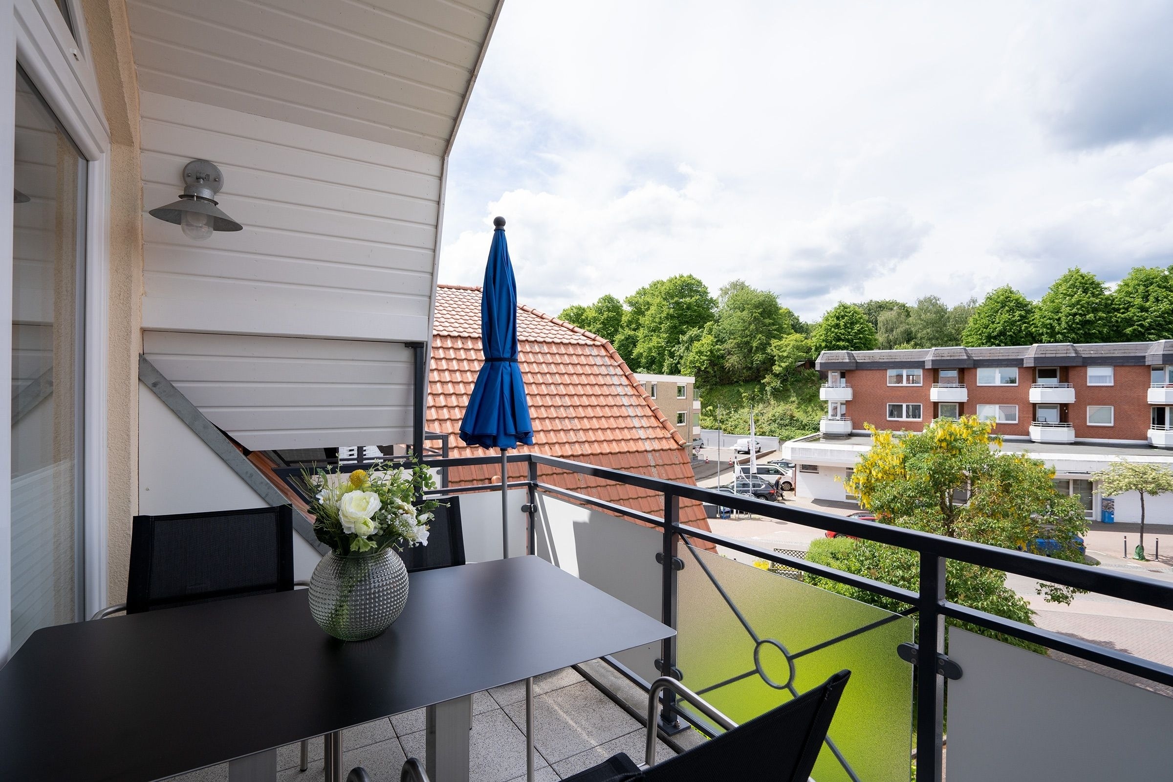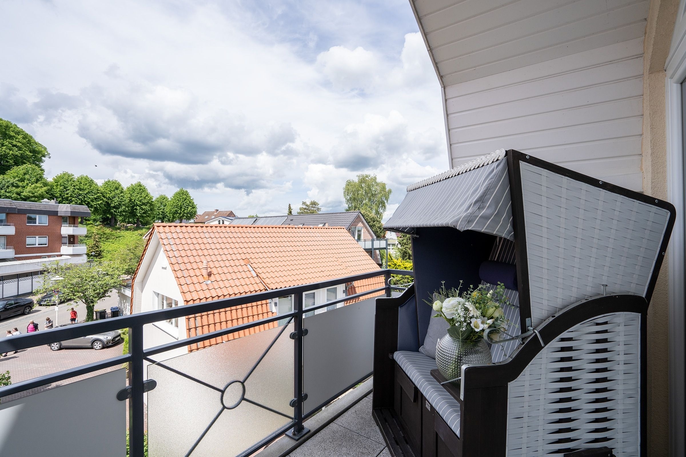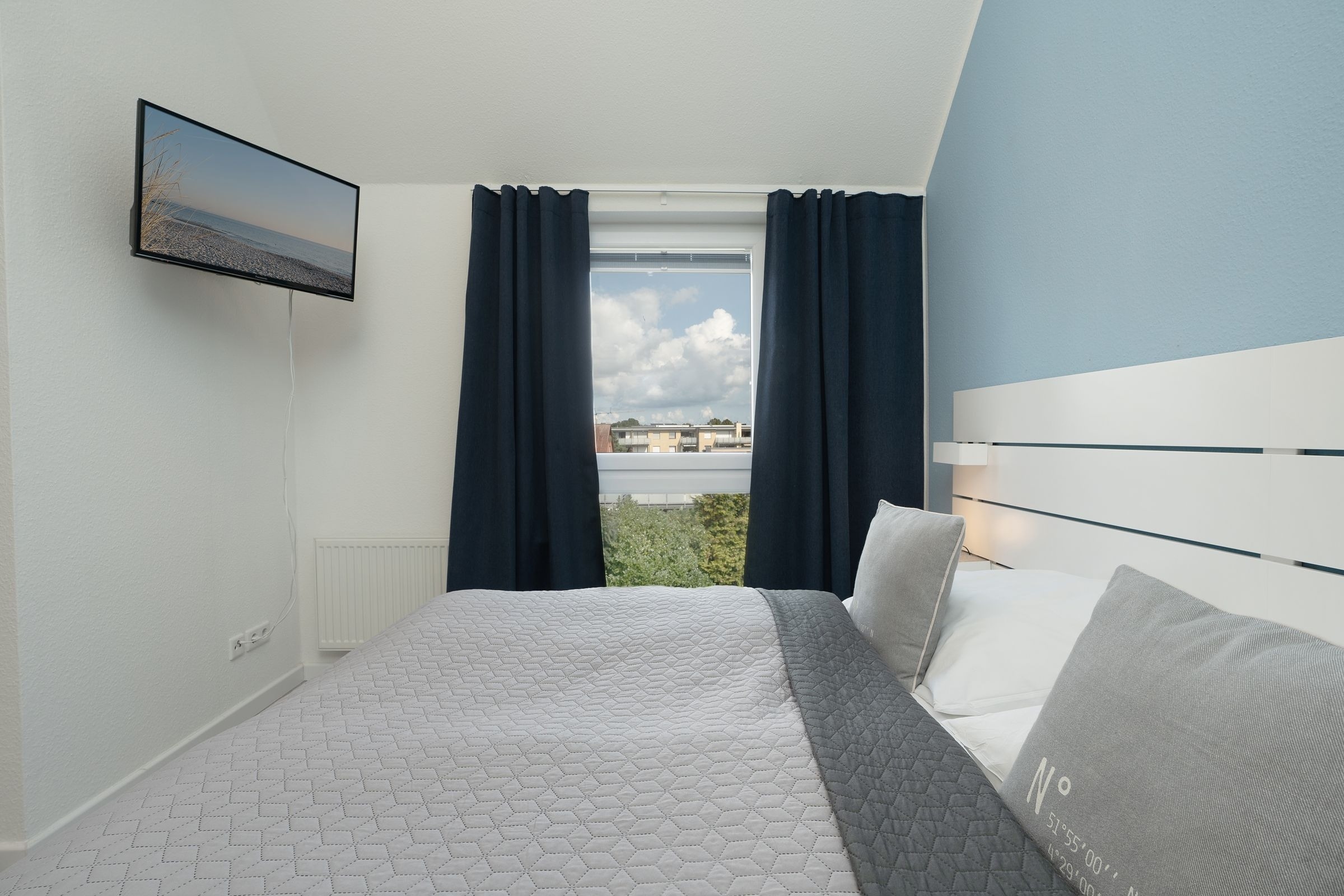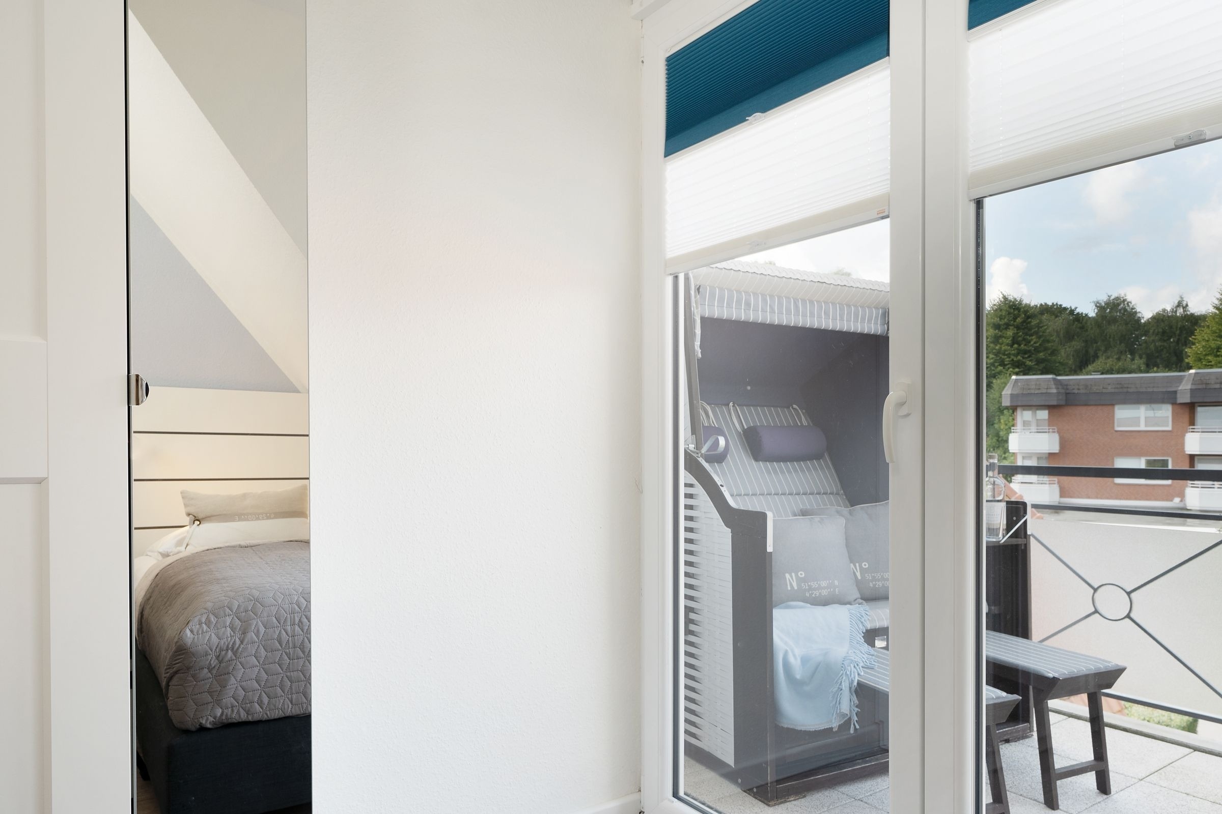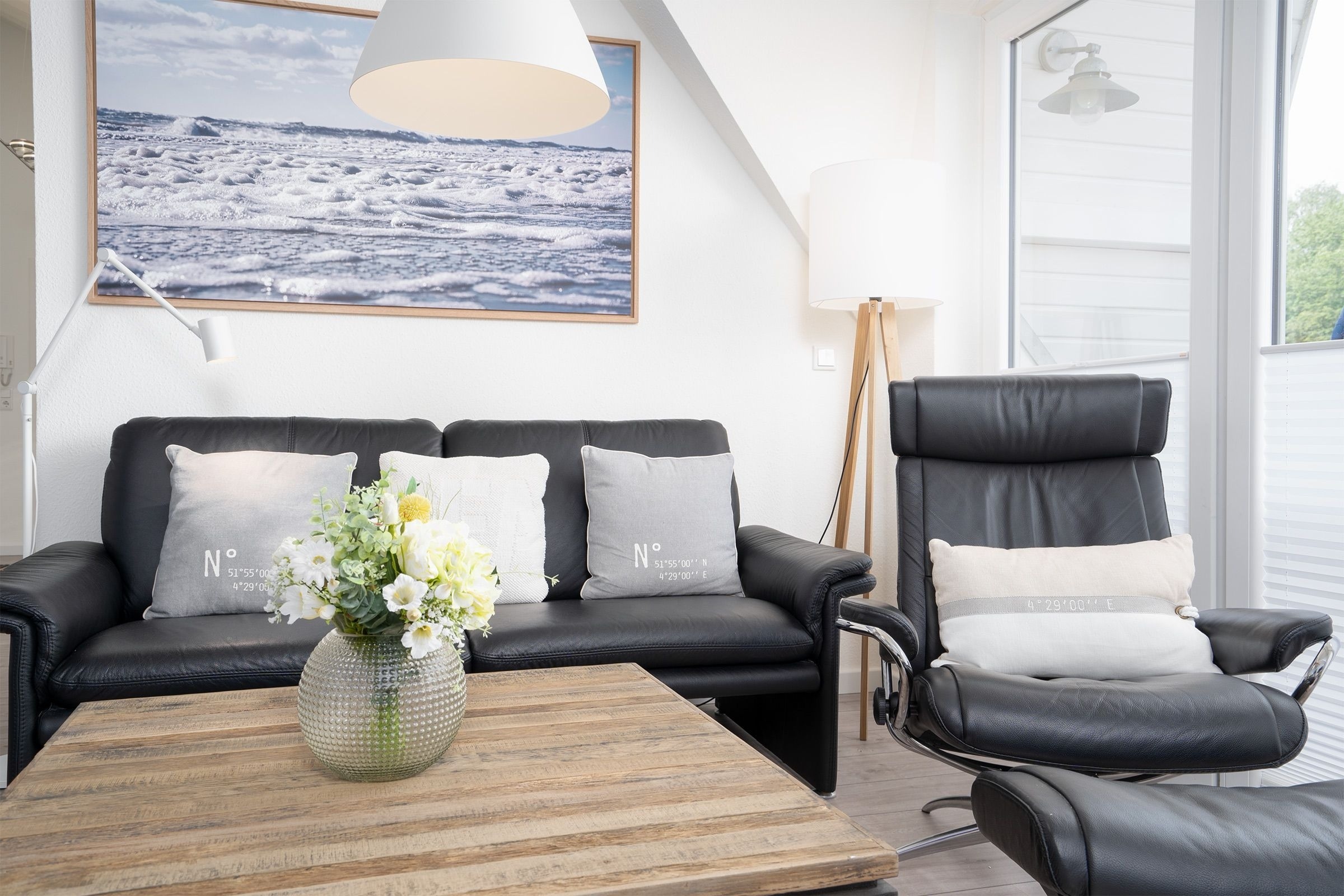 Der großzügige Wohn-/Essbereich mit gemütlicher Sofaecke, Flachbild-TV, integrierter Küche und Essplatz ist offen gestaltet, hell und lichtdurchflutet. Die gute Ausstattung der Küche umfasst Annehmlichkeiten wie 4-Platten-Ceranherd, Backofen, Mikrowelle und Spülmaschine - perfekt geeignet für gesellige Kochabende. Vom Wohnbereich führt ein direkter Zugang auf Ihren eigenen Balkon - hier lässt es sich herrlich frühstücken! Auf dem zweiten Balkon lädt ein gemütlicher Strandkorb zur Entspannung ein. Eins der Schlafzimmer ist mit einem hochwertigen Boxspring-Doppelbett (2x 90x200 cm, ohne Rausfallschutz) möbliert, das zu zwei Einzelbetten auseinandergestellt werden kann. Bei einem der beiden Boxspring-Betten ist die Liegefläche bis zu 80 cm höhenverstellbar. Es ist damit auch für Menschen mit Bewegungsbeeinträchtigungen oder Pflegebedarf geeignet. Das zweite Schlafzimmer ist mit zwei Boxspring-Betten (je 80x200 cm) ausgestattet. Angenehme Verdunklung ist durch Plissee und Vorhänge gegeben. Das stilvolle, geräumige Badezimmer begeistert mit bodentiefer Dusche, Fußbodenheizung und beheizbarem Handtuchhalter.