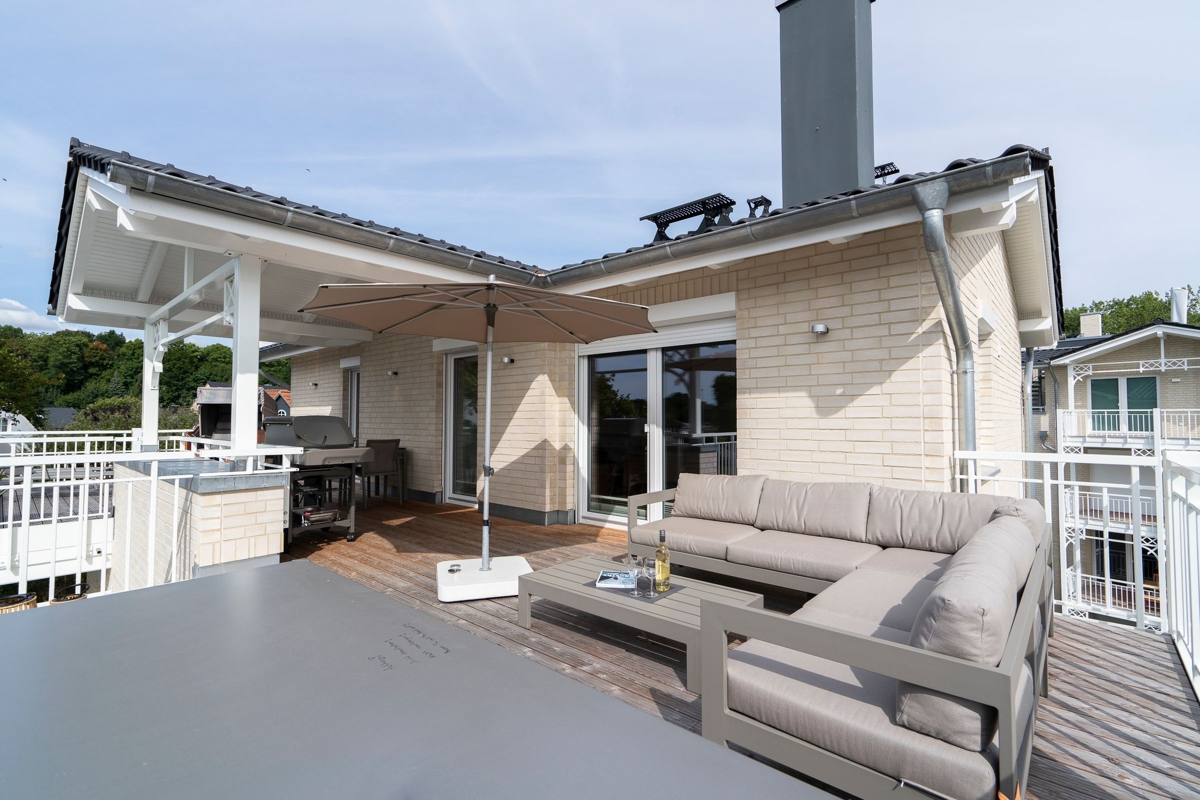 Parken Sie Ihren PKW bequem auf dem vorhandenen Stellplatz und fahren Sie mit dem Fahrstuhl exklusiv und direkt in Ihre Ferienoase im 3. Obergeschoss. Treten Sie ein und genießen Sie das Ostseegefühl von Ruhe und Entspannung. Der lichtdurchflutete Wohnraum mit moderner Sofagarnitur mit Schlaffunktion und TV grenzt an die offene, elegante Küche. Ausgestattet mit Backofen, Herd, Kühlschrank mit Gefrierfach, Kaffeemaschine, Spülmaschine etc. wird es Ihnen an nichts fehlen. Von hier haben Sie Zutritt zu der beeindruckenden Dachterrasse mit Blick über die Dächer von Grömitz und in den idyllischen Kurpark. Verbringen Sie hier gemütliche Grillabende und bereiten Sie sich Ihr Grillgut auf dem vorhandenen Webergrill zu. Bei einem ausgiebigen Frühstück können Sie die ersten Sonnenstrahlen und die Ostseeluft genießen und voller Energie in den Urlaubstag starten. Hochwertige Gartenmöbel, Sonnenliegen, komfortable Lounge-Möbel sowie ein Strandkorb stehen für Sie bereit. Ein Sonnenschirm spendet bei Bedarf den nötigen Schatten.