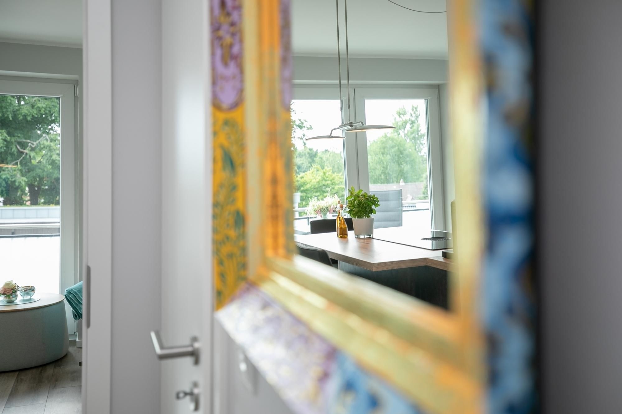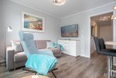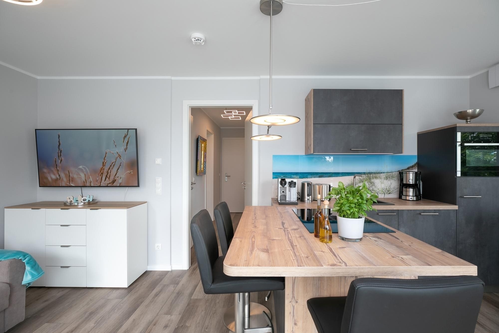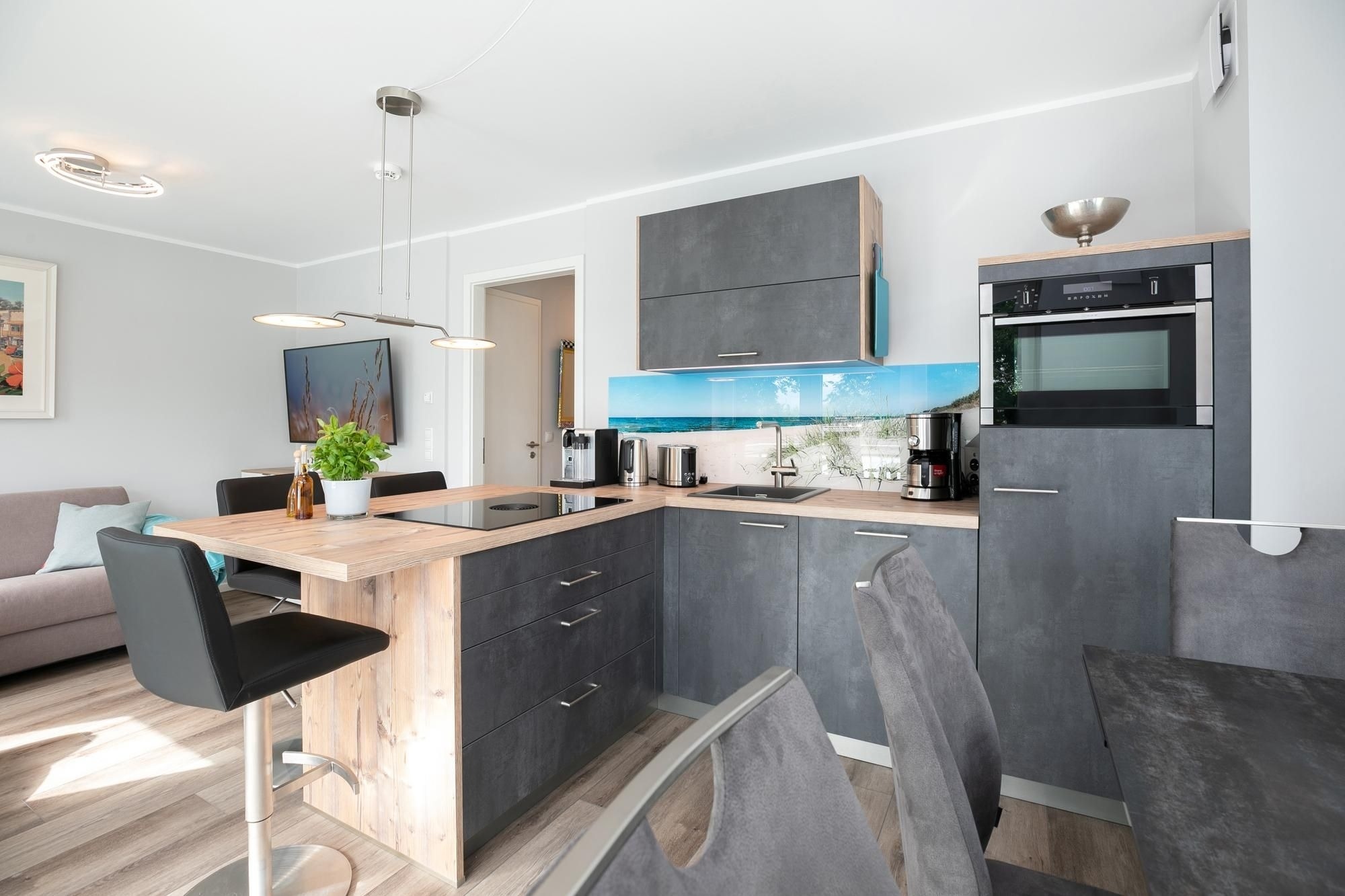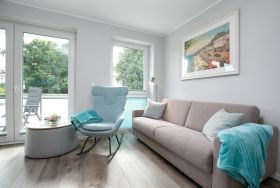 Das Herzstück dieses Domizils bildet der offene Wohnbereich, hier lassen sich erholsame Stunden zum Lesen oder Fernsehen auf dem Sofa verbringen. Eine automatische Belüftung sorgt für ein ausgeglichenes Klima. Zur Nachtruhe können Sie ziehen Sie sich ins separate Schlafzimmer mit modernem Boxspringbett (2x90x200cm) zurückziehen, die gesamte Wohnung lässt sich über Außenjalousien verdunkeln. Sollte es erforderlich sein, besteht die Möglichkeit auf das Schlafsofa ins Wohnzimmer auszuweichen. Eine offene Küche mit 4-Platten-Ceran Kochfeld mit integrierter Dunstabzugshaube, Mikrowellen-/Backofenkombi, Spülmaschine, Kühlschrank, Gefrierfach, Kaffeemaschine, Toaster und Wasserkocher bietet alles für den begeisterten Hobbykoch. Die Fußbodenheizung im Badezimmer sorgt für wohligen Komfort, die bodentiefe Dusche, Handtuchheizung und ein Fön komplettieren die Ausstattung. Ein Abstellraum mit Garderobenschrank verschafft zusätzlichen Stauraum. Ihre Tasse frischen Morgenkaffee können Sie auf dem 12 m² großen möblierten überdachten Eckbalkon genießen.