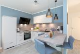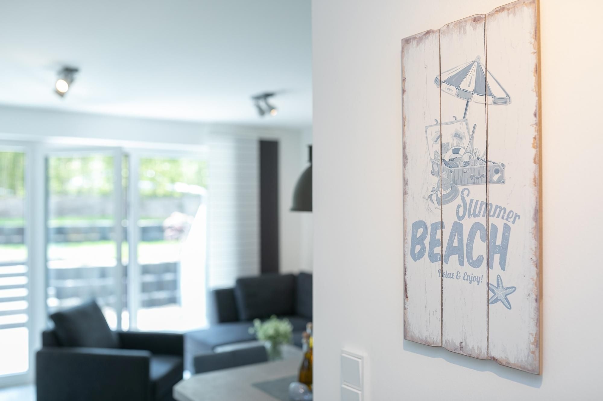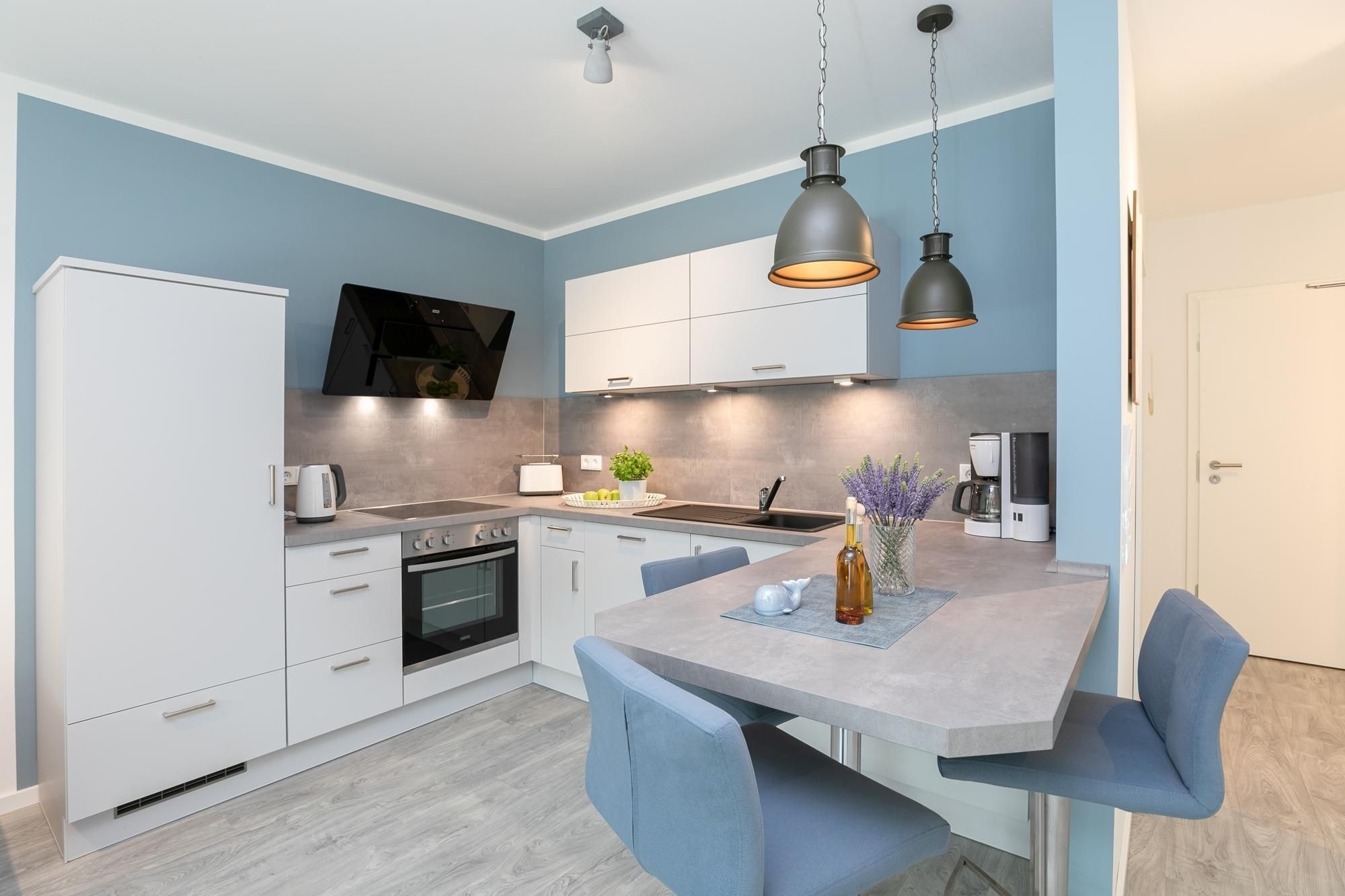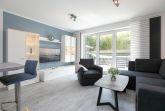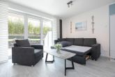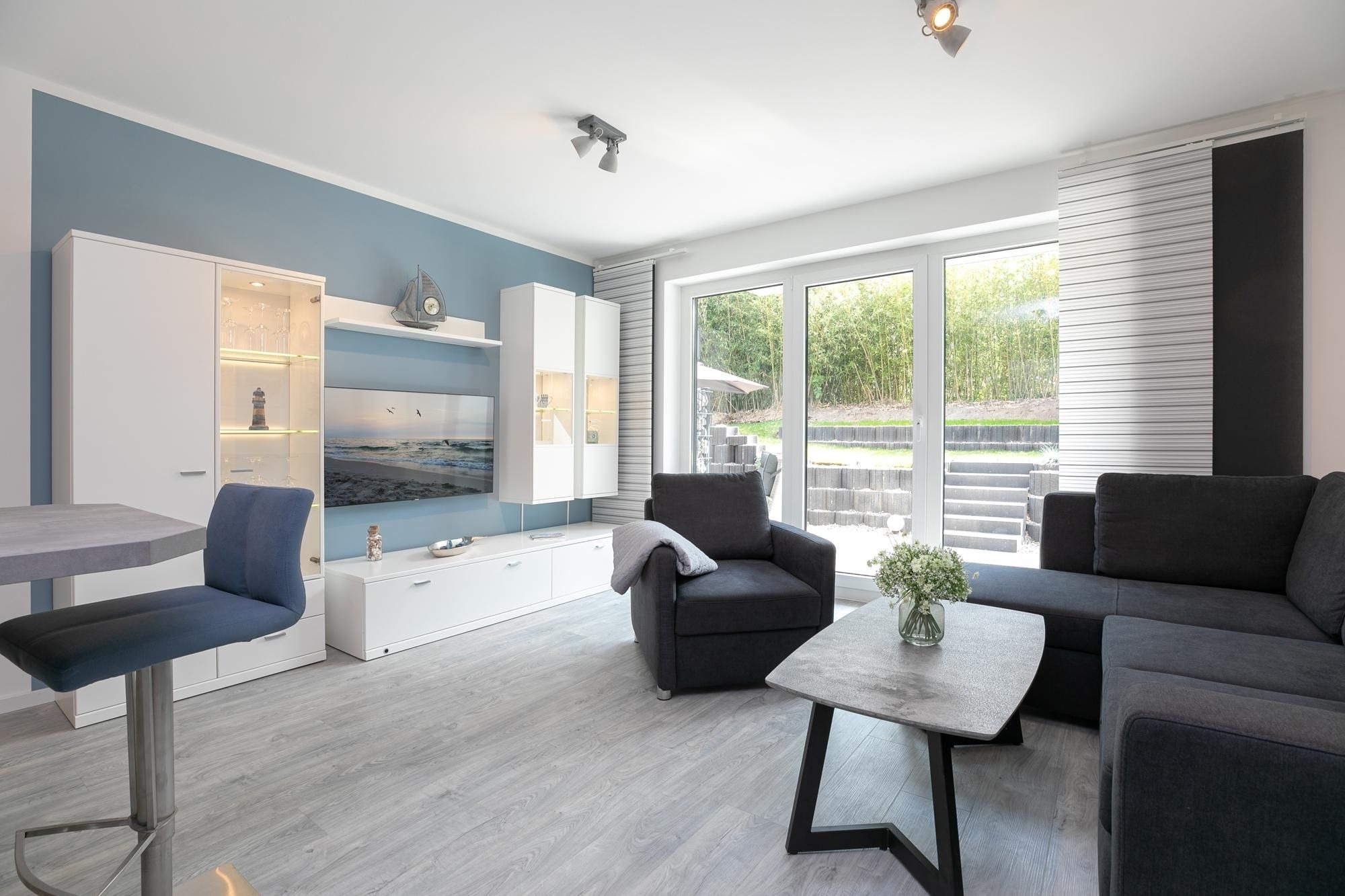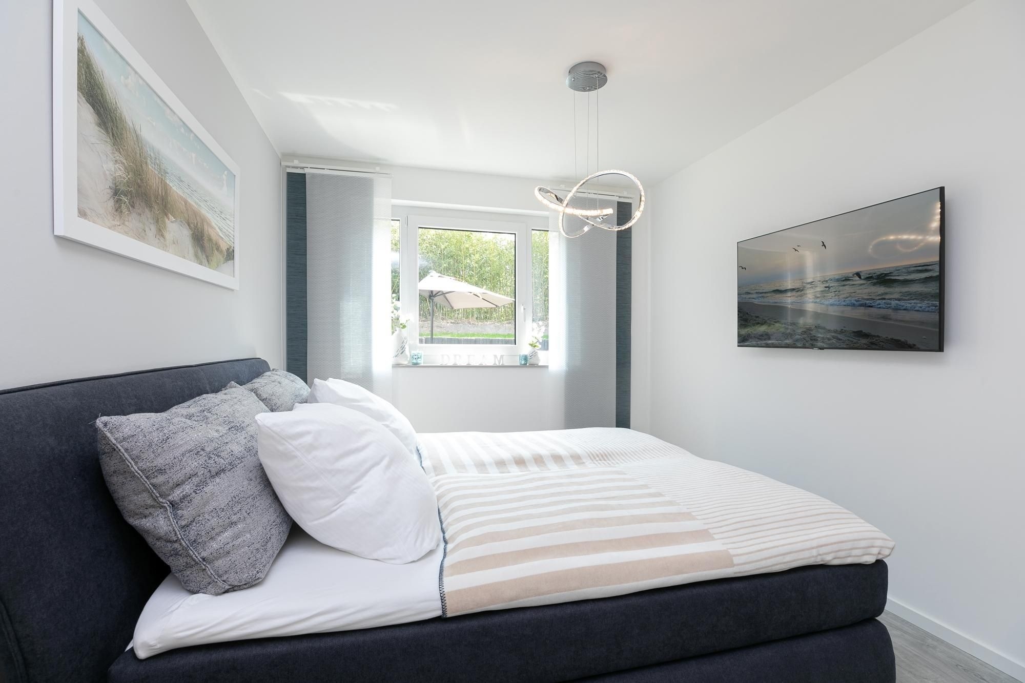 Öffnen Sie die Tür zu Ihrem modernen Urlaubsparadies - in das offene Wohnzimmer mit Sofaecke mit Schlaffunktion und TV ist die trendige Küche mit Tresen in Betonoptik integriert. Verwöhnen Sie sich und Ihre Liebsten mit Leckereien, die hier problemlos zubereitet werden können, denn ein Herd mit 4 Kochfeldern und Backofen, eine Spülmaschine, Kühlschrank mit Gefrierfach, Kaffeemaschine, Wasserkocher, Toaster und Eierkocher gehören zur Ausstattung. Absolutes Highlight dieser Ferienwohnung ist die wunderschöne imposante 16 m² große Terrasse, die mit Gartenmöbeln und Sonnenschirm zu lauschigen Stunden einlädt. Für Schlafkomfort sorgt das große Boxspringbett (180x200 cm) im separaten Schlafzimmer mit zusätzlichem Fernsehgerät, auch hier haben Sie einen Blick auf die traumhafte Terrasse. Im hübschen Badezimmer mit bodentiefer Dusche kommt Wellness-Feeling auf. Die Fußbodenheizung, die sich durchs ganze Appartement zieht, sorgt für wohlige Wärme.