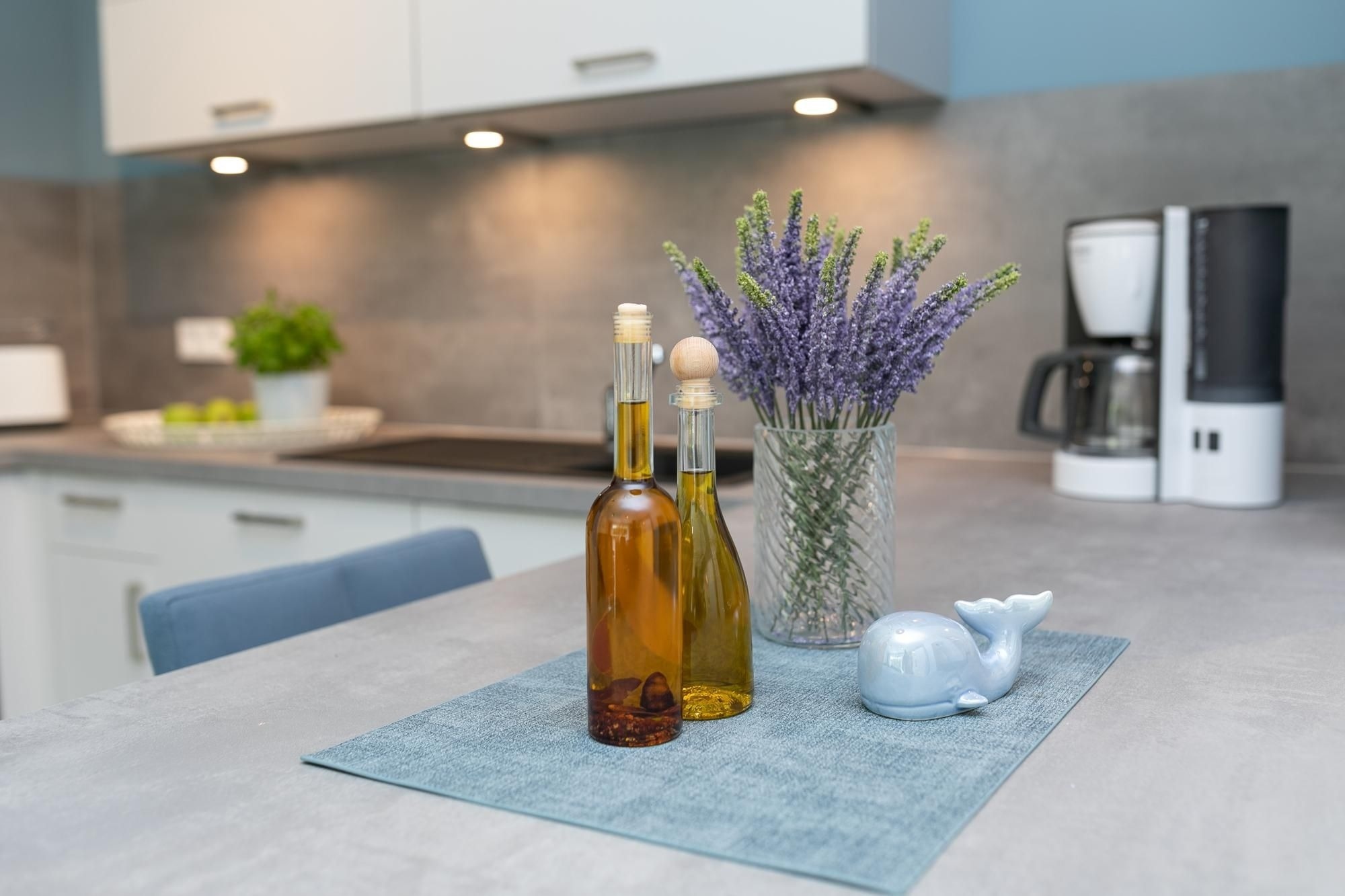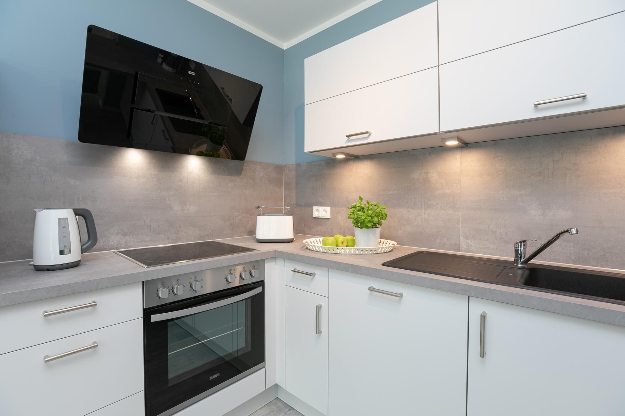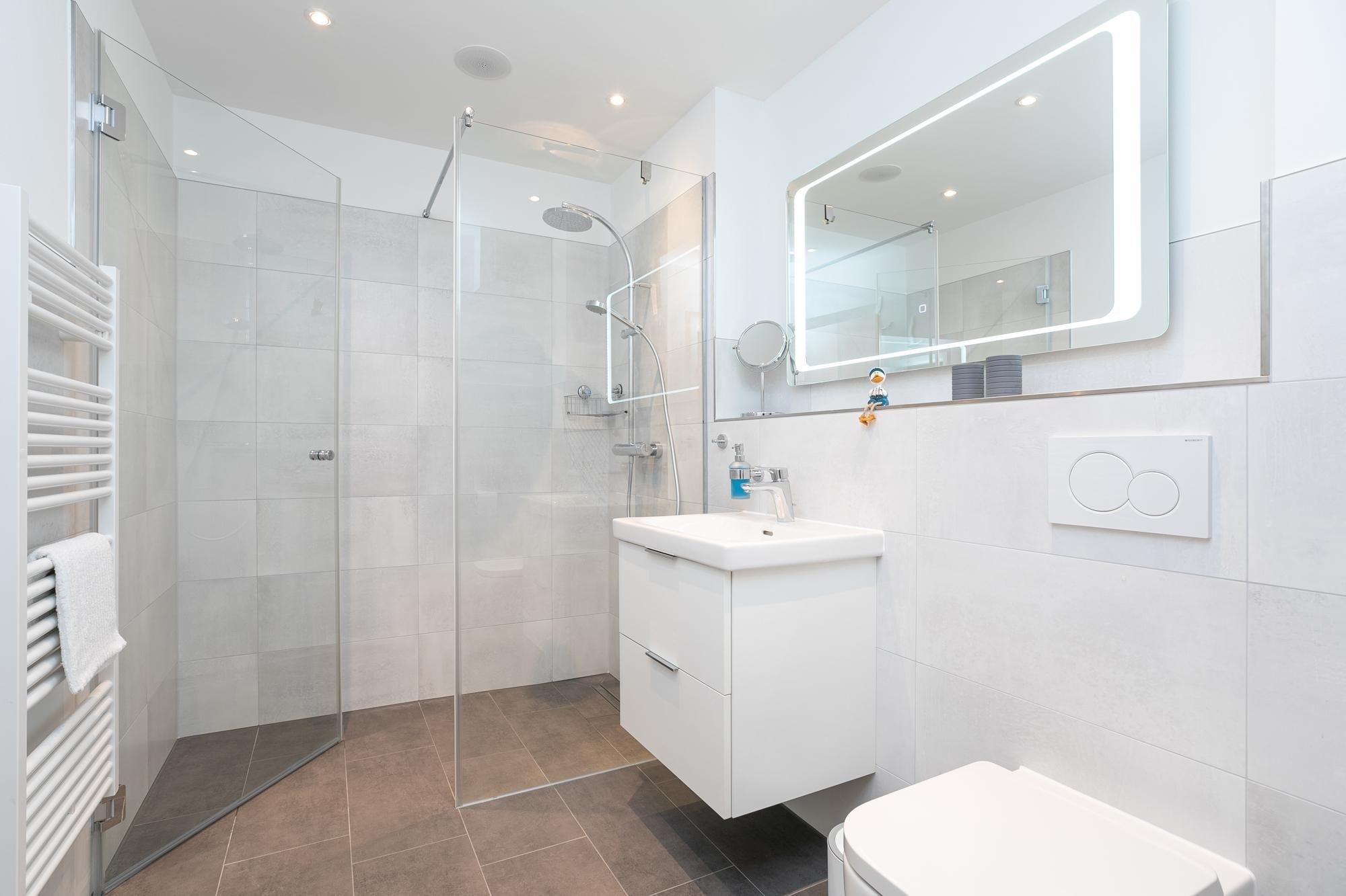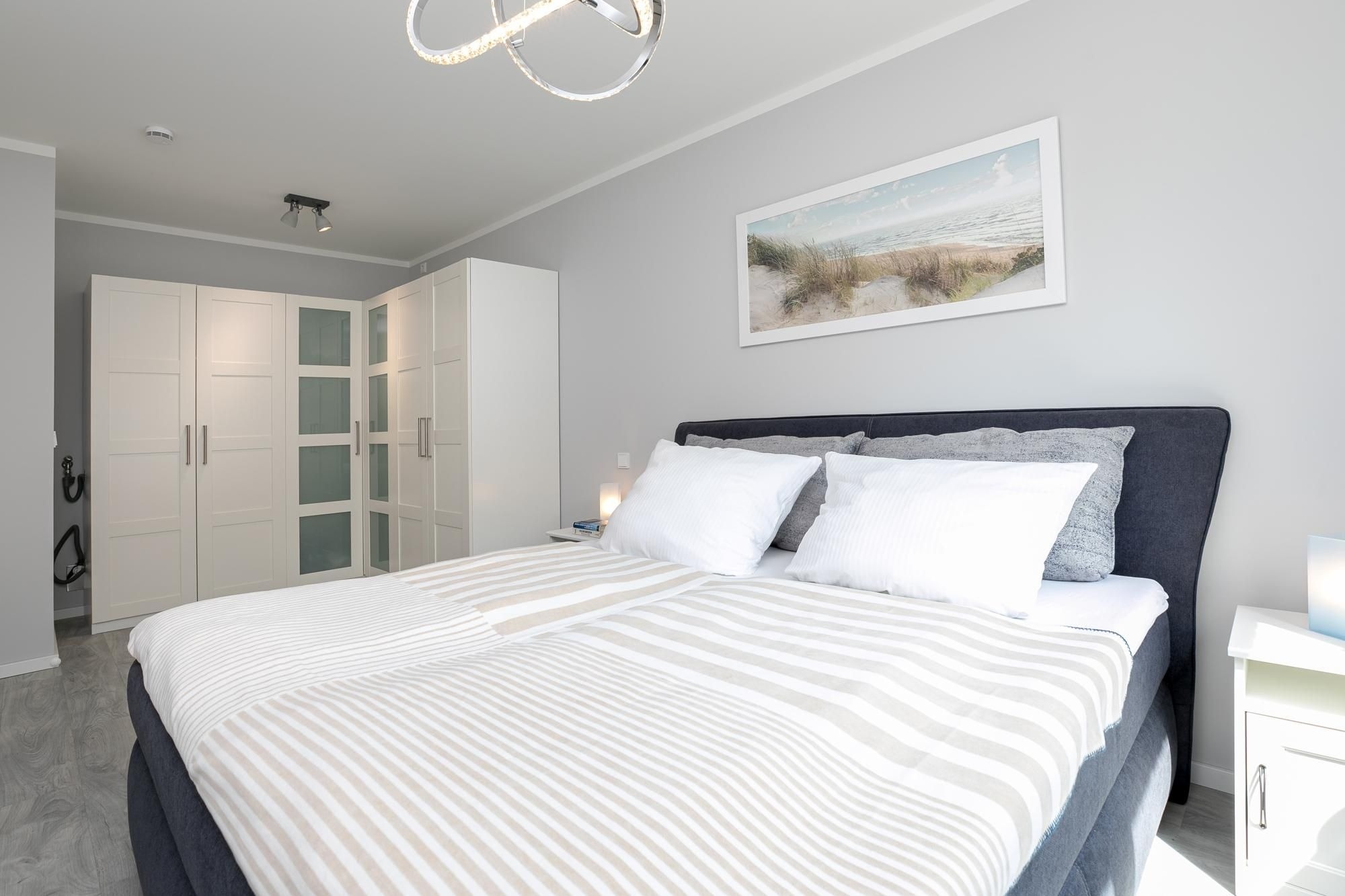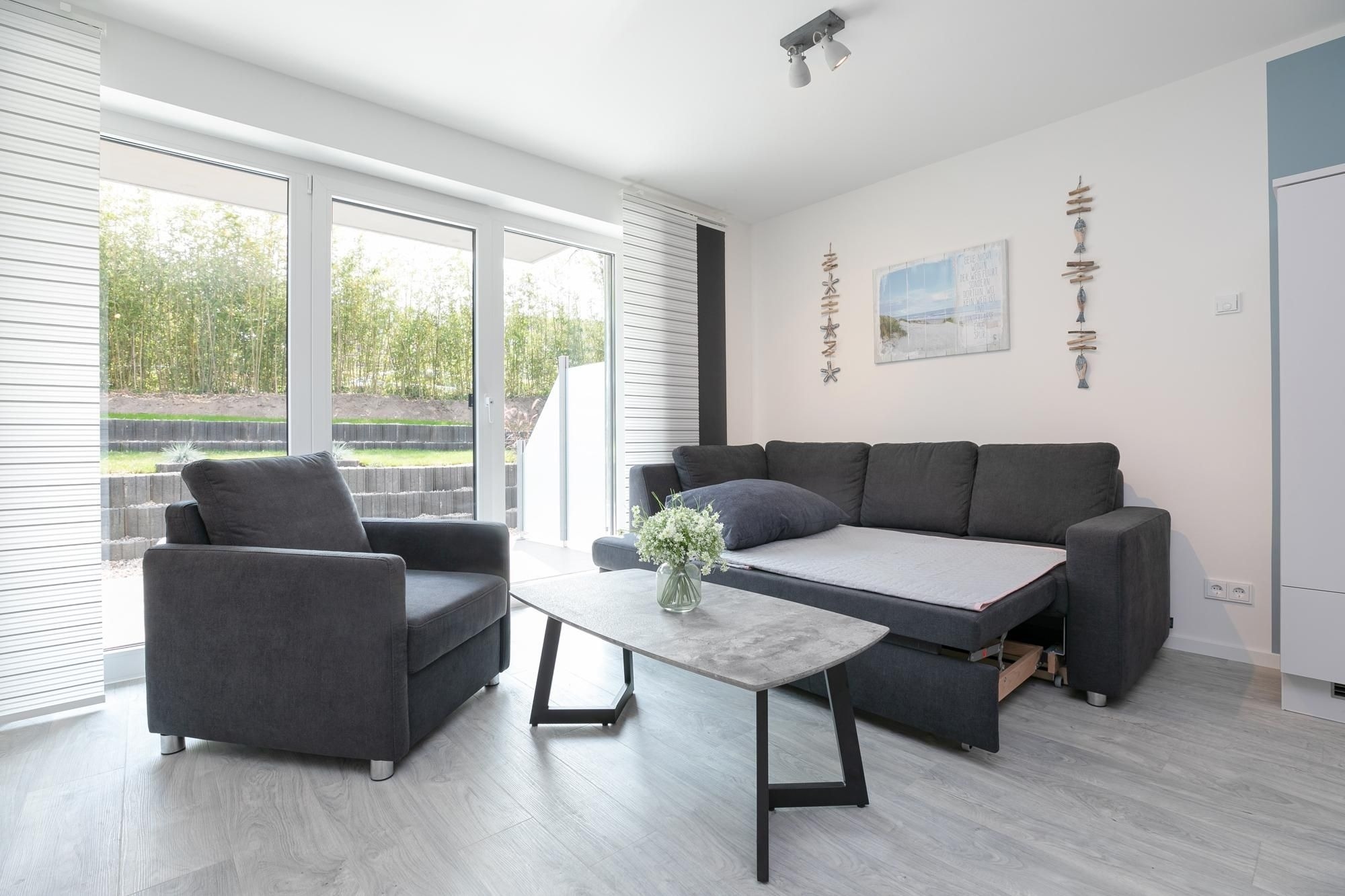 Öffnen Sie die Tür zu Ihrem modernen Urlaubsparadies - in das offene Wohnzimmer mit Sofaecke mit Schlaffunktion und TV ist die trendige Küche mit Tresen in Betonoptik integriert. Verwöhnen Sie sich und Ihre Liebsten mit Leckereien, die hier problemlos zubereitet werden können, denn ein Herd mit 4 Kochfeldern und Backofen, eine Spülmaschine, Kühlschrank mit Gefrierfach, Kaffeemaschine, Wasserkocher, Toaster und Eierkocher gehören zur Ausstattung. Absolutes Highlight dieser Ferienwohnung ist die wunderschöne imposante 16 m² große Terrasse, die mit Gartenmöbeln und Sonnenschirm zu lauschigen Stunden einlädt. Für Schlafkomfort sorgt das große Boxspringbett (180x200 cm) im separaten Schlafzimmer mit zusätzlichem Fernsehgerät, auch hier haben Sie einen Blick auf die traumhafte Terrasse. Im hübschen Badezimmer mit bodentiefer Dusche kommt Wellness-Feeling auf. Die Fußbodenheizung, die sich durchs ganze Appartement zieht, sorgt für wohlige Wärme.