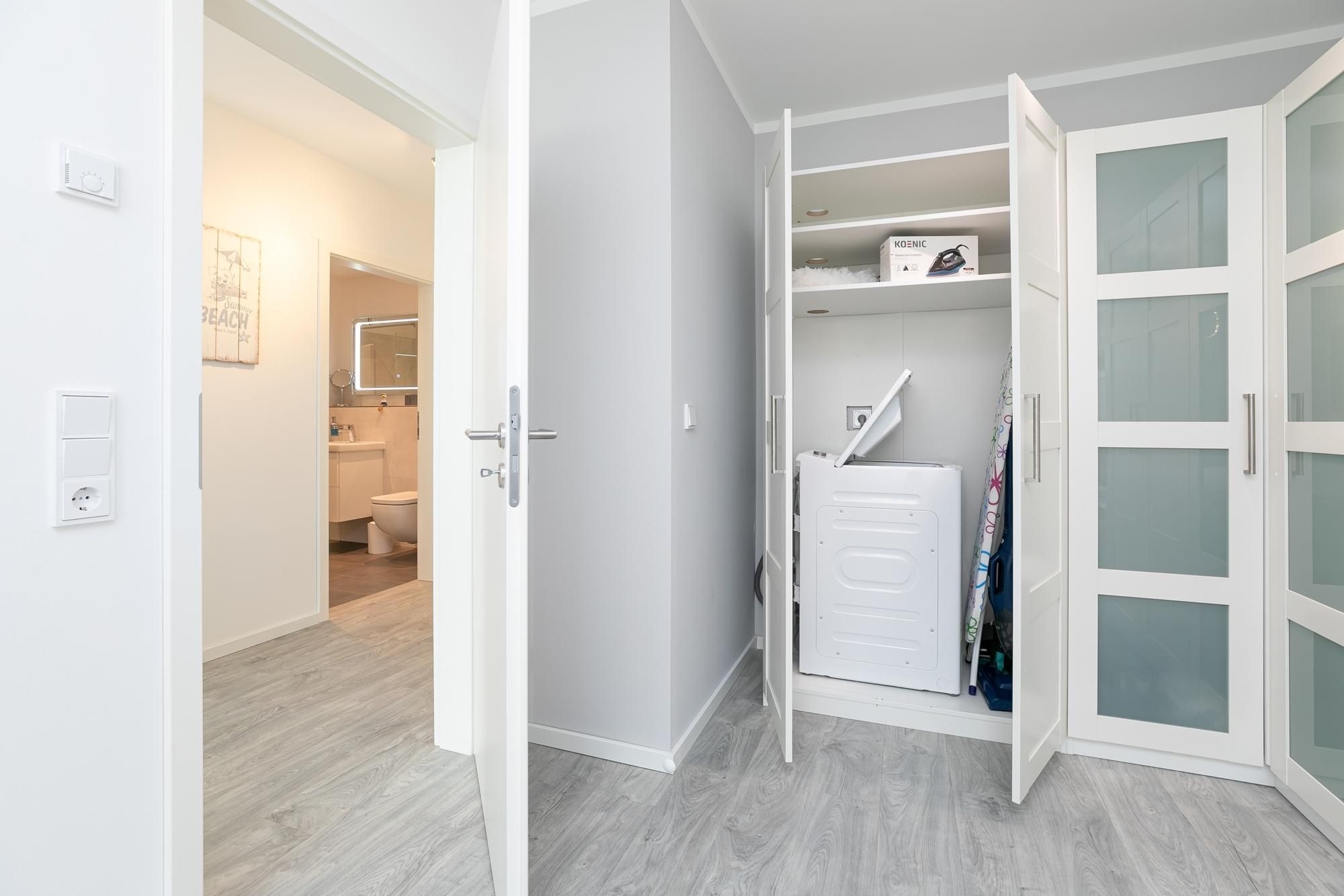 Zu dieser Wohnung gehört ein PKW-Außenstellplatz. Elektrische Außenjalousien, eine eigene Waschmaschine, WLAN-Zugang runden die hochwertige Ausstattung dieser Wohnung ab.