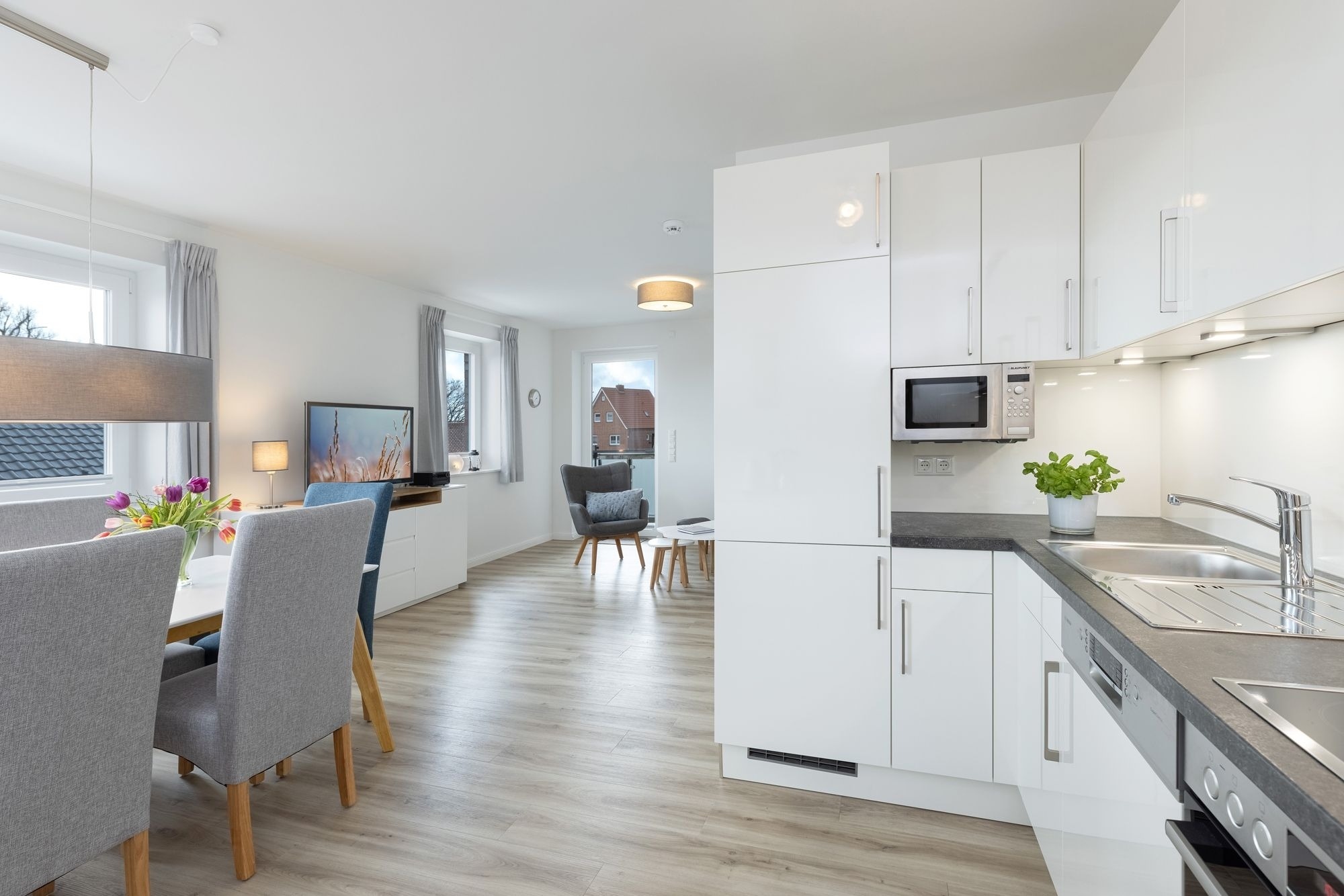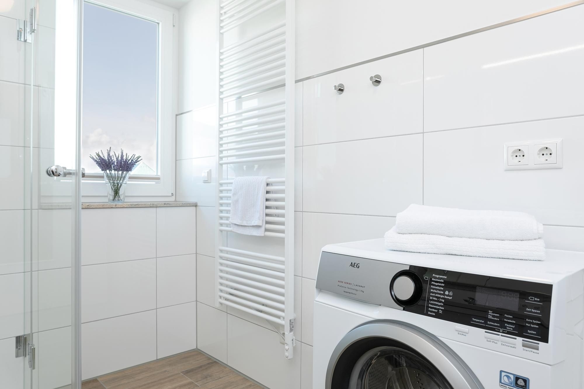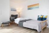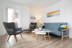 Vom Flur mit Garderobe, Gäste WC und Abstellkammer betreten Sie das lichtdurchflutete Wohn-/Esszimmer mit Balkonzugang. Hier haben Sie ausreichend Platz für gesellige Spieleabende oder gemütliche Stunden auf dem Sofa mit Schlaffunktion (Liegefläche ca. 140x200 cm) vor dem Fernsehgerät. Eine Fußbodenheizung sorgt in allen Räumen für behagliche Wärme vor allem in der kalten Jahreszeit. Der Balkon ist möbliert und eine Markise spendet bei Bedarf Schatten. Ein schmackhaftes Mittag- oder Abendessen lässt sich in der offenen Küche unkompliziert zubereiten, denn hier finden Sie einen Herd mit 4 Ceran-Kochfeldern und Backofen, Geschirrspüler, Mikrowelle, Kühl-Gefrierkombination, Mixer, Pürierstab, Eierkocher, Kaffeemaschine, Toaster und Wasserkocher. Im hinteren Teil der Wohnung lädt Sie das Hauptschlafzimmer mit Doppelbett (2x 90x200 cm), Kleiderschrank und TV zum Träumen und Entspannen ein. Auch das zweite Schlafzimmer mit 2 Einzelbetten (2x 90x200 cm) verfügt über Stauraum für die Urlaubsgarderobe, sowie ein TV Gerät. Das Tageslichtbad mit bodentiefer Dusche, Fußboden- und Handtuchheizung, sowie Waschmaschine vervollständigt diese schöne Ferienwohnung. Ein kostenloser WLAN Anschluss ist verfügbar.