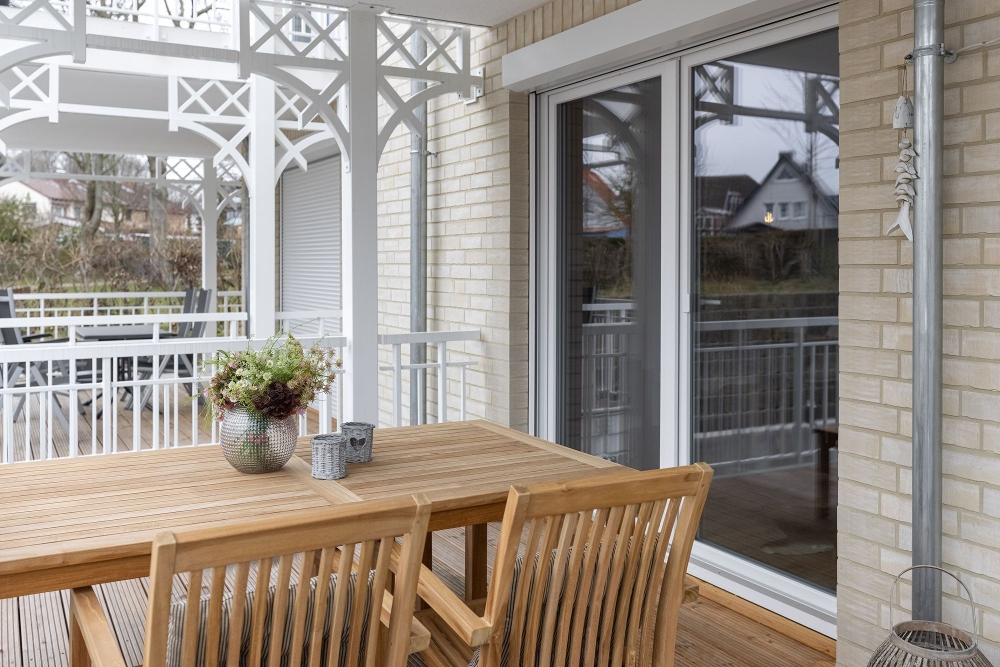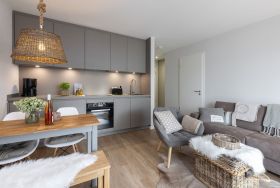 Hier eröffnet sich Ihnen Ihr Urlaubsparadies zu einem entschleunigten Ostseeurlaub. Der Wohnbereich mit Flachbild-TV ermöglicht kuschelige Abende auf dem Sofa, das sich dann zur Nacht in eine gemütliche Schlafstätte (160x200 cm) verwandeln lässt. Angrenzend finden Sie die offene, gut ausgestattete Küche, in der Sie sich mühelos selbst verpflegen können. Der möblierte großzügige Balkon in Süd-West Richtung lädt Sie bei entsprechendem Wetter zum Verweilen ein. Genießen Sie hier ein gutes Buch, oder Ihr Frühstück am Morgen bei guter Ostseeluft. In einem separaten Schlafzimmer mit Boxspringbett (2x 80x200 cm) und 2. TV können Sie sich von ereignisreichen Tagen am Strand erholen. Die Wohnung lässt sich komplett durch Außenrollläden verdunkeln. Komplettiert wird diese tolle Wohnung von einem Duschbad mit bodentiefer Dusche. Die gesamte Wohnung ist mit Fußbodenheizung ausgestattet, WLAN ist hier selbstverständlich ebenfalls inklusive.
