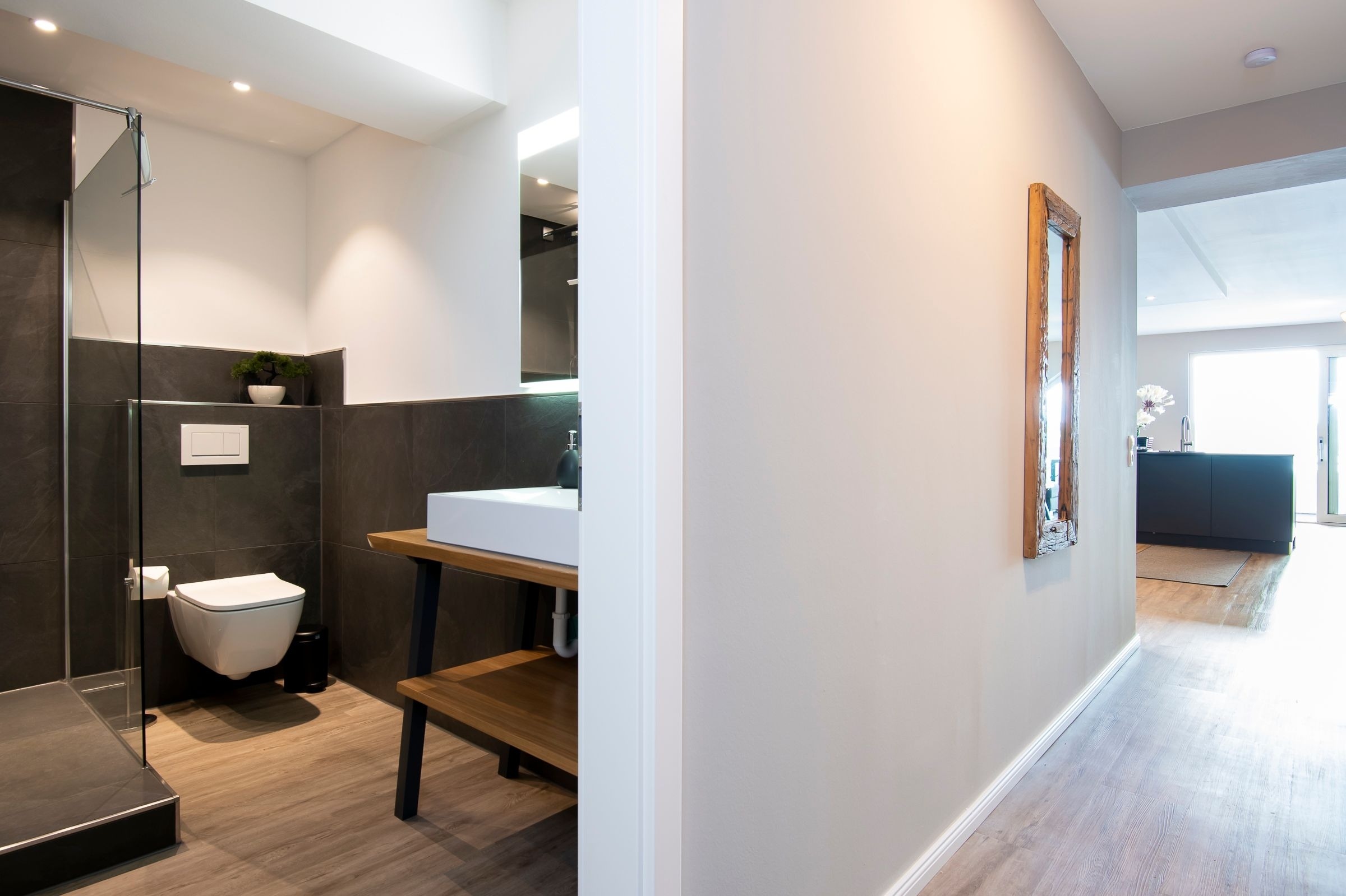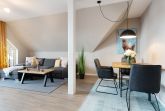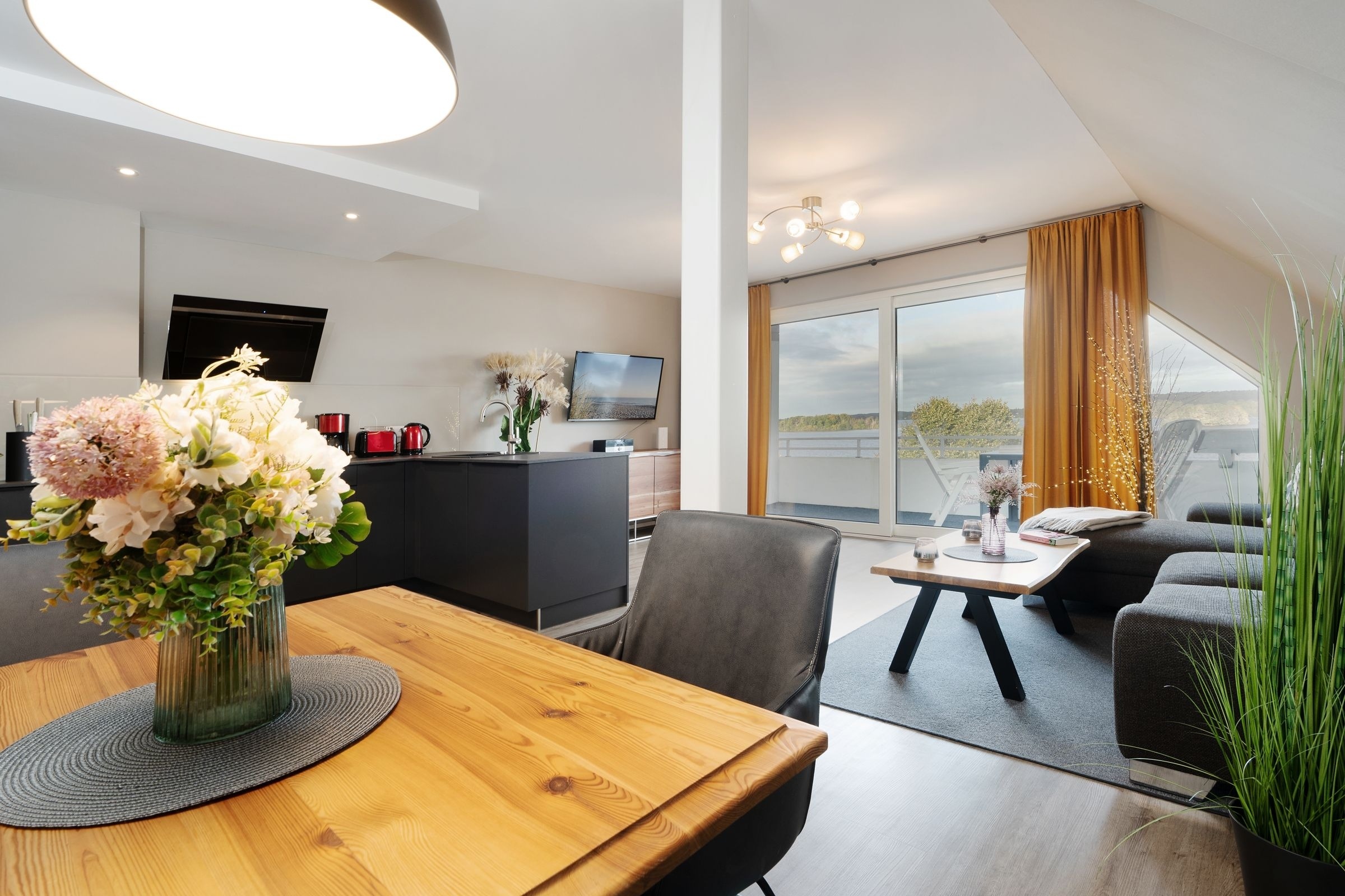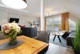 Der modern gestaltete Wohnbereich mit angrenzender, offener Küchenzeile ist stets lichtdurchflutet. Auf dem gemütlichen Sofa können Sie entspannte Abende vor dem großen Flachbildfernseher verbringen oder abends ein gutes Buch lesen. Vorhänge dienen hier bei Bedarf als Licht- und Sichtschutz. Die gut ausgestattete Küchenzeile verfügt z. B. über einen Induktionsherd, einen Backofen in komfortabler Arbeitshöhe, einen Kühlschrank sowie über einen Geschirrspüler. Für den Kaffeegenuss am Morgen oder am Nachmittag steht Ihnen neben einer Kaffee-Filtermaschine ebenfalls eine Kaffeemaschine von Senseo zur Verfügung. Gegenüber von der Küchenzeile befindet sich ein Esstisch mit 3 Sitzgelegenheiten. Der gesamte Wohnraum besticht durch eine hochwertige Einrichtung, die Sie begeistern wird. Vom Flur aus gelangen Sie in das separate Schlafzimmer mit einem Boxspring-Doppelbett (180x200 cm), einem Kleiderschrank sowie einem weiteren Flachbildfernseher. Zur Nacht lässt sich das Schlafzimmer durch Vorhänge und Plissees abdunkeln, sodass Sie im Urlaub Ihren wohlverdienten Schlaf erhalten. Ebenfalls vom Flur aus erreichen Sie das stilvoll eingerichtete Badezimmer mit Fenster. Neben einem WC, einem Waschbecken und einer Dusche gibt es ausreichend Stauraum und Ablagemöglichkeiten für Ihre Badutensilien und Handtücher. Einen traumhaften Ausblick auf den Dieksee bietet Ihnen der überdachte, möblierte Balkon. Der WLAN-Anschluss ist für Sie inklusive.